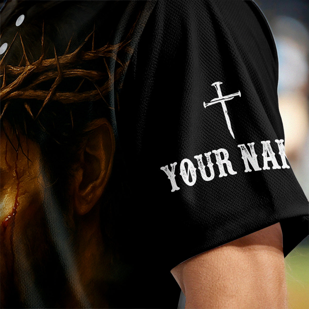 Proclaim your salvation with the “1 Cross 3 Nails 4 Given” Custom Baseball Jersey — a bold and meaningful reminder of the price Christ paid for our freedom. With striking imagery of Jesus wearing the crown of thorns and a weathered cross built from nails, this design is both deeply moving and powerfully symbolic.