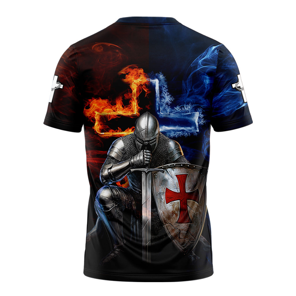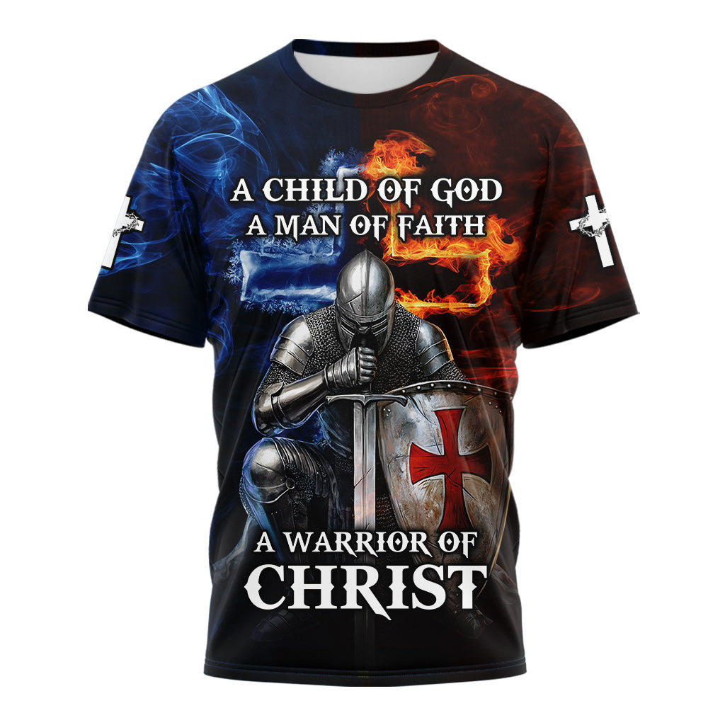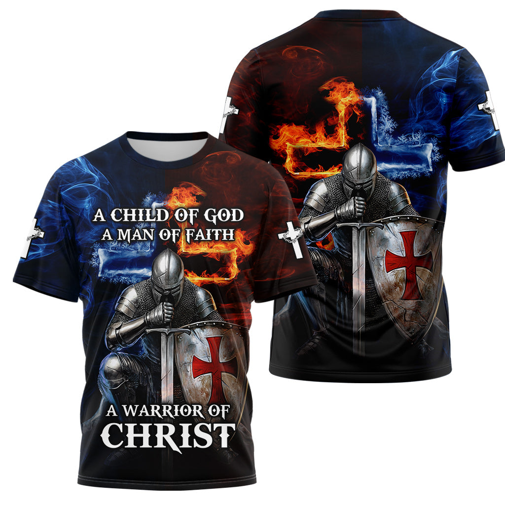 Stand strong in your identity with the A Child of God, A Man of Faith T-shirt — a bold and empowering expression of faith, purpose, and spiritual strength. Featuring a kneeling armored knight with a cross-emblazoned shield, surrounded by fiery red and cool blue smoke, this striking design declares: “A Child of God. A Man of Faith. A Warrior of Christ.”