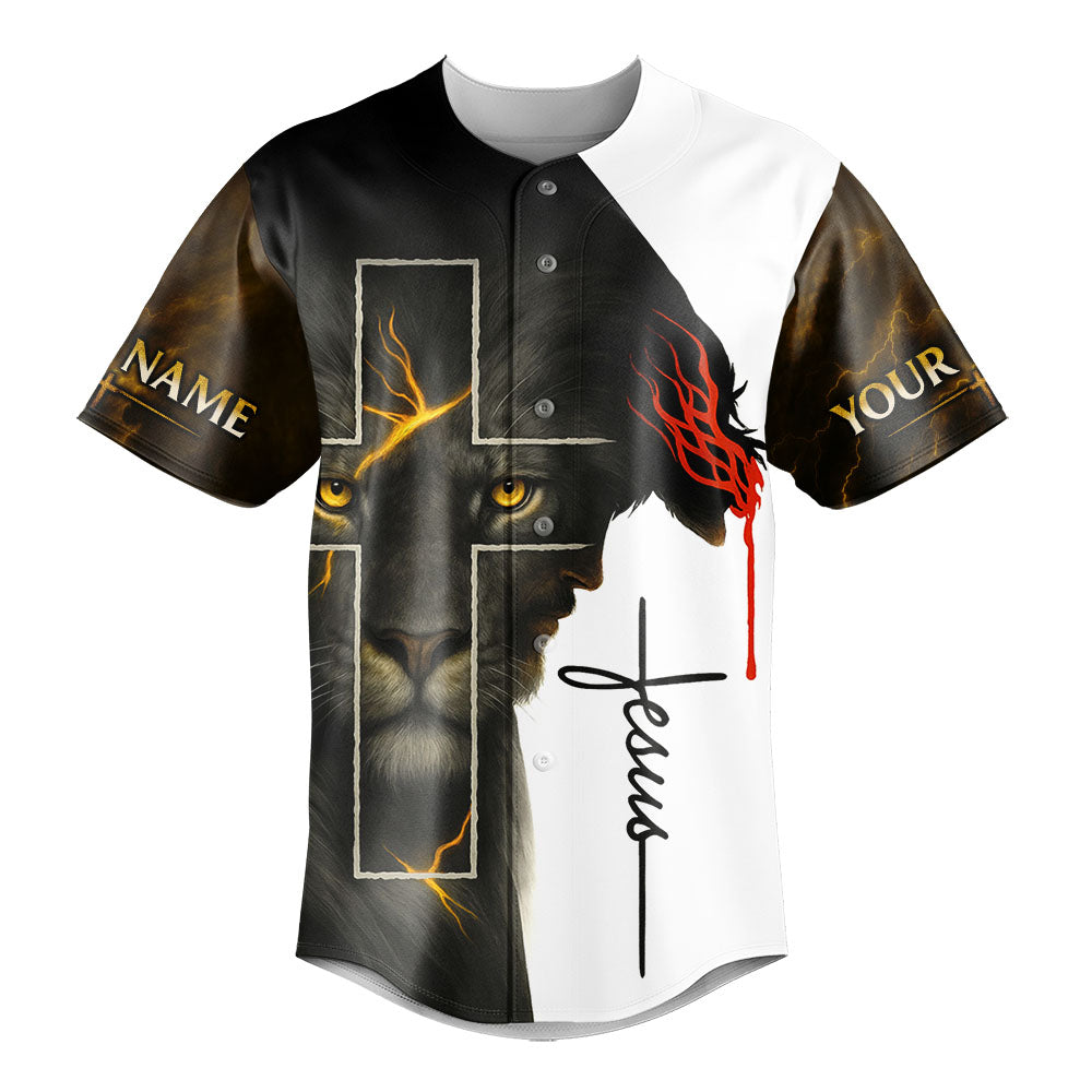 The front features a dramatic split design with a fierce lion, a glowing cross, and the name Jesus crowned in thorns and dripping in red — a striking visual of sacrifice and strength. The back showcases a golden crown entwined with thorns above the powerful phrase: