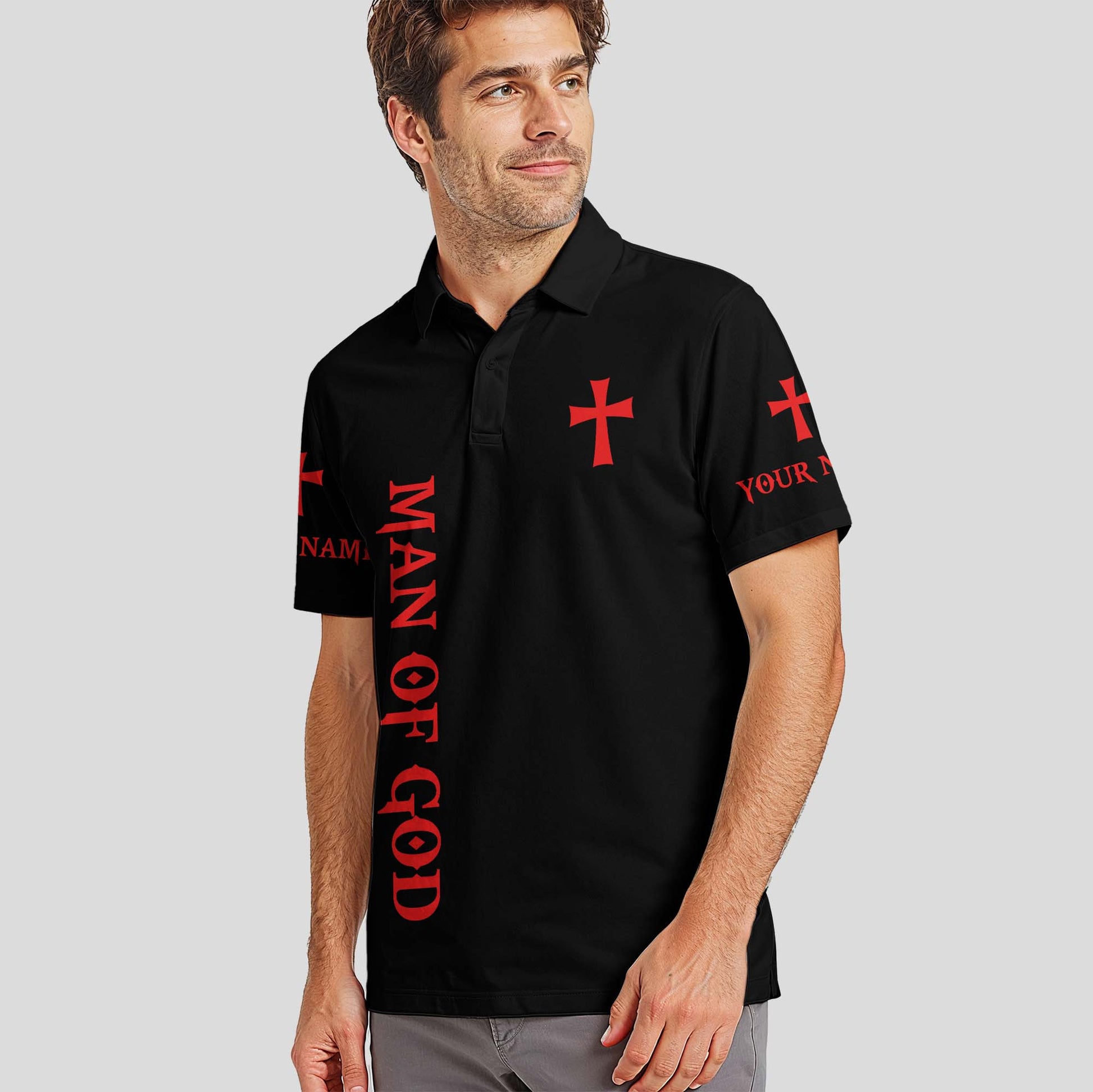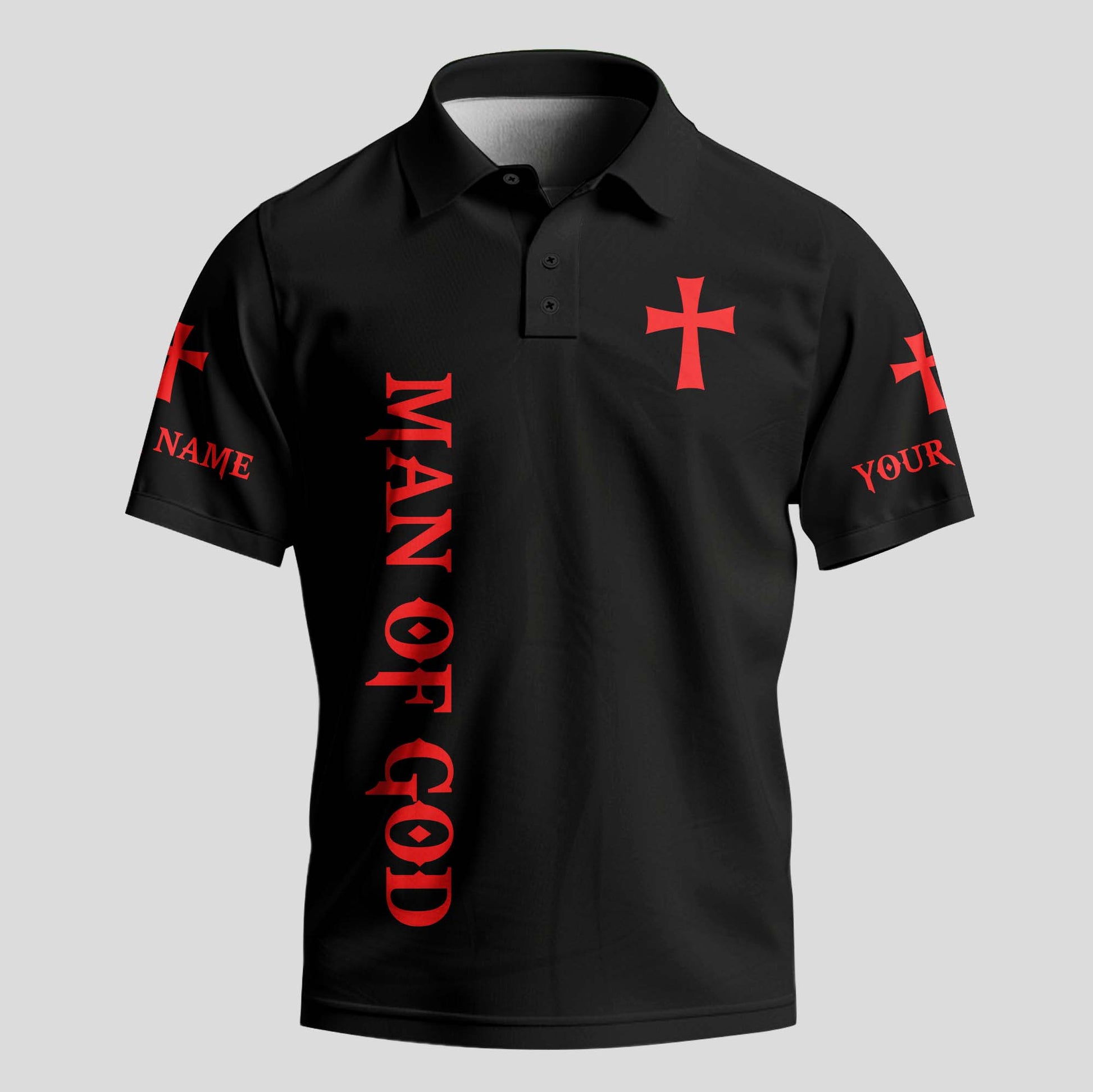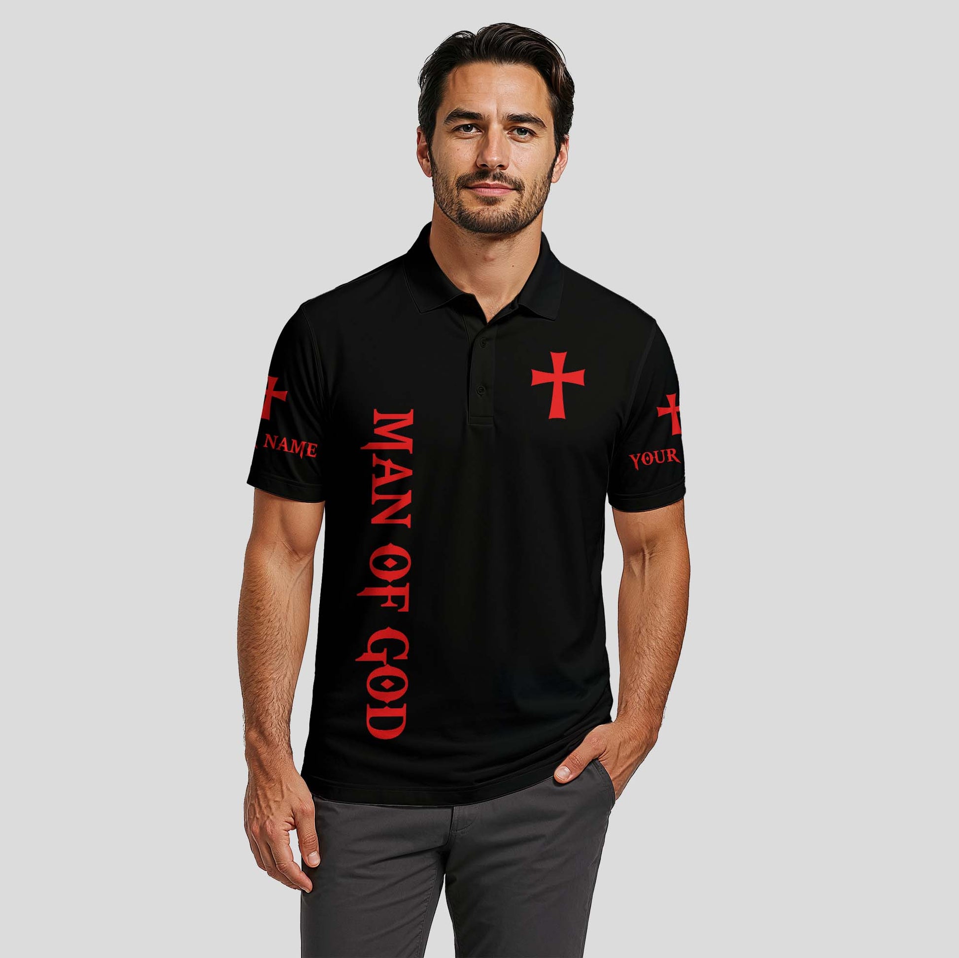 The front features bold red crosses and the title “Man of God”, printed vertically as a declaration of who you are. The back showcases a powerful image of a crowned knight raising his sword in triumph with the message: