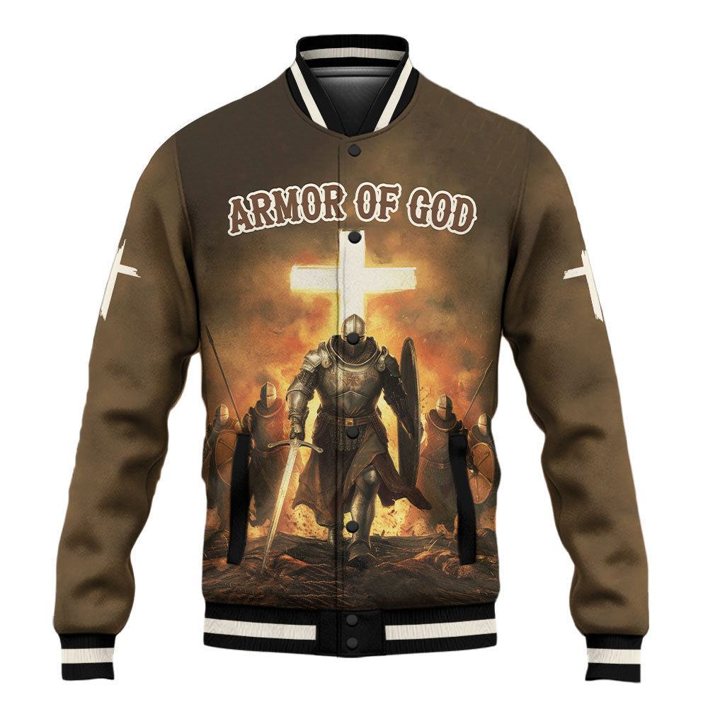 Stand firm in your faith with the Armor of God Warrior Baseball Jacket, a bold expression of spiritual strength and devotion. This powerful design features mighty warriors in full armor, walking through fire with their swords drawn, symbolizing unwavering faith and readiness for battle. The "Armor of God" inscription serves as a reminder to stand strong in righteousness and truth.
