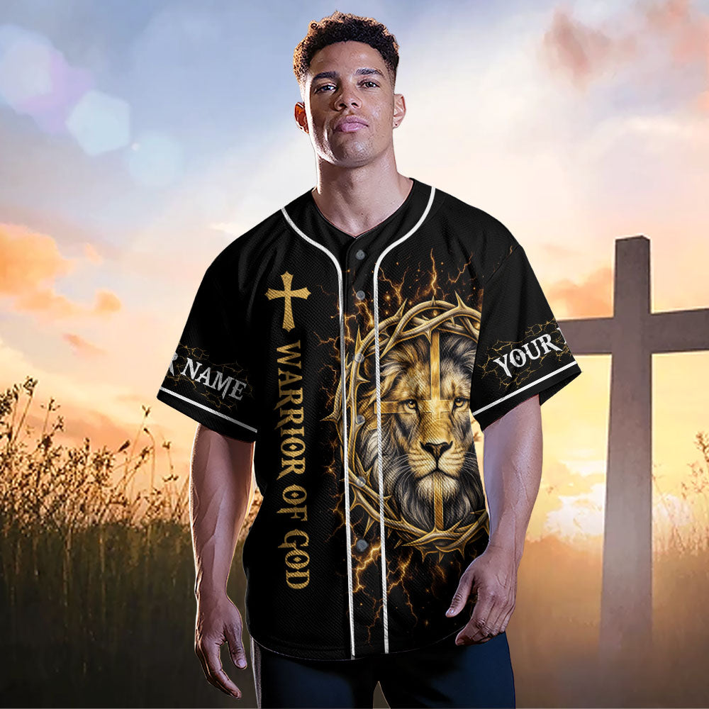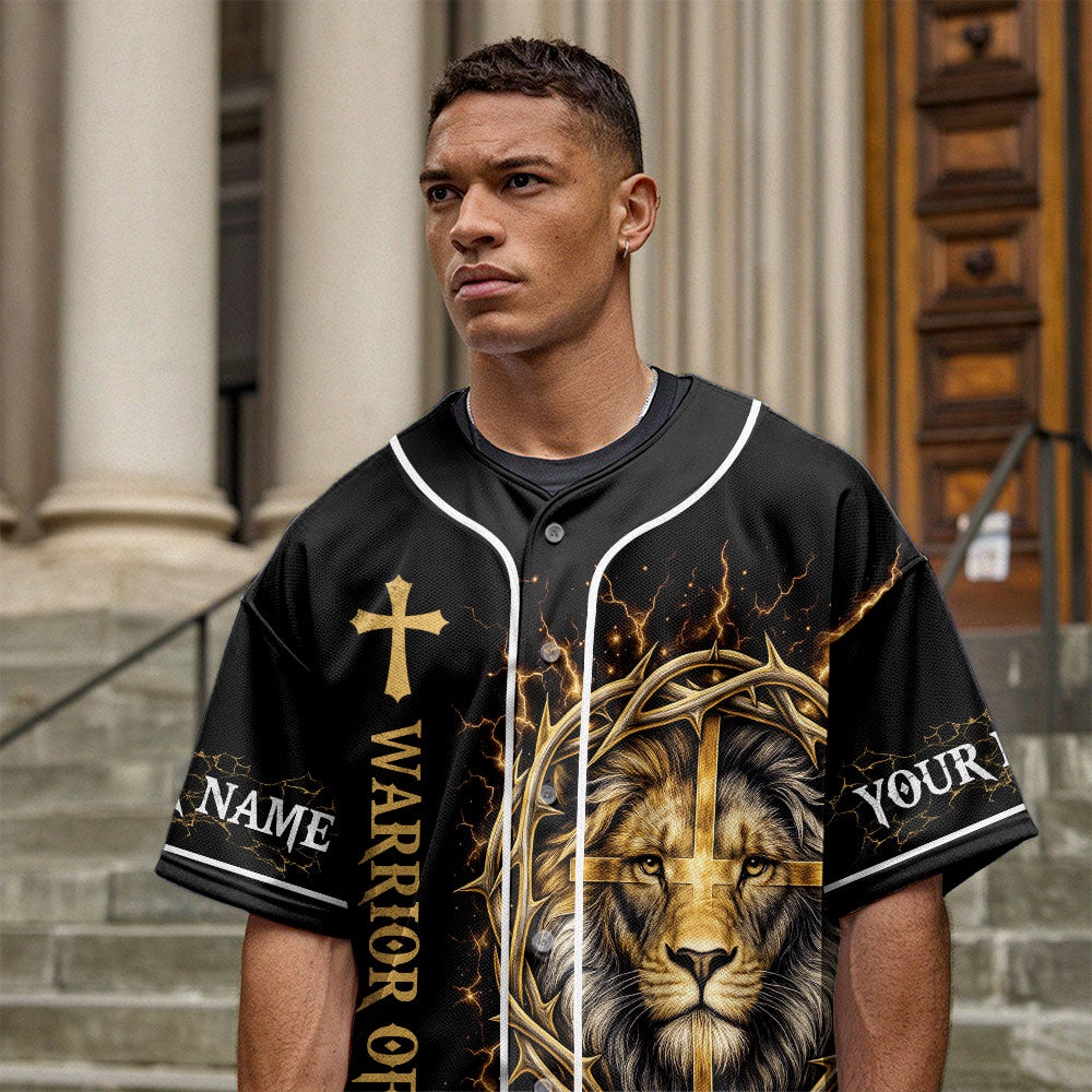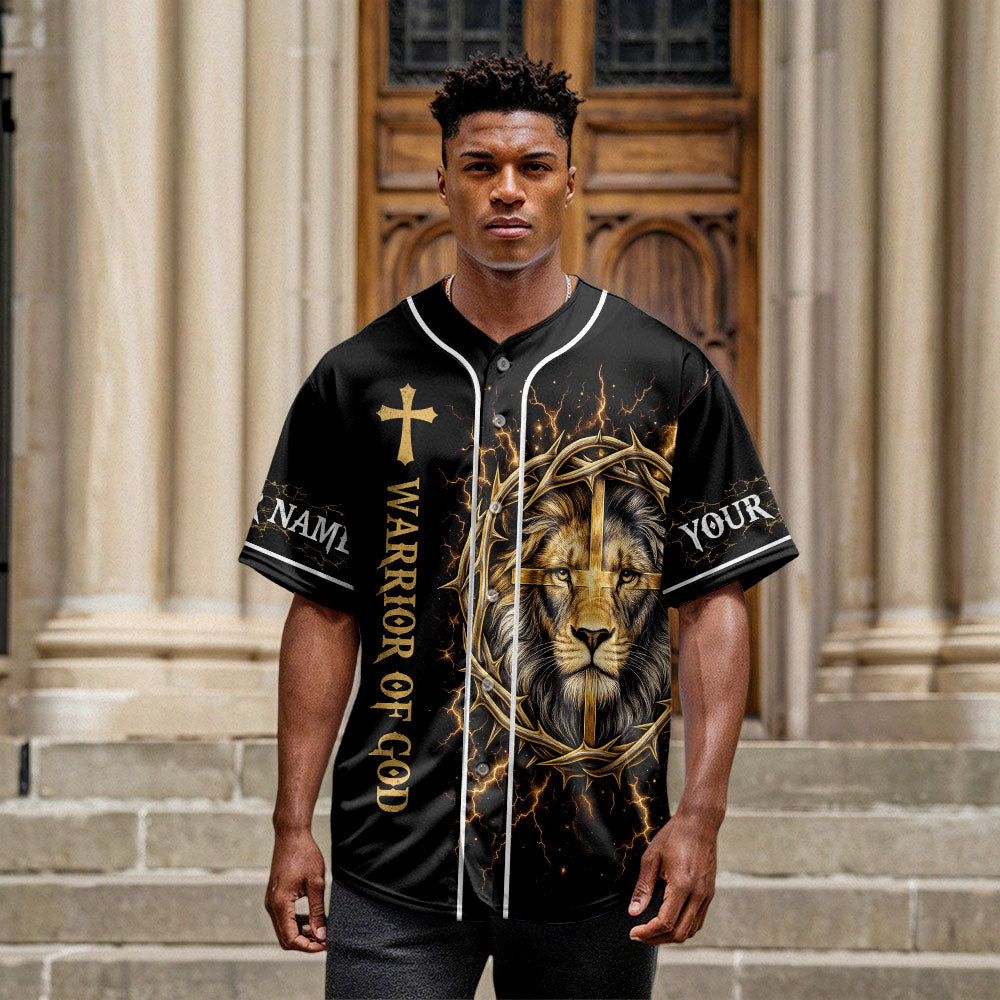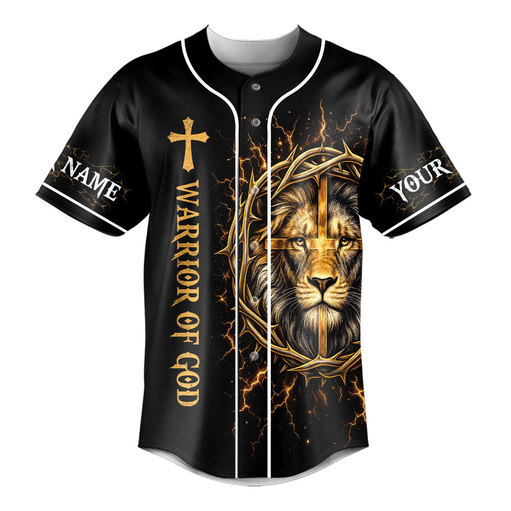 The front shows the lion and cross artwork alongside the phrase “Warrior of God.” Customize both sleeves with your name to make it uniquely yours.
