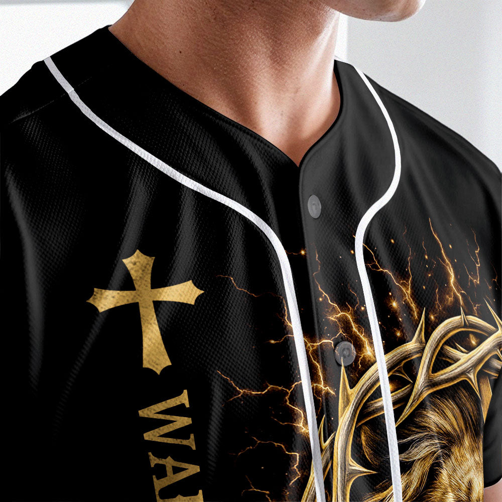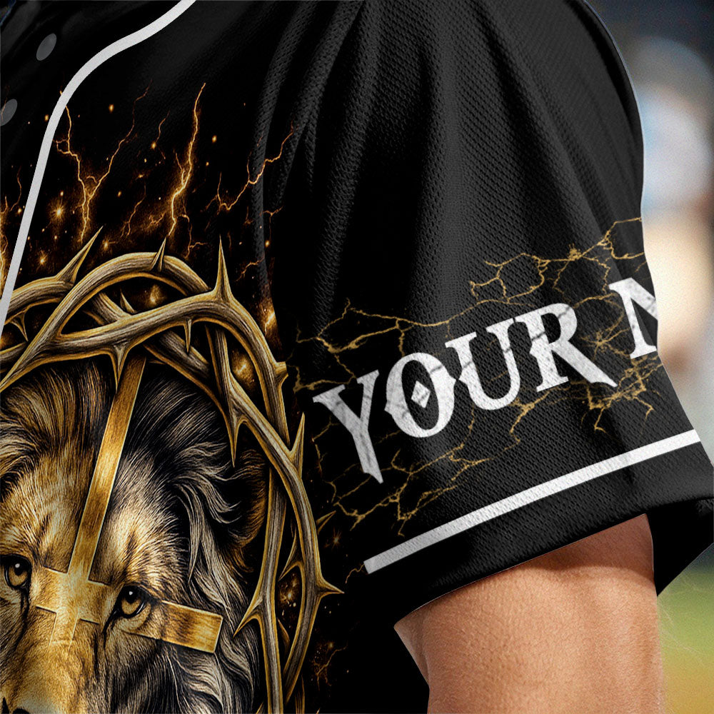 This bold design features the majestic face of a lion crowned with thorns, lightning crackling around him, and a golden cross at the center — representing the strength and sovereignty of God. The back delivers the powerful verse:
