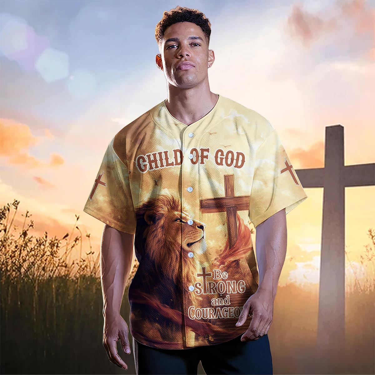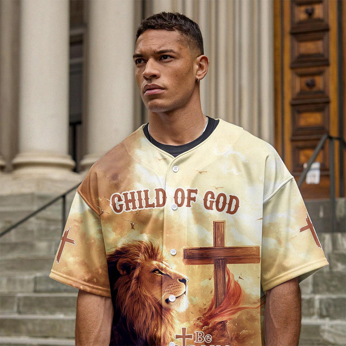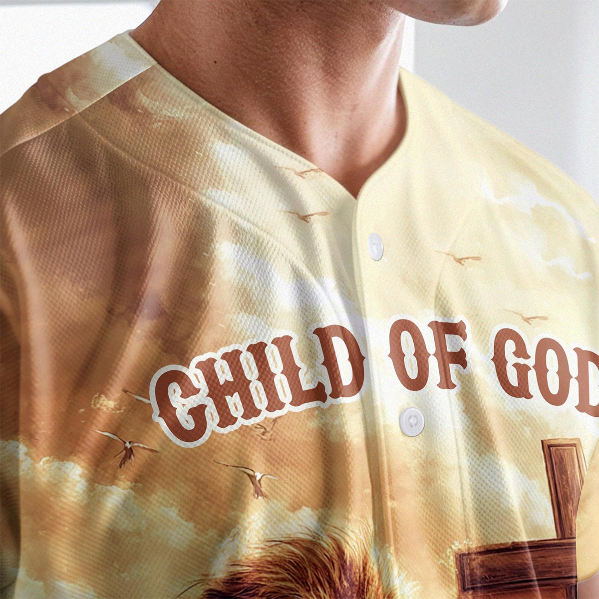 Embrace your faith boldly with this stunning "Child of God" Baseball Jersey—a powerful symbol of strength, devotion, and unwavering belief. Featuring a breathtaking design of a majestic lion gazing toward the cross, set against a golden sky of divine light, this jersey is a testament to courage and spiritual resilience.