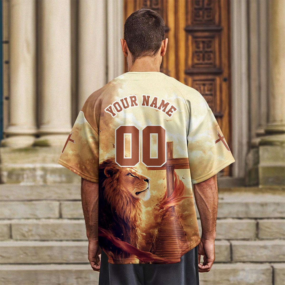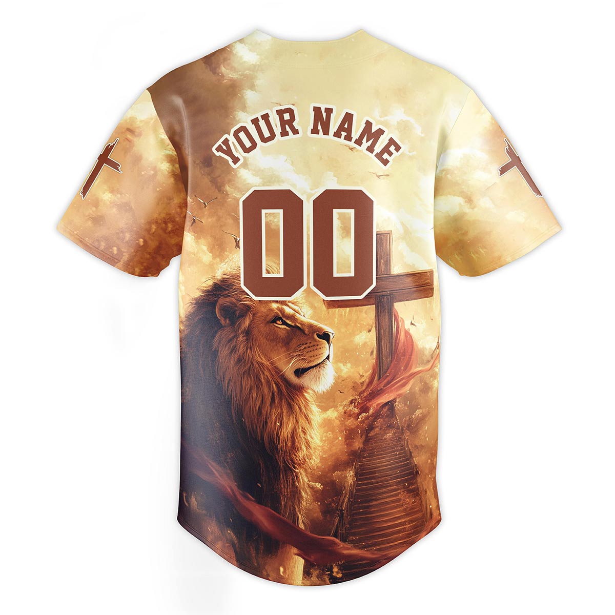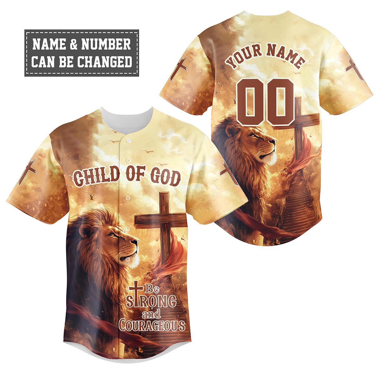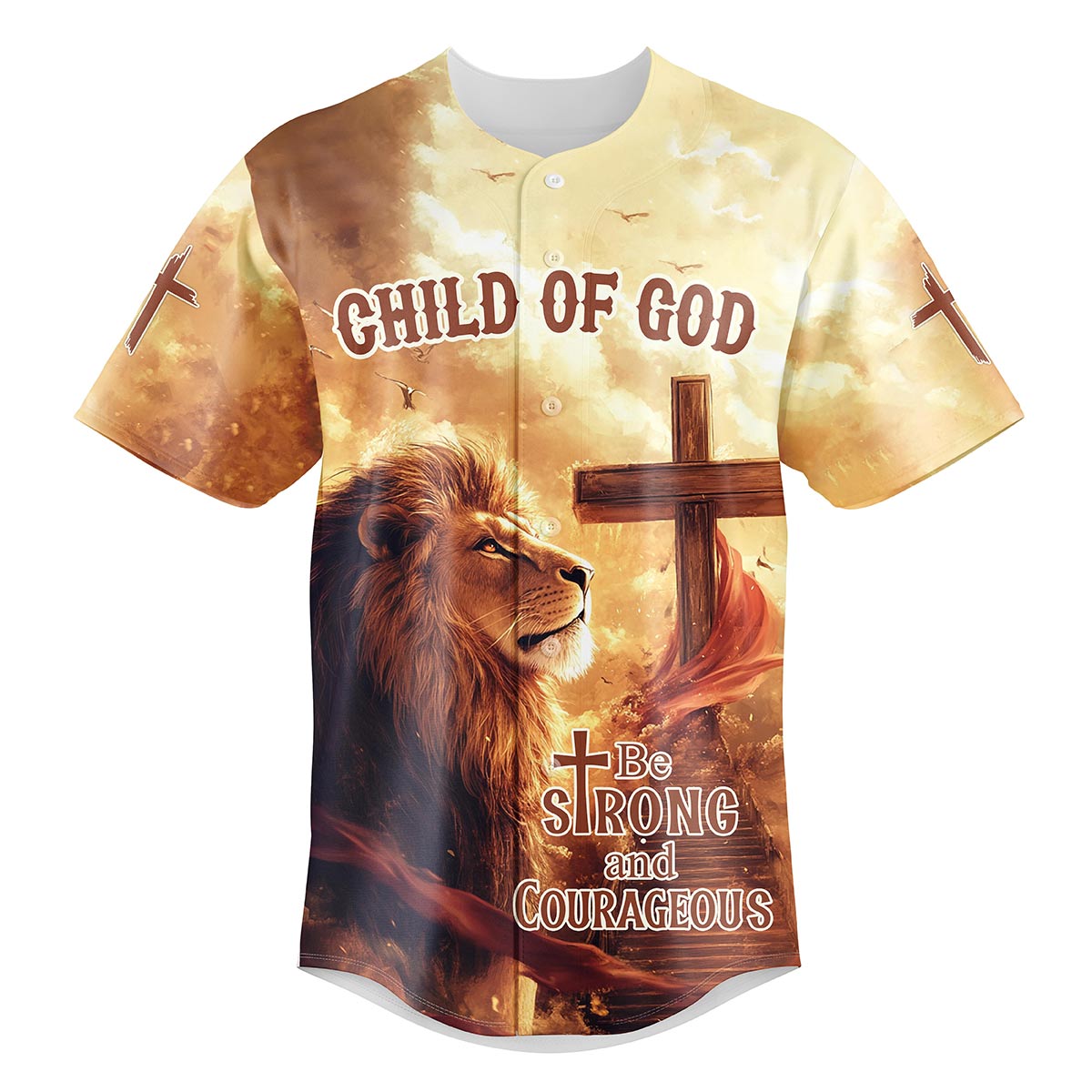 Embrace your faith boldly with this stunning "Child of God" Baseball Jersey—a powerful symbol of strength, devotion, and unwavering belief. Featuring a breathtaking design of a majestic lion gazing toward the cross, set against a golden sky of divine light, this jersey is a testament to courage and spiritual resilience.
