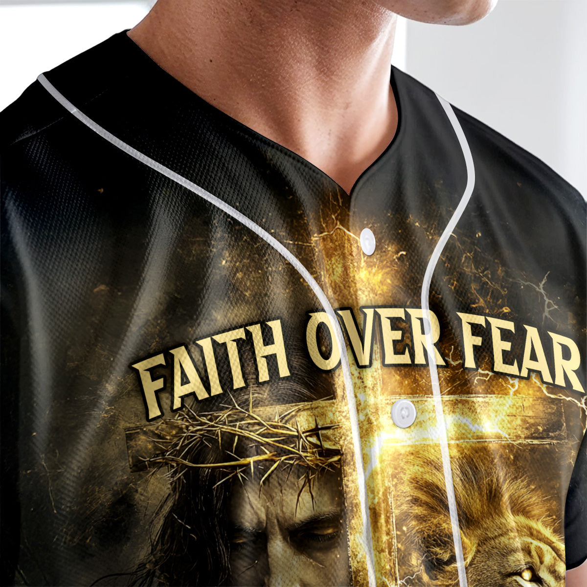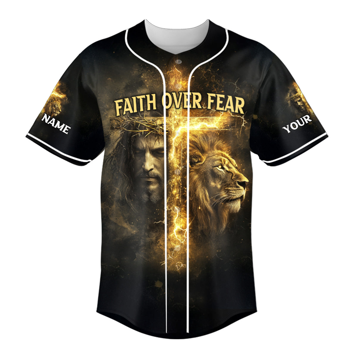 This impactful design features the face of Jesus crowned with thorns, a roaring lion, and a glowing cross surrounded by golden lightning. The front boldly proclaims “Faith Over Fear,” while the back displays the life-giving promise: