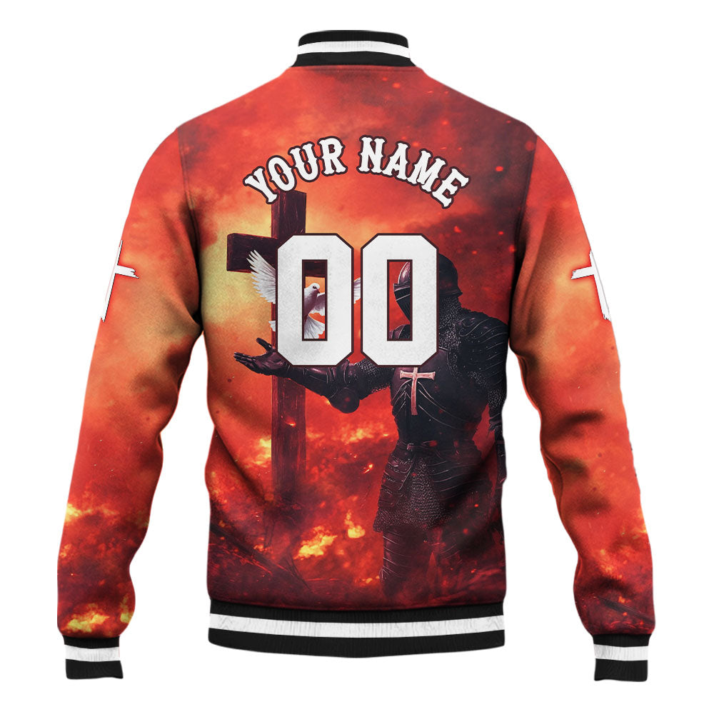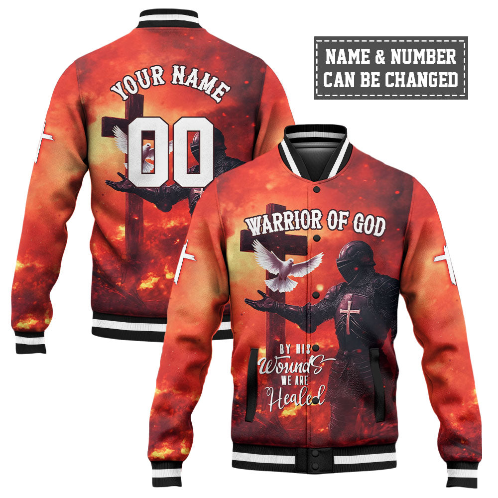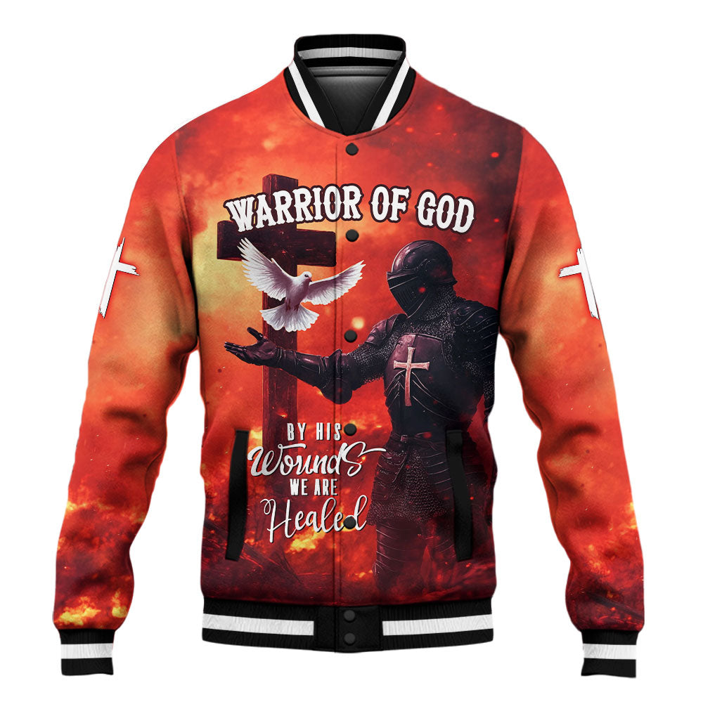 Step into battle with the By His Wounds We Are Healed Baseball Jacket, a bold statement of faith and strength. Featuring an epic design of a warrior knight standing before the cross, with a dove symbolizing peace and redemption, this jacket is a powerful reminder of divine protection. The "By His Wounds, We Are Healed" message reflects the sacrifice of Christ and the victory of faith.