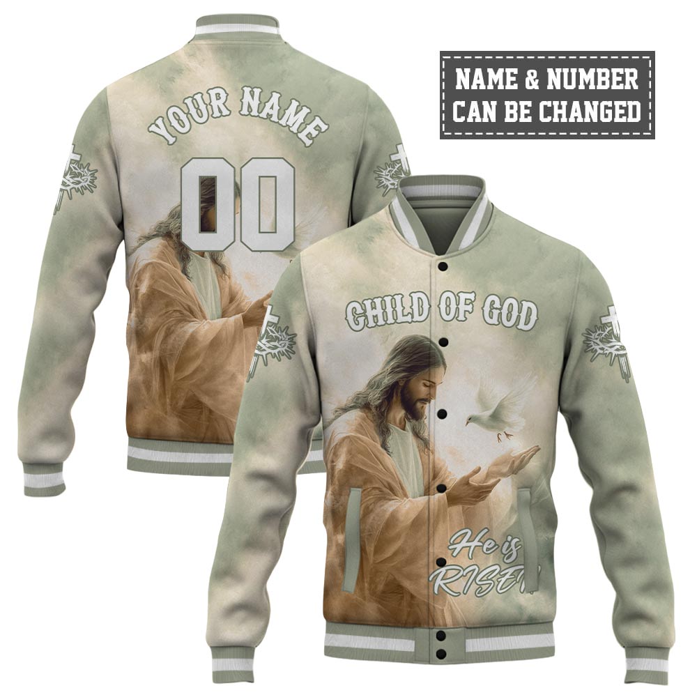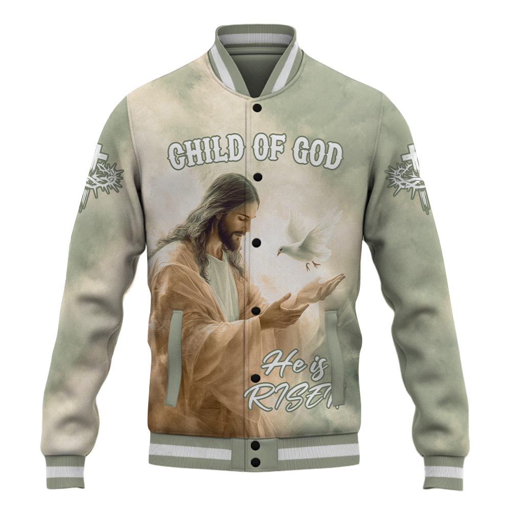 Wrap yourself in comfort and faith with the Child of God Baseball Jacket — a soft yet powerful tribute to Christ’s resurrection and your identity in Him. Featuring gentle tones and beautiful artwork of Jesus releasing a dove, this jacket radiates peace, hope, and new life. With the message “He is Risen” on the front and “Child of God” above, it's a daily reminder of God’s love and your place in His kingdom.