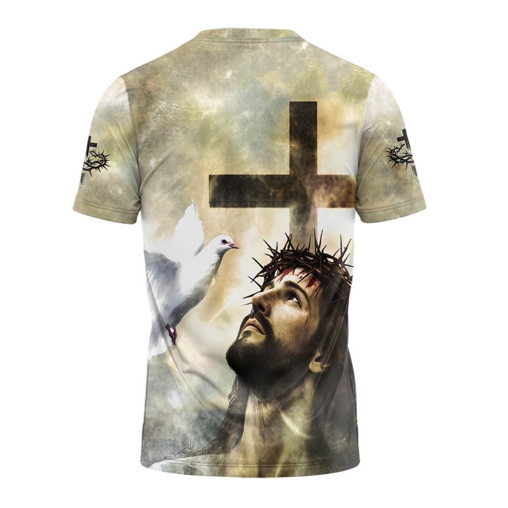 Embrace your faith with the Child of God – Divine Grace Jesus T-shirt. This inspiring design features a powerful image of Jesus Christ wearing the crown of thorns, looking upward in divine grace, accompanied by a dove symbolizing the Holy Spirit. The cross in the background reinforces the message of salvation and unwavering faith.