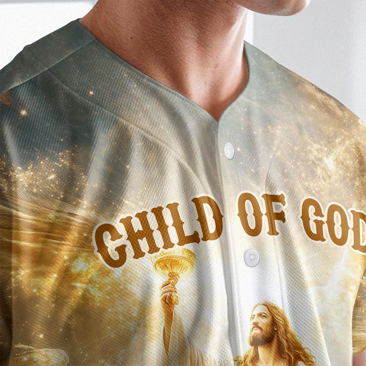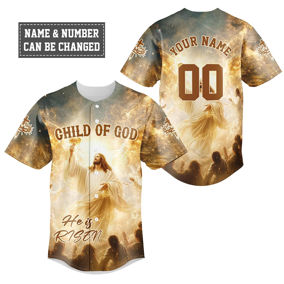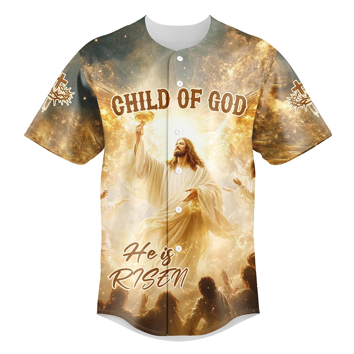 Celebrate the glory of the risen Savior with the "Child of God He is Risen" baseball jersey. This breathtaking design features the triumphant image of Jesus in radiant glory, holding the chalice, as He rises in power and majesty. The message "Child of God" across the chest proudly affirms your identity as a beloved member of God's family, while "He is Risen" below emphasizes the victory of the resurrection.