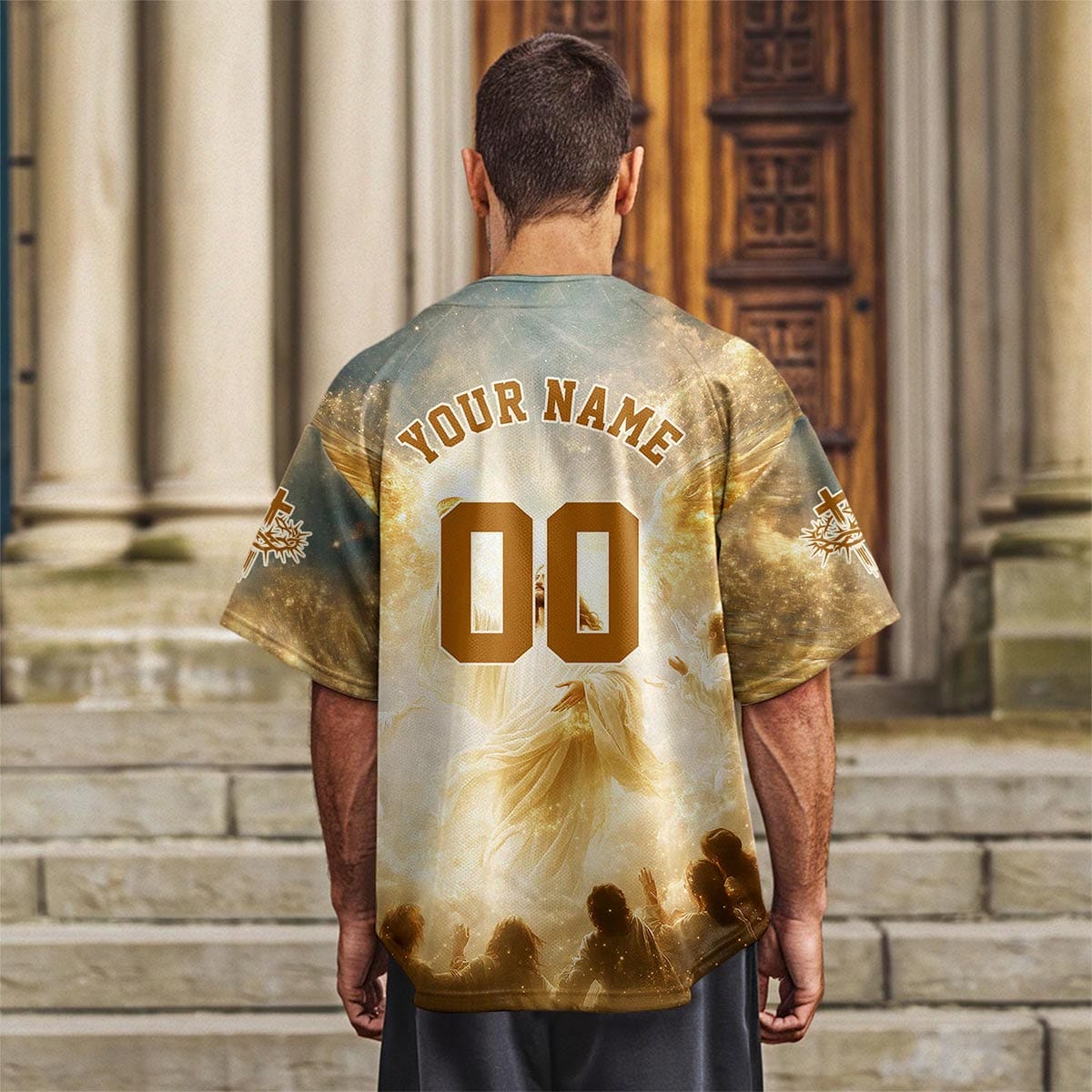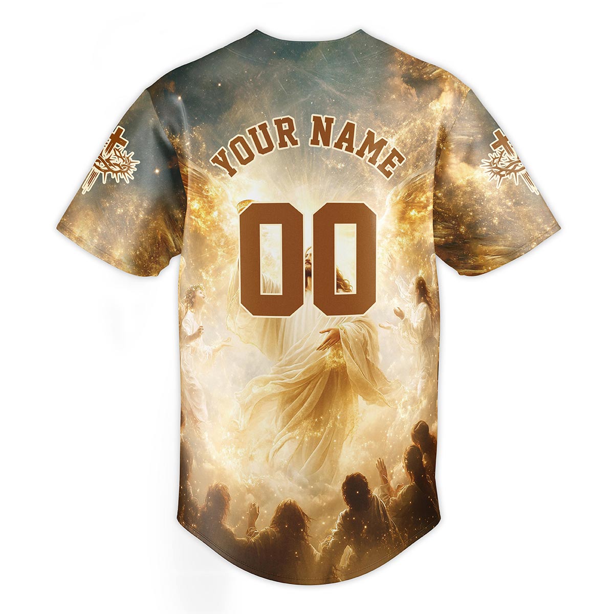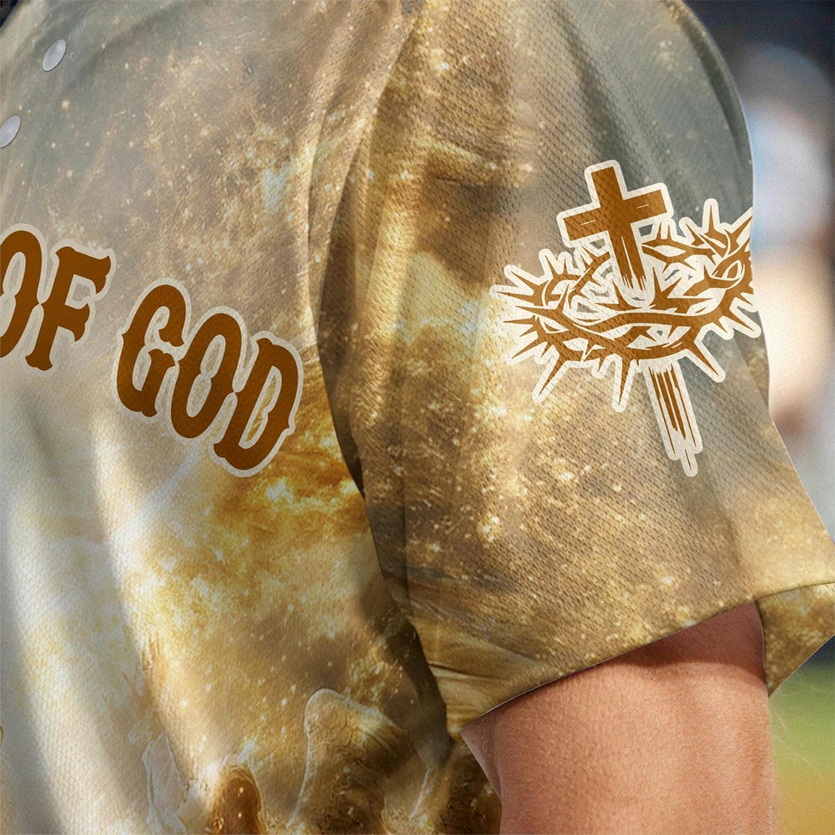 Celebrate the glory of the risen Savior with the "Child of God He is Risen" baseball jersey. This breathtaking design features the triumphant image of Jesus in radiant glory, holding the chalice, as He rises in power and majesty. The message "Child of God" across the chest proudly affirms your identity as a beloved member of God's family, while "He is Risen" below emphasizes the victory of the resurrection.