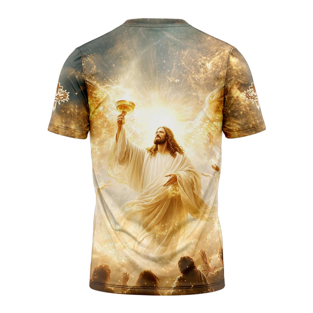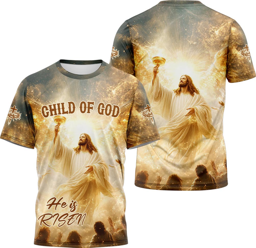 Celebrate the glory of the resurrection with the Child Of God He is Risen T-shirt. This stunning design showcases Jesus ascending in divine radiance, symbolizing victory over death and eternal salvation. With a glowing golden background, this shirt is a powerful reminder of faith, renewal, and hope.