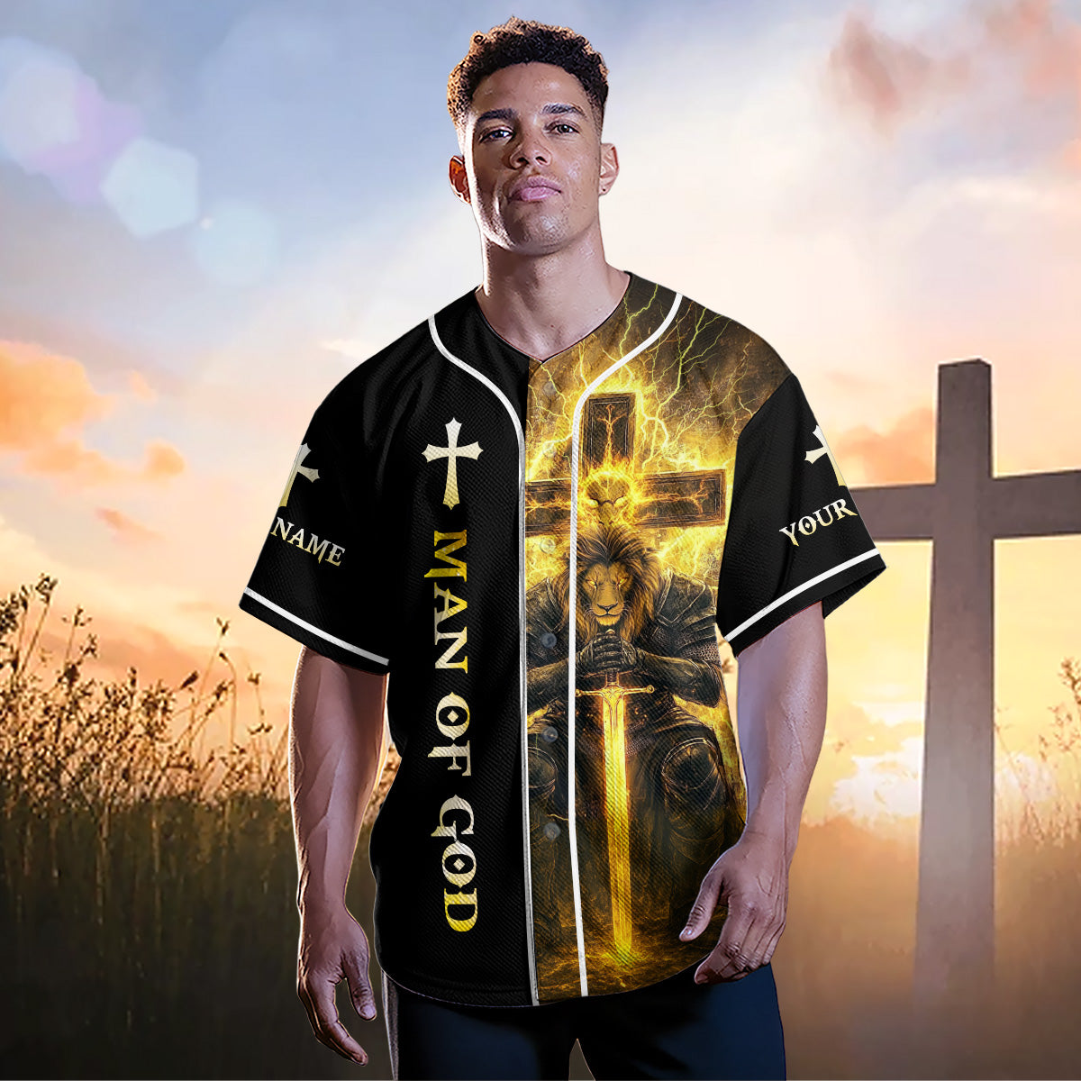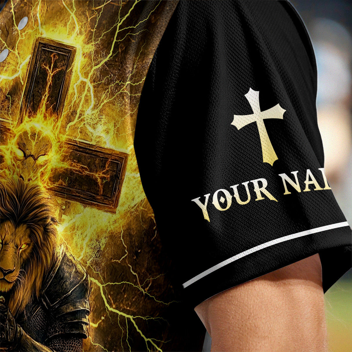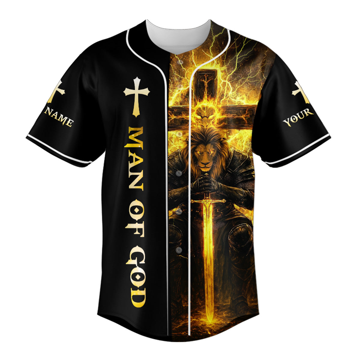 This dramatic design features a warrior kneeling before a blazing cross, backed by a mighty lion symbolizing courage and divine strength. Surging lightning and golden flames surround the imagery, representing the unstoppable power of Jesus' victory over darkness.