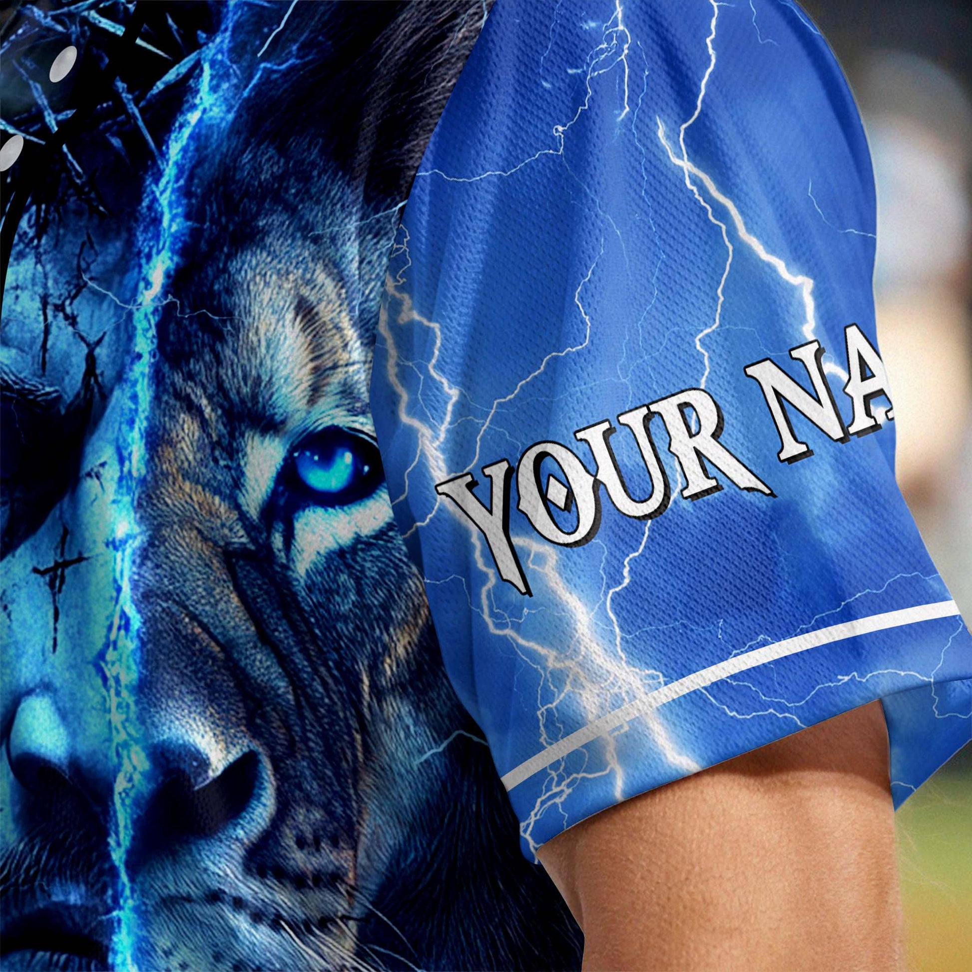 Featuring a striking half-lion, half-human face glowing with blue lightning, this design symbolizes divine focus, strength, and fearless faith. The back declares:
