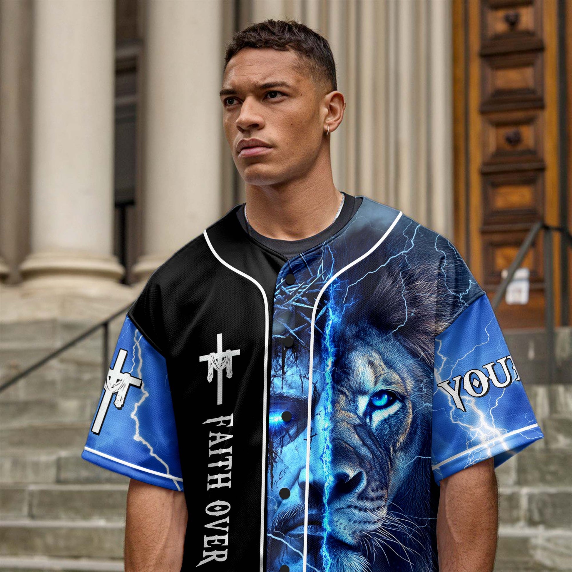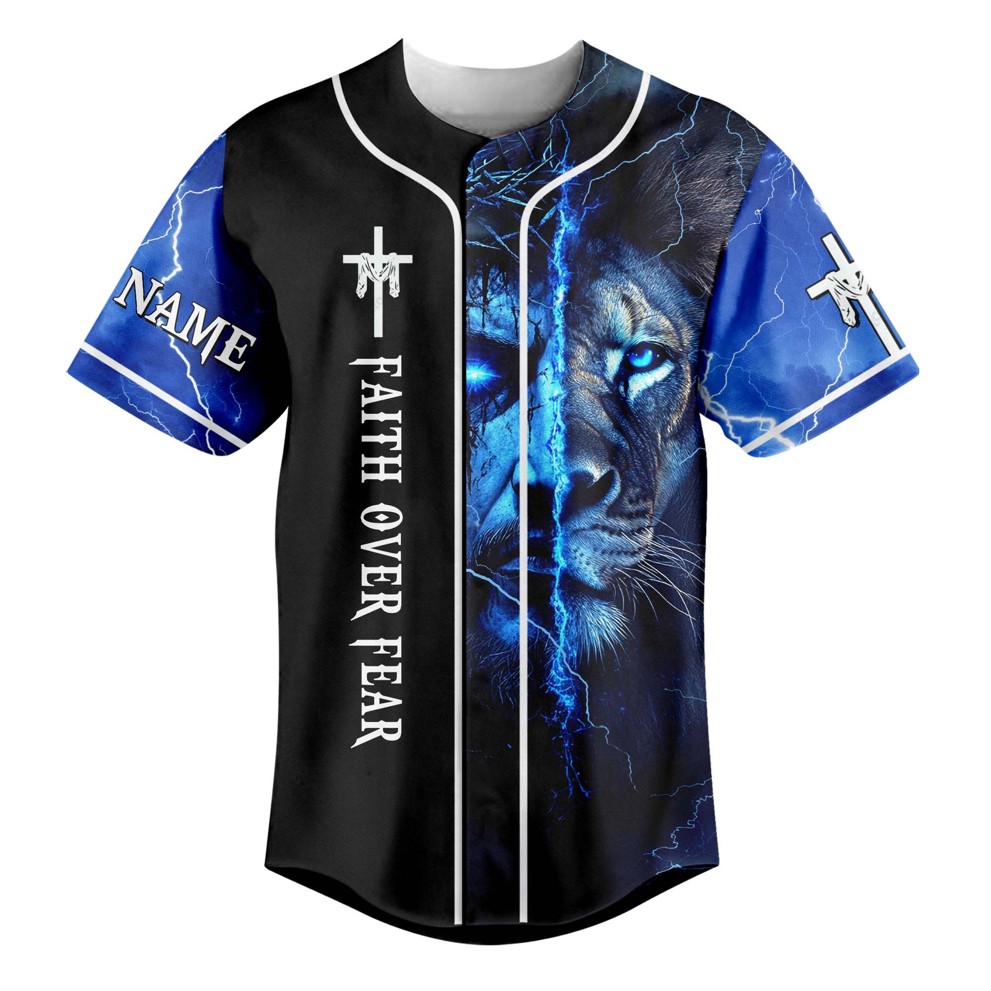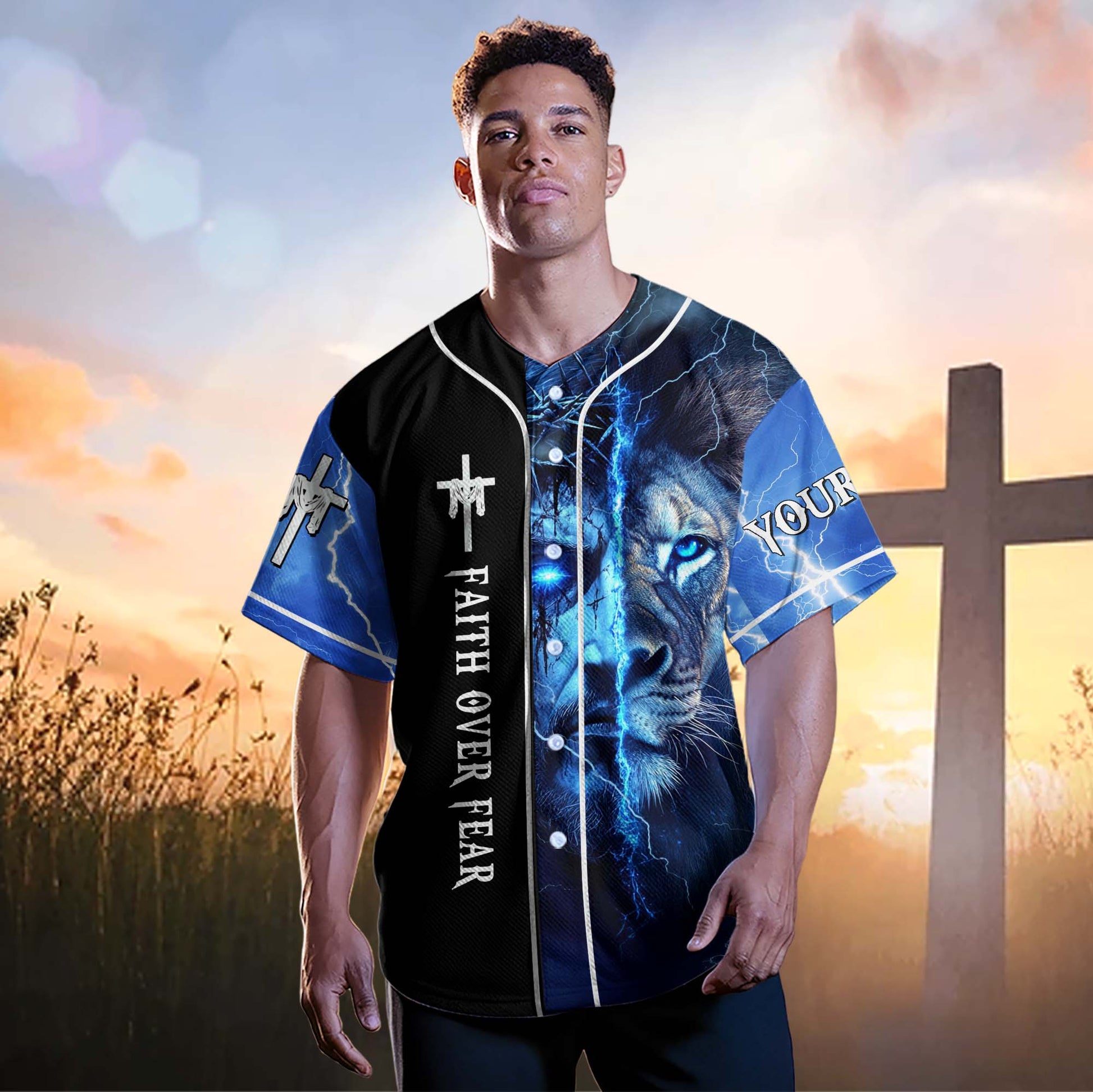 The front displays “Faith Over Fear” alongside a fierce lion, with both sleeves customizable with your name — making it a personal testament of faith-driven purpose.