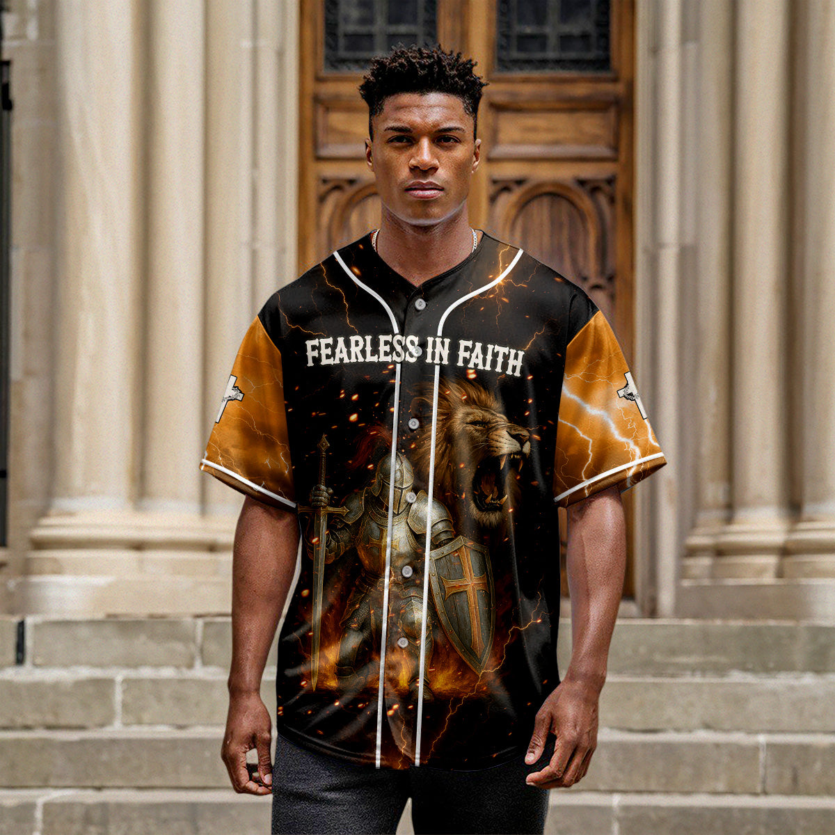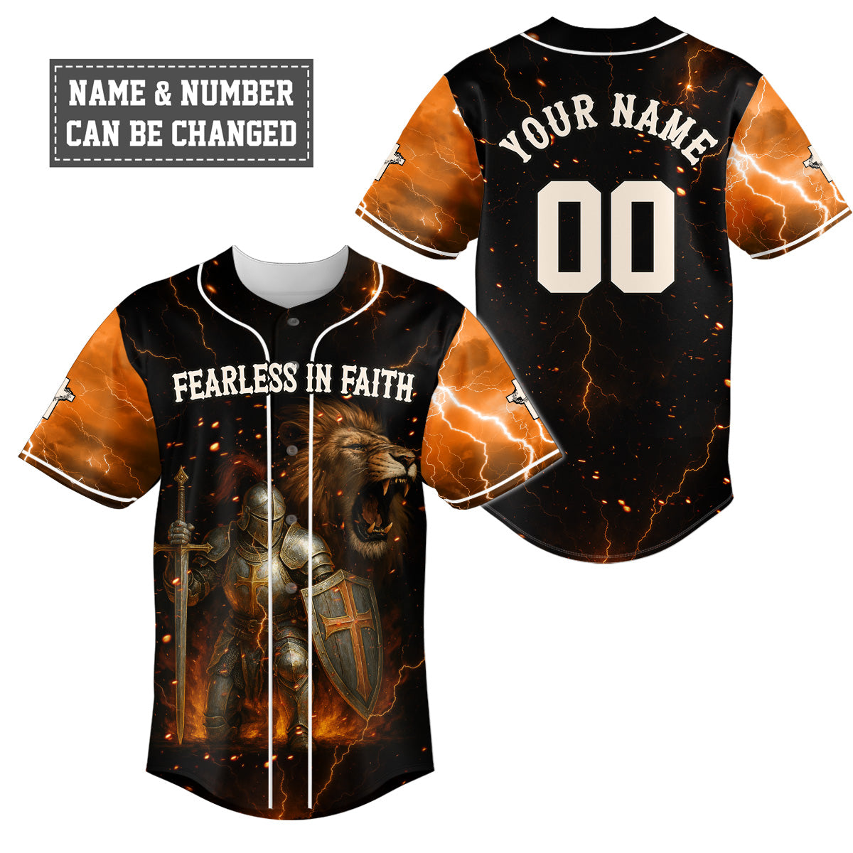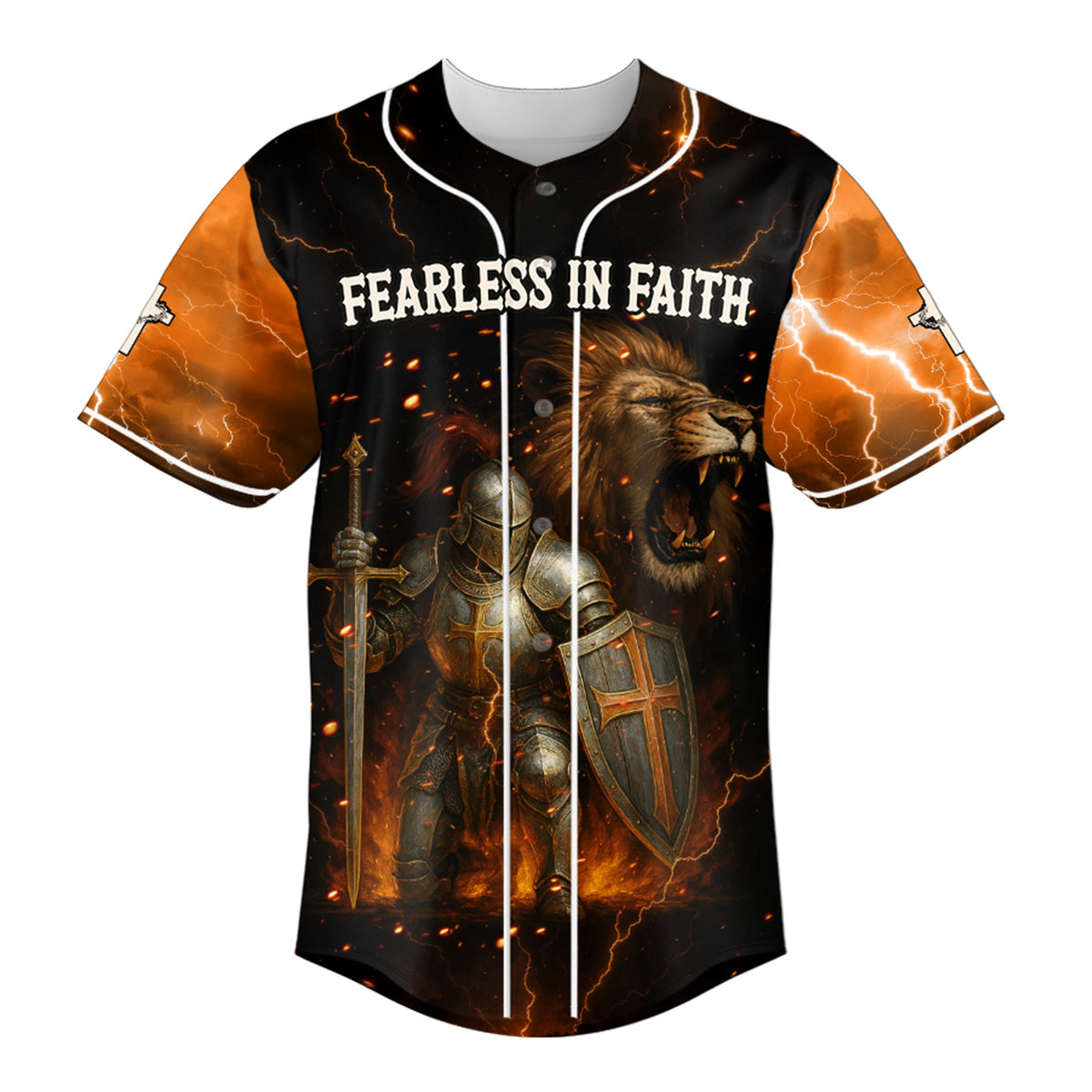 This powerful design features a fully armored knight standing ready for spiritual war, with a roaring lion behind him symbolizing strength, courage, and the presence of the Lion of Judah. Surrounded by blazing fire and lightning, the words “FEARLESS IN FAITH” across the chest remind you that when God is with you, fear has no place.
