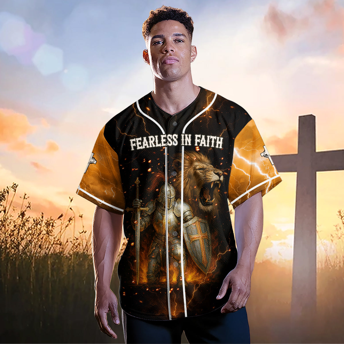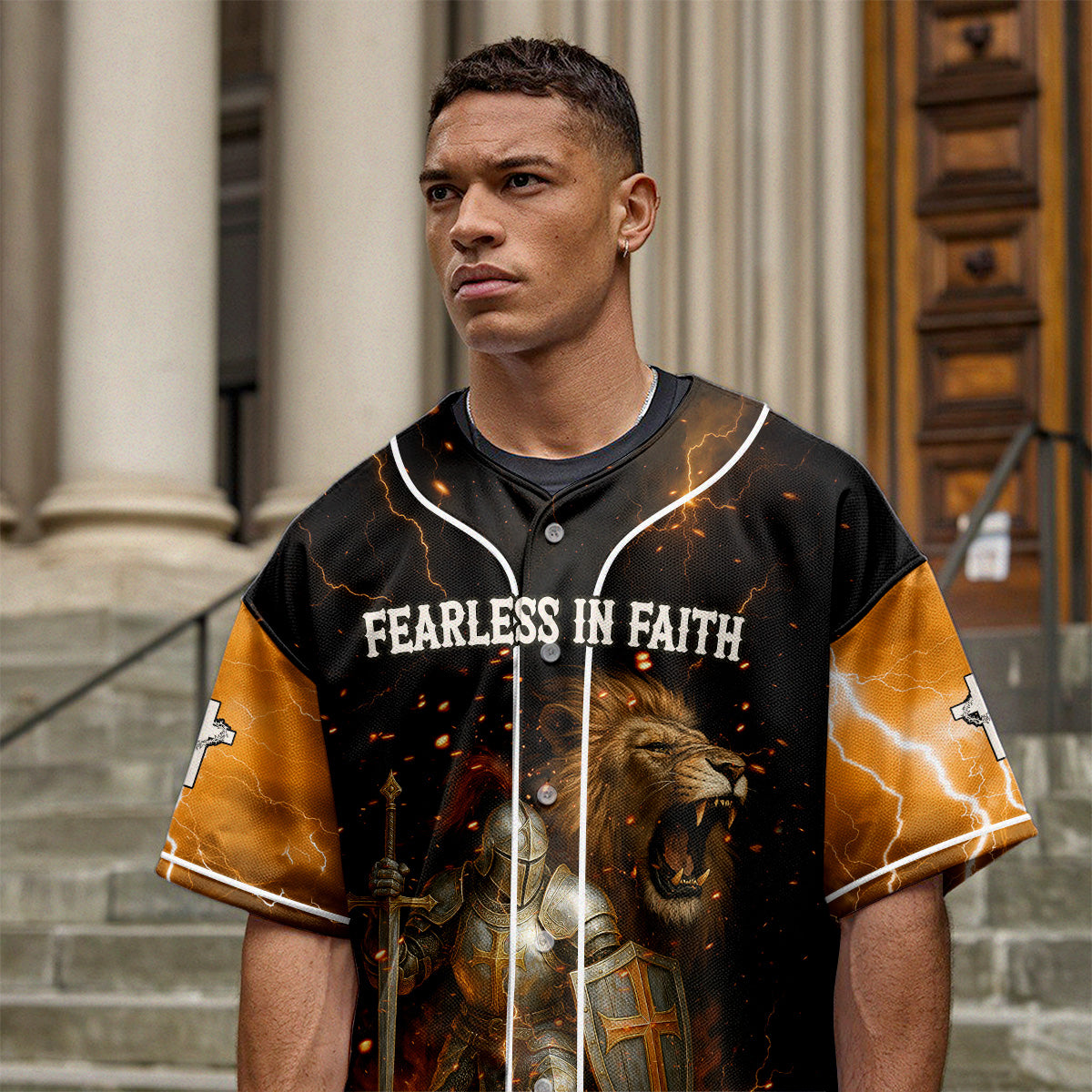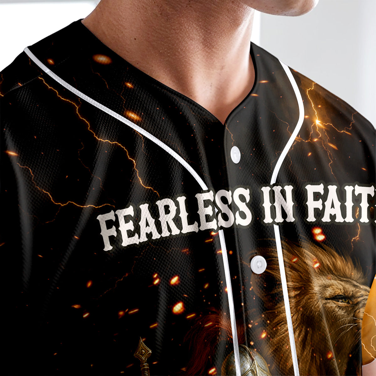 This powerful design features a fully armored knight standing ready for spiritual war, with a roaring lion behind him symbolizing strength, courage, and the presence of the Lion of Judah. Surrounded by blazing fire and lightning, the words “FEARLESS IN FAITH” across the chest remind you that when God is with you, fear has no place.