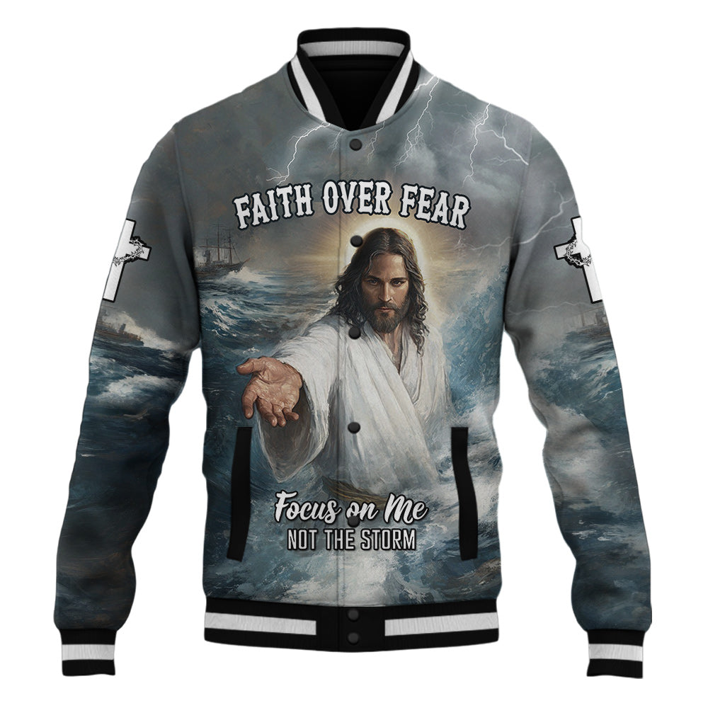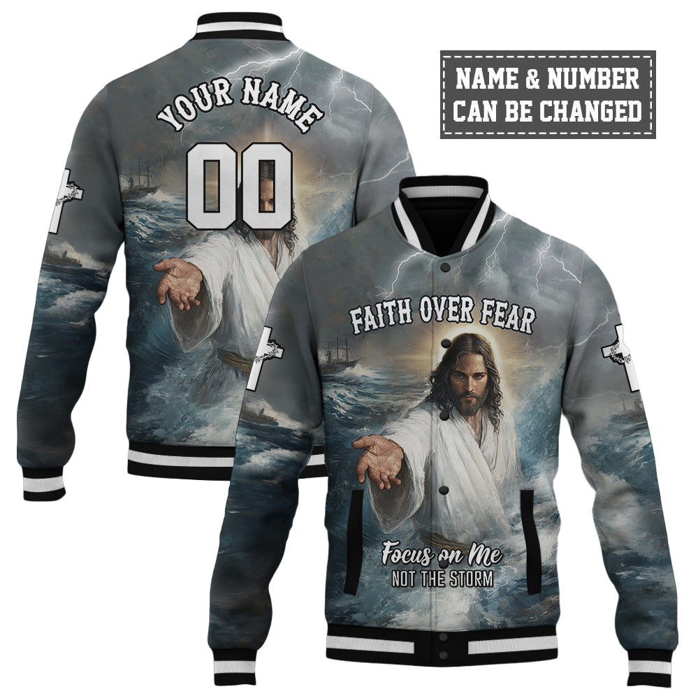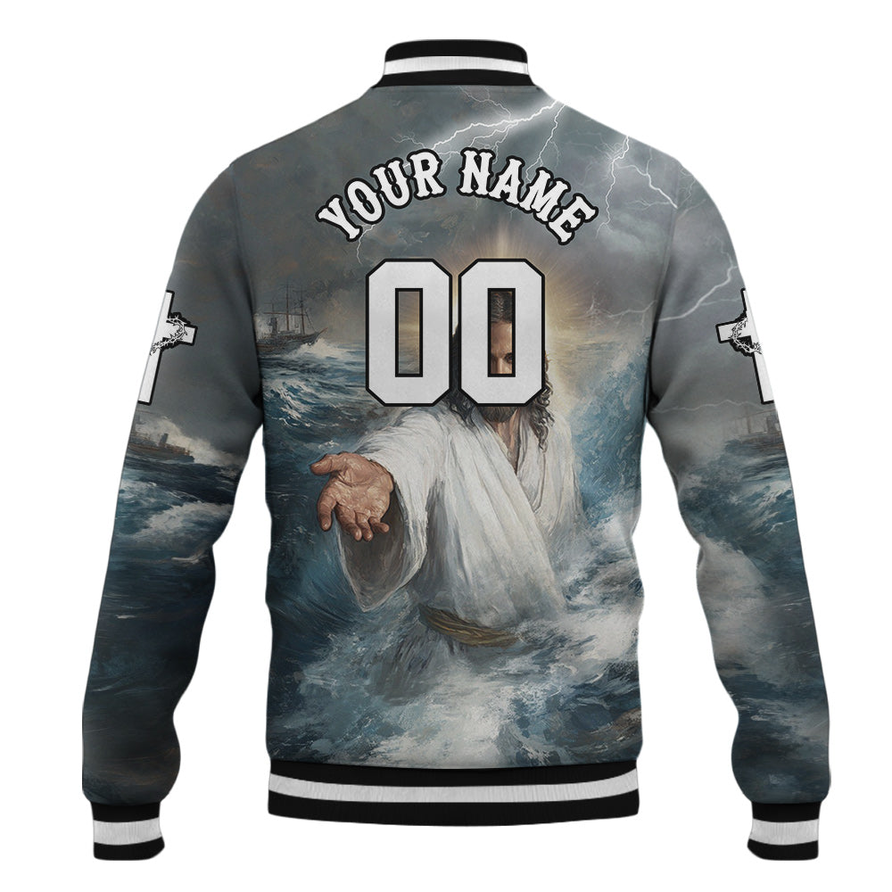 Stay strong in your faith with the Focus on me not the Storm Baseball Jacket, a powerful symbol of trust in Jesus through life's storms. Featuring a breathtaking design of Christ reaching out His hand amidst crashing waves and lightning, this jacket serves as a reminder to focus on Him, not the storm. The "Faith Over Fear - Focus on Me, Not the Storm" message encourages unwavering belief even in the toughest times.