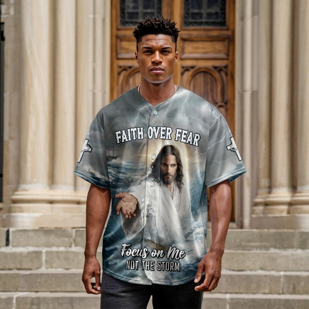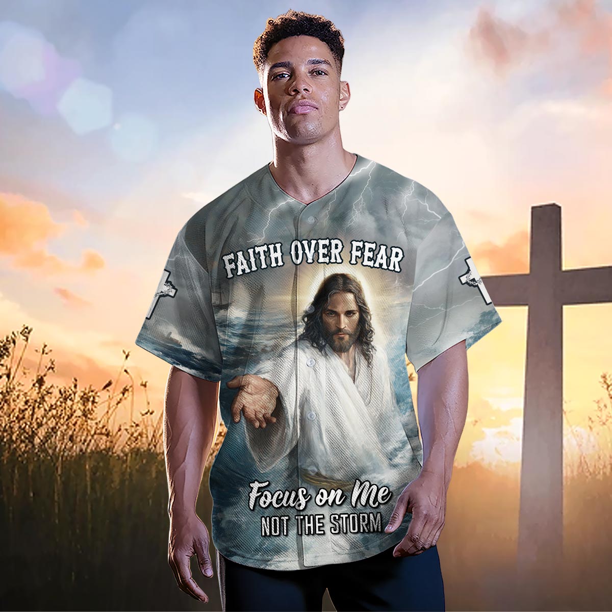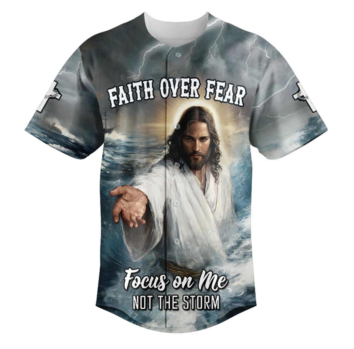 Embrace the strength of faith with this powerful and inspiring baseball jersey. Featuring a breathtaking design of Jesus walking on the stormy seas, this jersey captures the message of unwavering faith amidst life's challenges. The bold slogan "Faith Over Fear" proudly graces the top, while "Focus on Me, Not the Storm" serves as a reminder to keep your eyes on Him during tough times. Made for those who stand firm in their beliefs, this jersey is the perfect blend of spiritual inspiration and sportswear. Whether you’re cheering from the stands or reflecting in solitude, this design is a reminder to keep faith first.