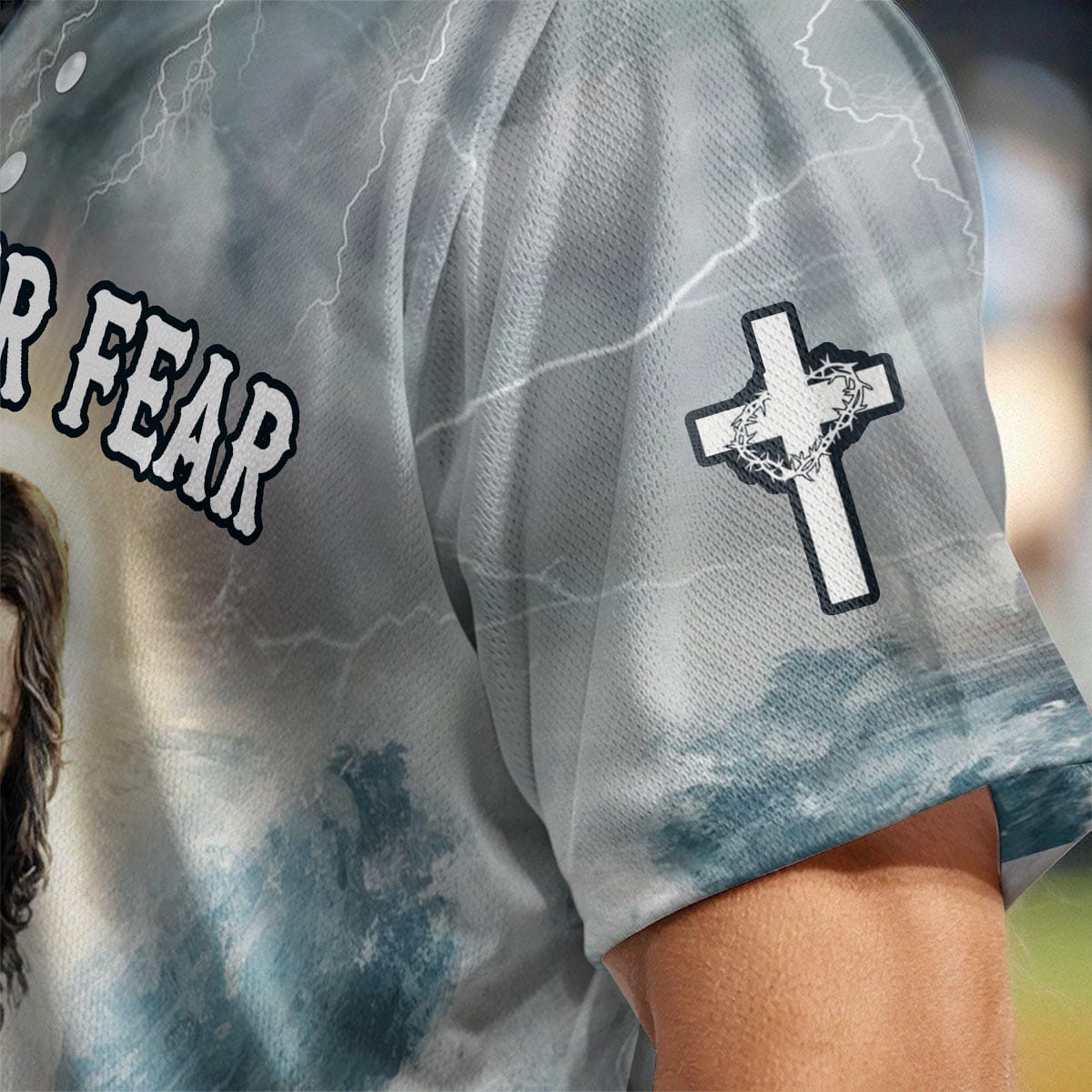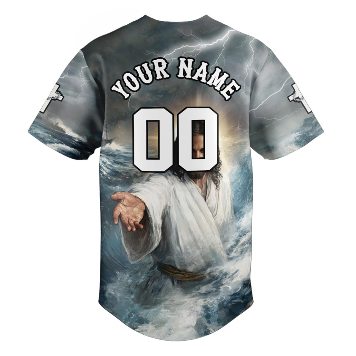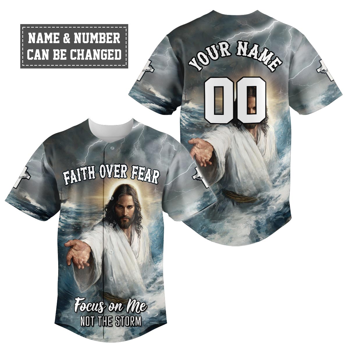 Embrace the strength of faith with this powerful and inspiring baseball jersey. Featuring a breathtaking design of Jesus walking on the stormy seas, this jersey captures the message of unwavering faith amidst life's challenges. The bold slogan "Faith Over Fear" proudly graces the top, while "Focus on Me, Not the Storm" serves as a reminder to keep your eyes on Him during tough times. Made for those who stand firm in their beliefs, this jersey is the perfect blend of spiritual inspiration and sportswear. Whether you’re cheering from the stands or reflecting in solitude, this design is a reminder to keep faith first.