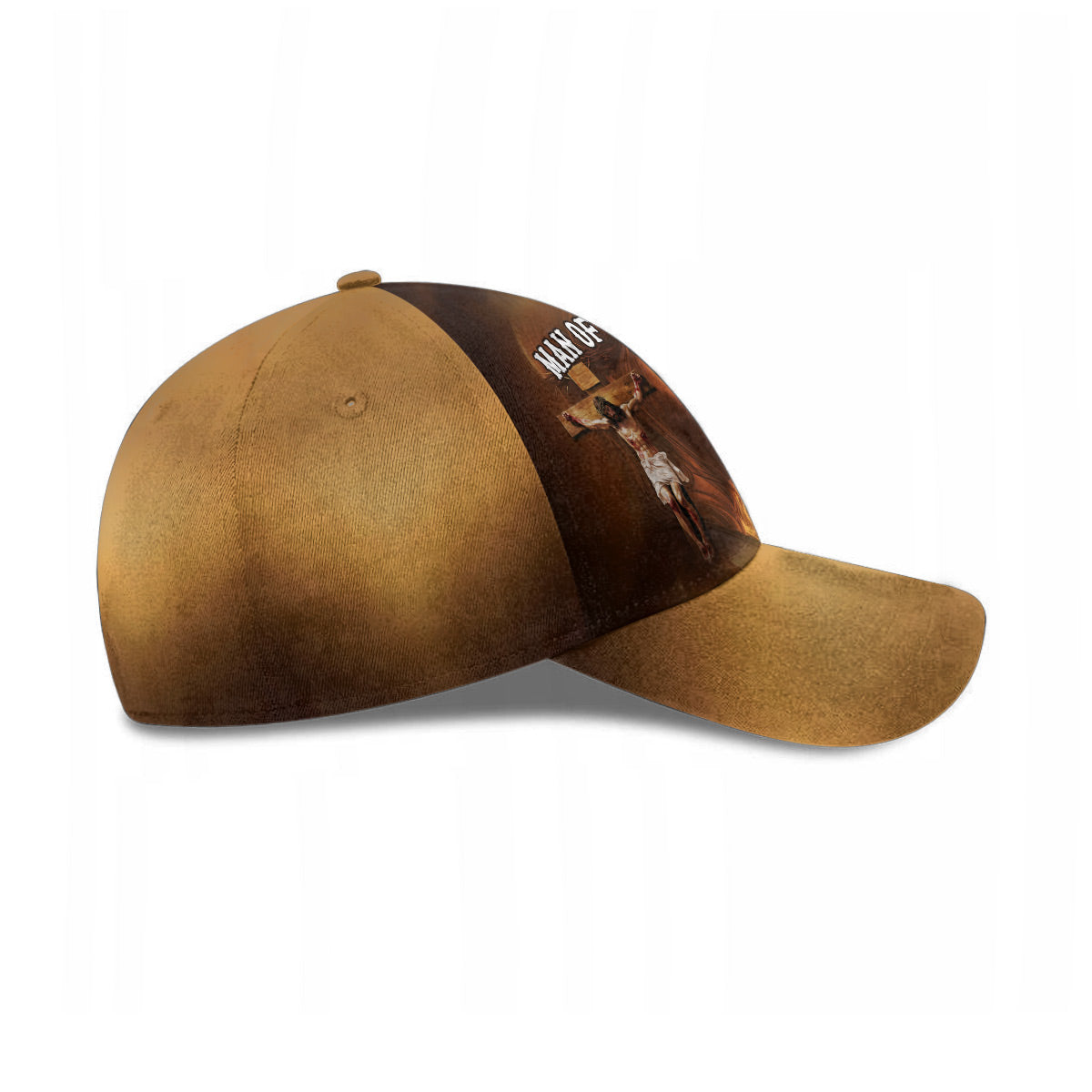 Declare your faith boldly with the Fully Vaccinated by the Blood of Jesus Baseball Cap. This striking design features a powerful image of Jesus on the cross alongside His compassionate gaze, symbolizing salvation, redemption, and divine protection. The warm, golden hues create a profound and spiritual look, making it a meaningful expression of faith.
