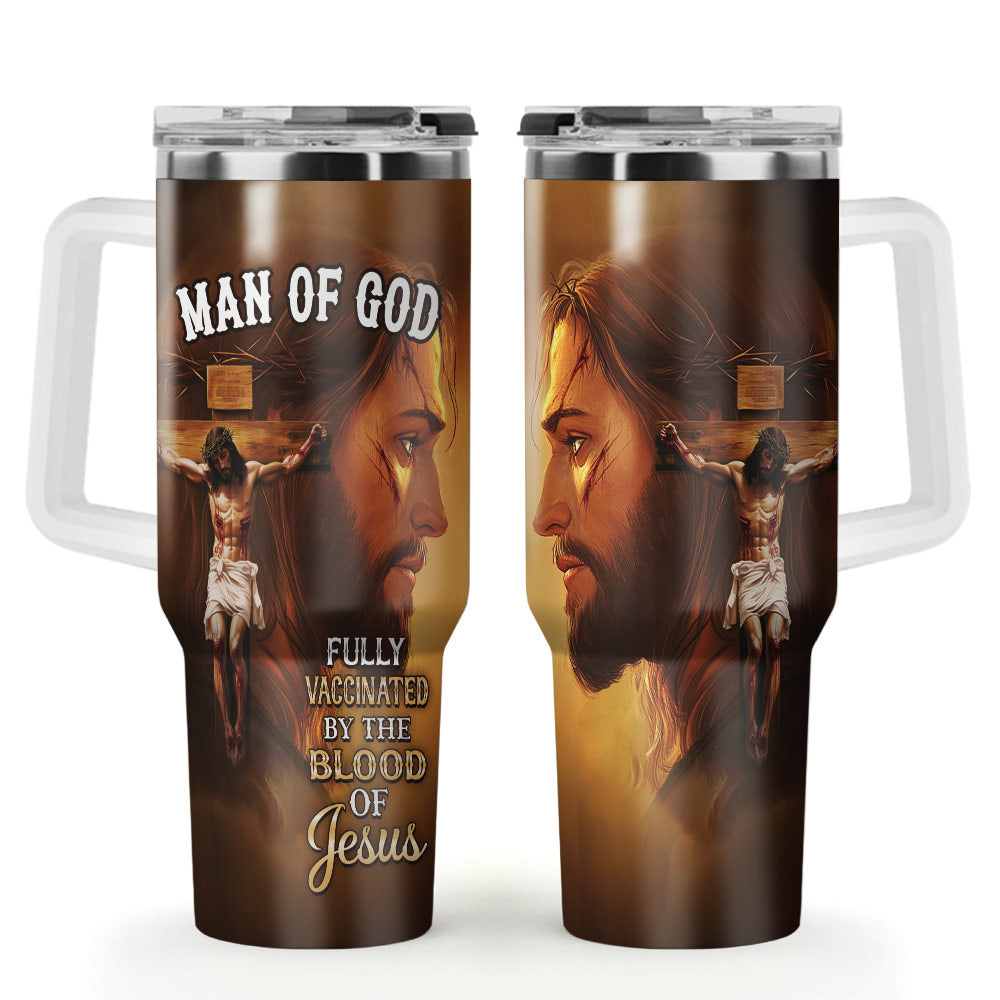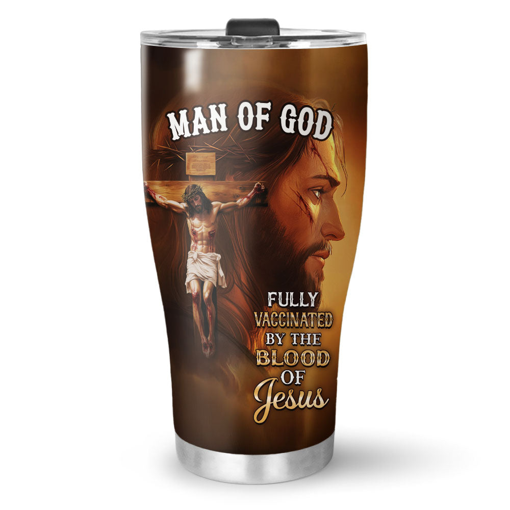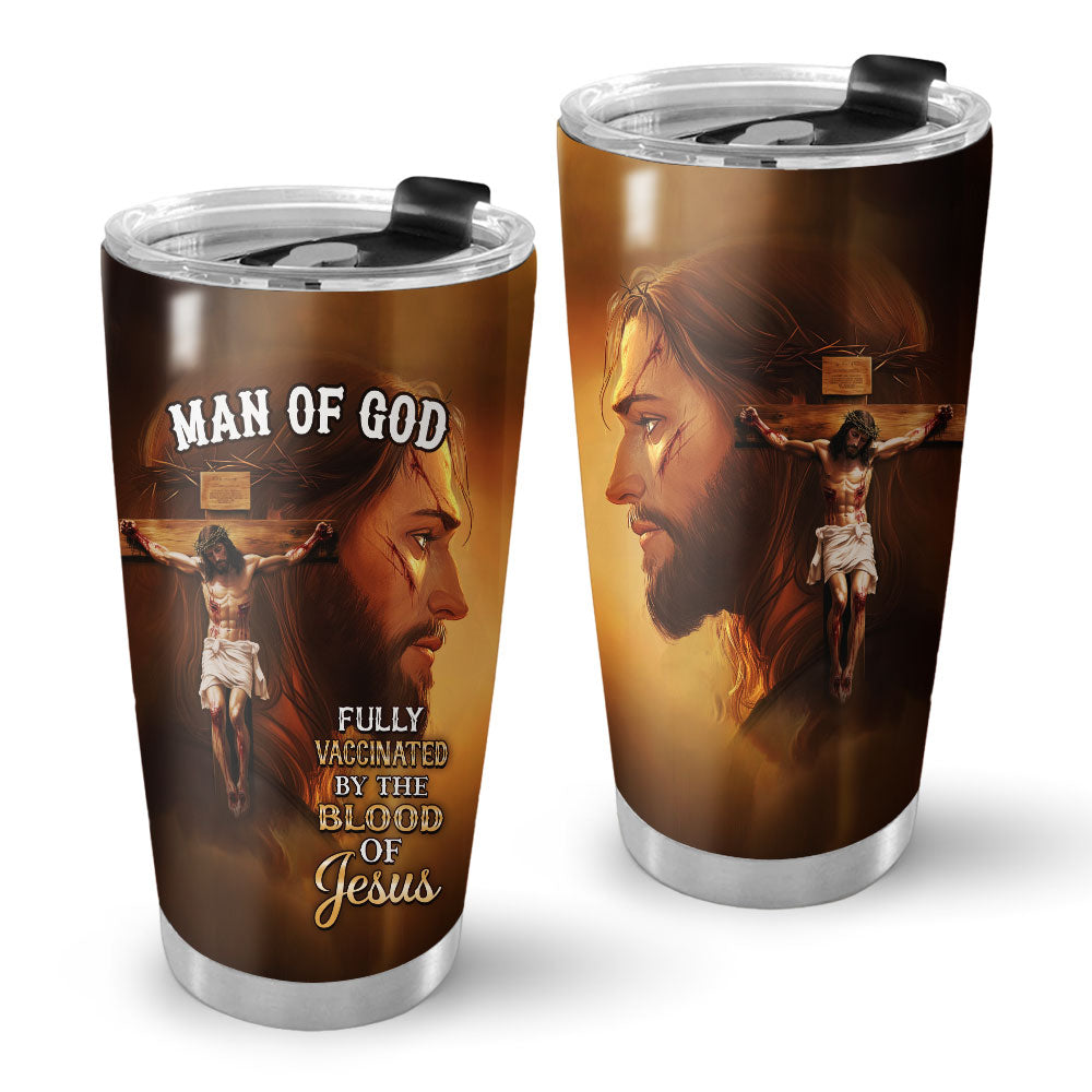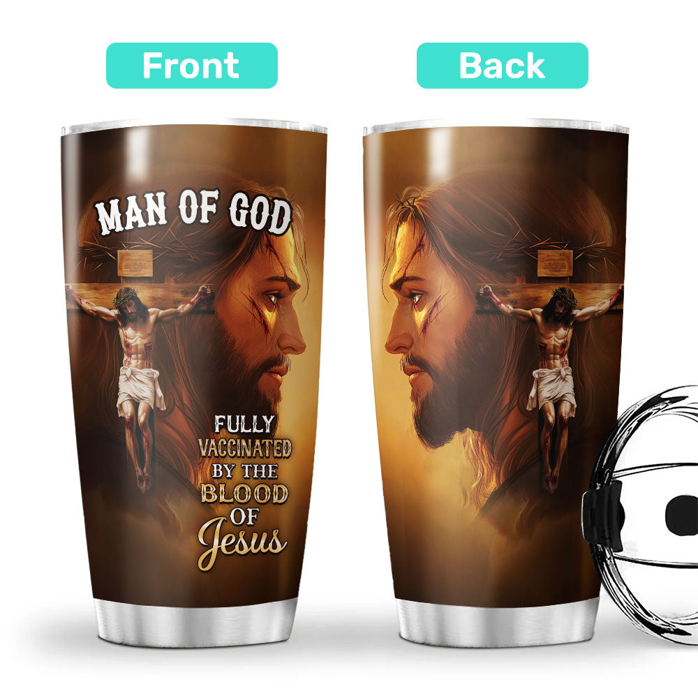 Show your unwavering faith with the Fully Vaccinated by the Blood of Jesus Stainless Steel Tumbler, featuring a powerful depiction of Jesus on the cross with a close-up side profile of His face, symbolizing sacrifice, redemption, and salvation. The bold message "Fully Vaccinated by the Blood of Jesus" serves as a testament to His divine protection and grace.