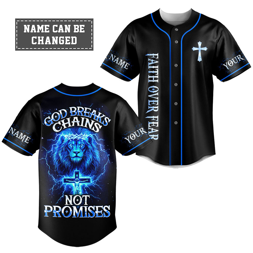 Walk in freedom and bold faith with the “God Breaks Chains Not Promises” Lion Custom Baseball Jersey — made for believers who trust in God's power and unshakable truth.