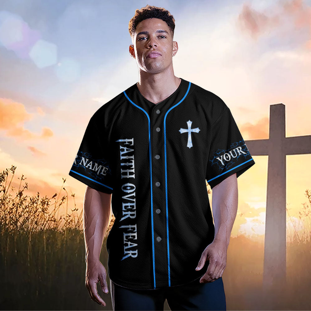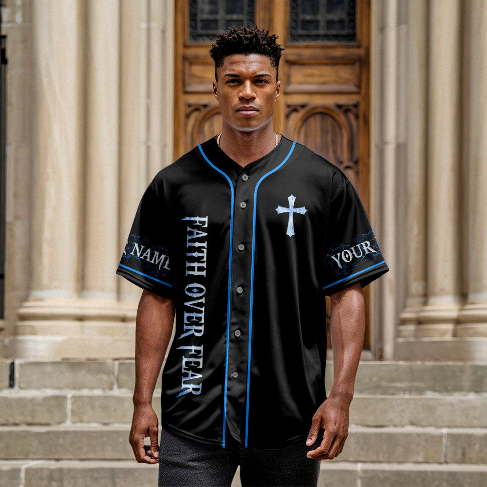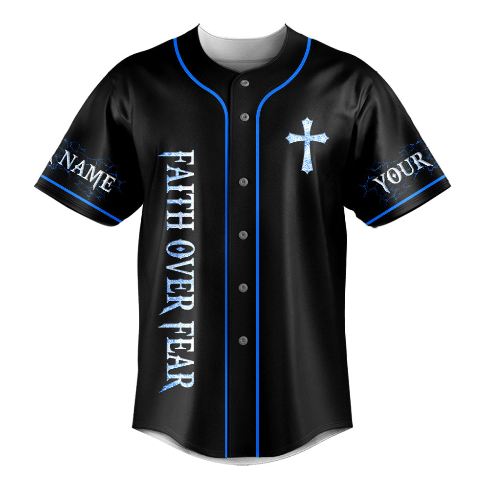 while the front boldly reads “Faith Over Fear” with a glowing cross. Personalize both sleeves with your name and let your faith shine everywhere you go.