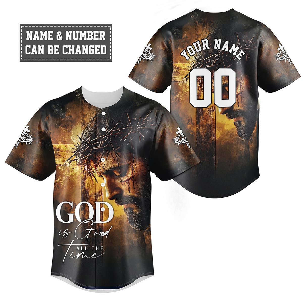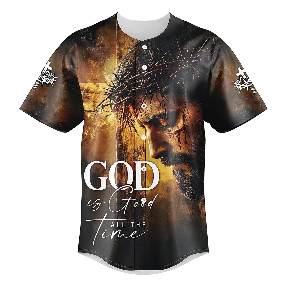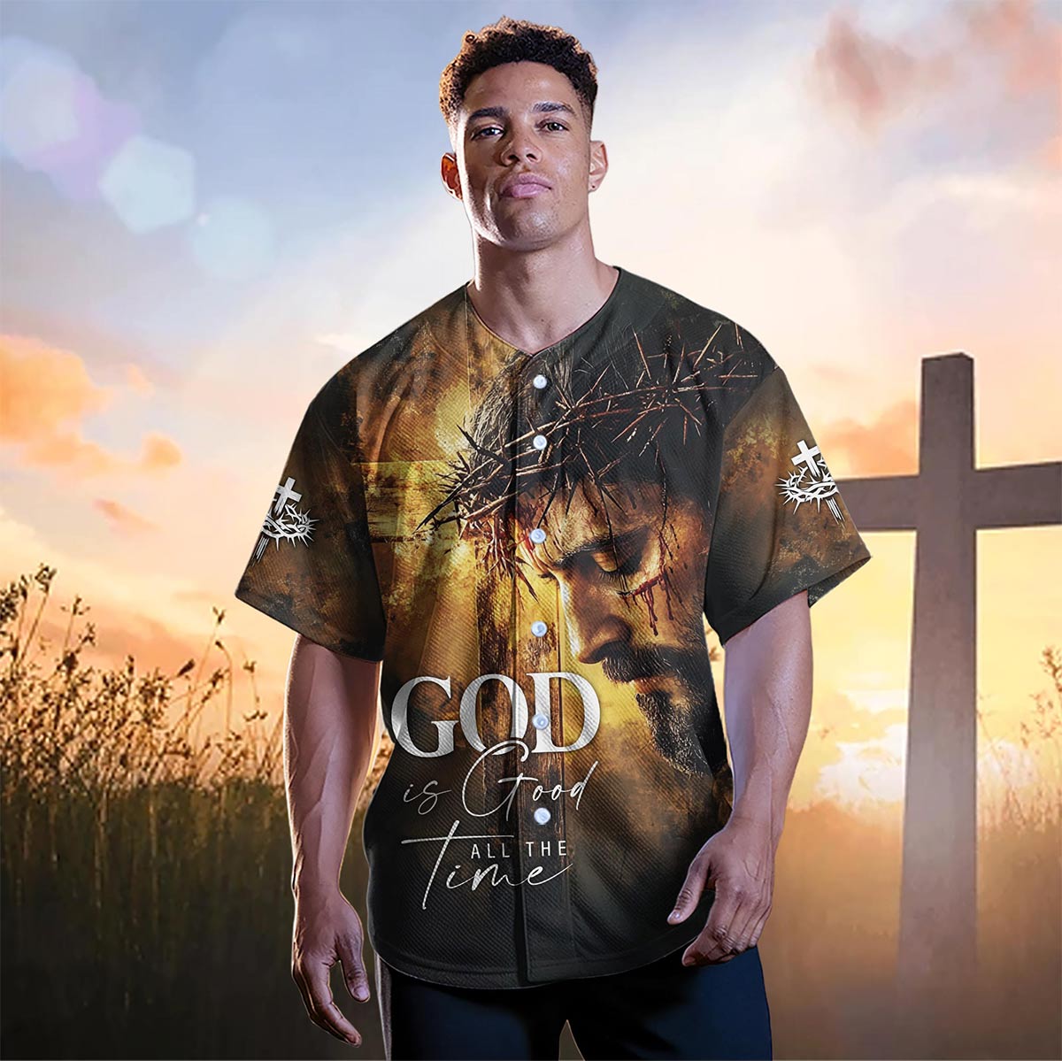 Embrace the truth of God's eternal goodness with the "God is Good All The Time" baseball jersey. This powerful design features a poignant image of Jesus, crowned with thorns, against a dramatic backdrop that captures His sacrifice. The bold "God is Good All The Time" message across the chest serves as a reminder of His unchanging nature, no matter the circumstances.