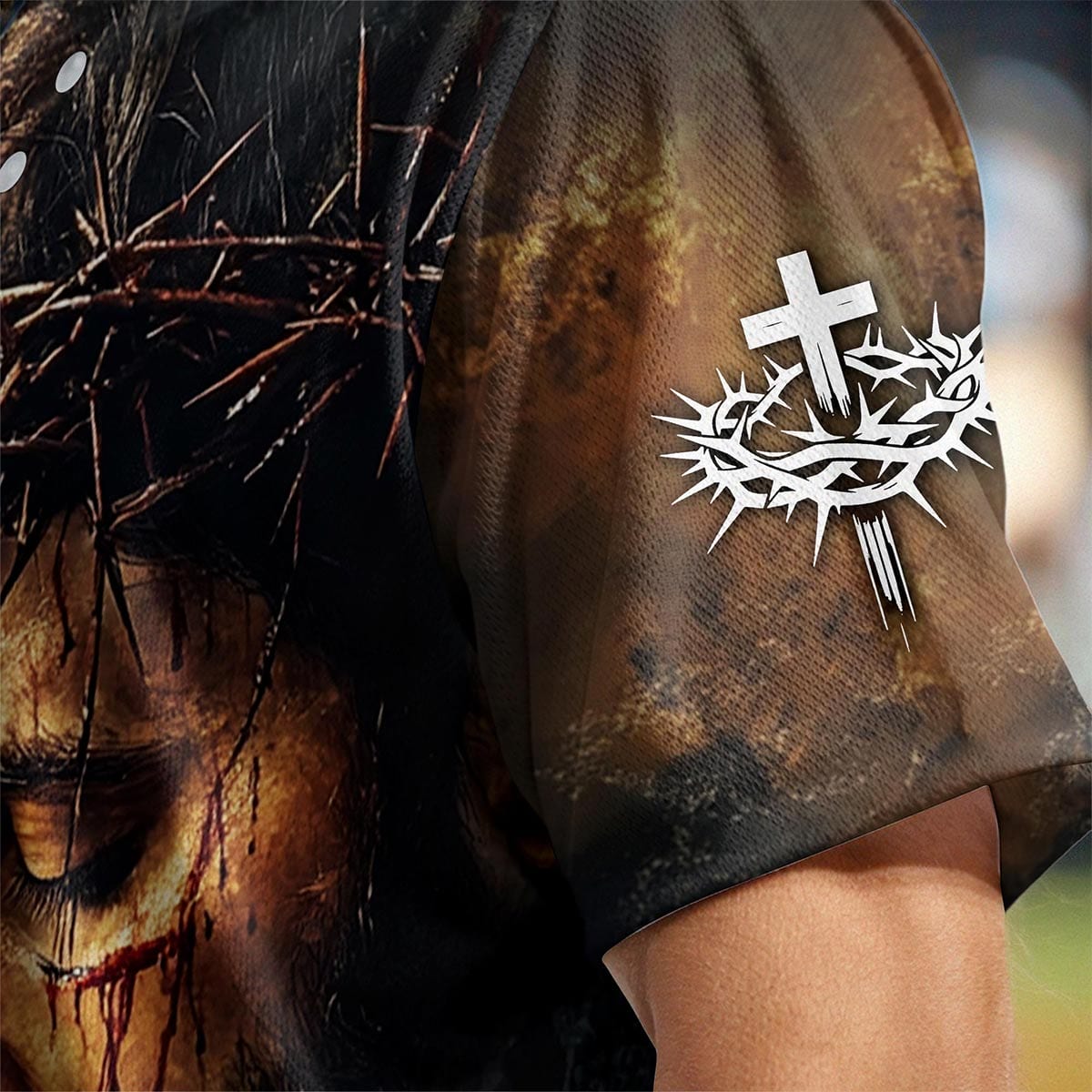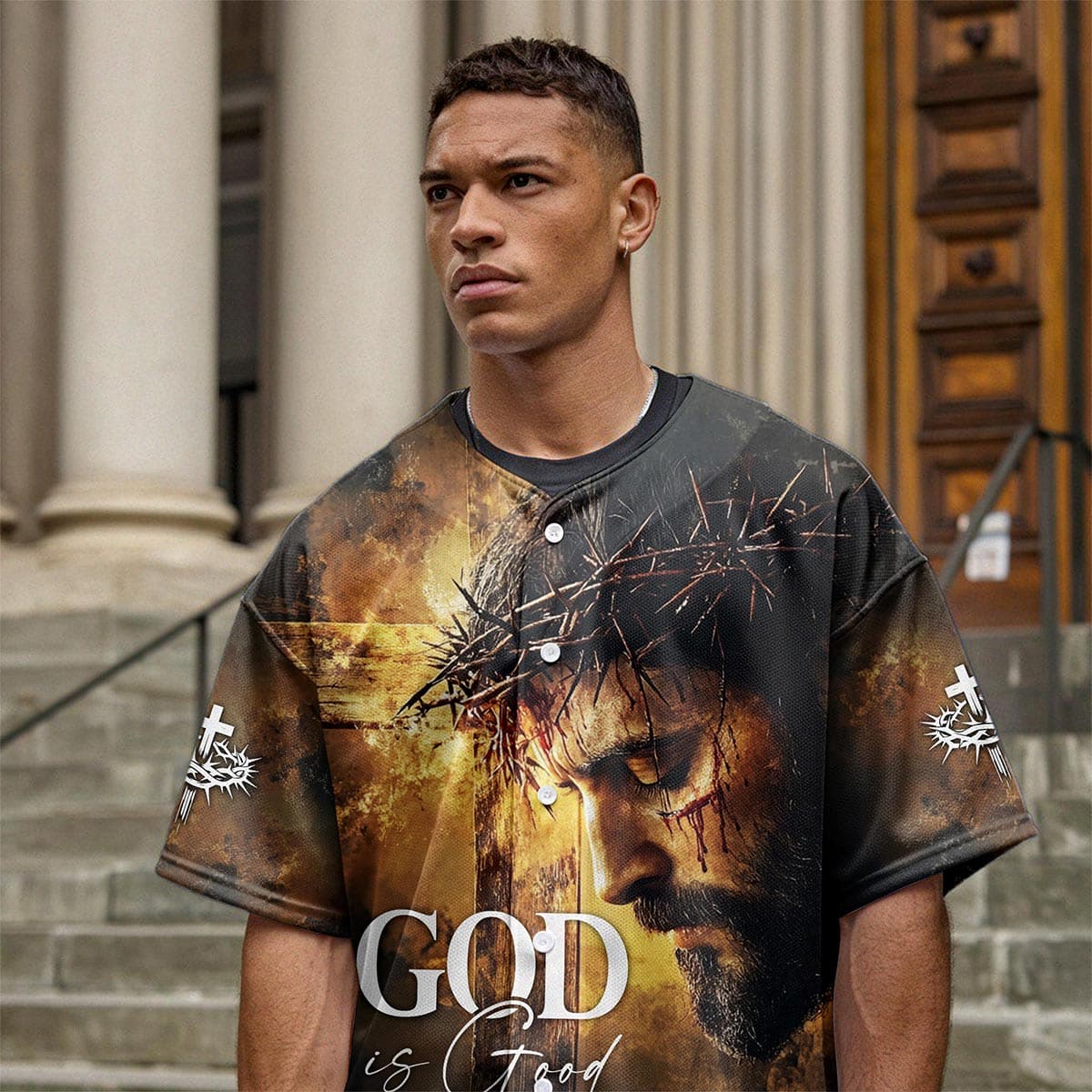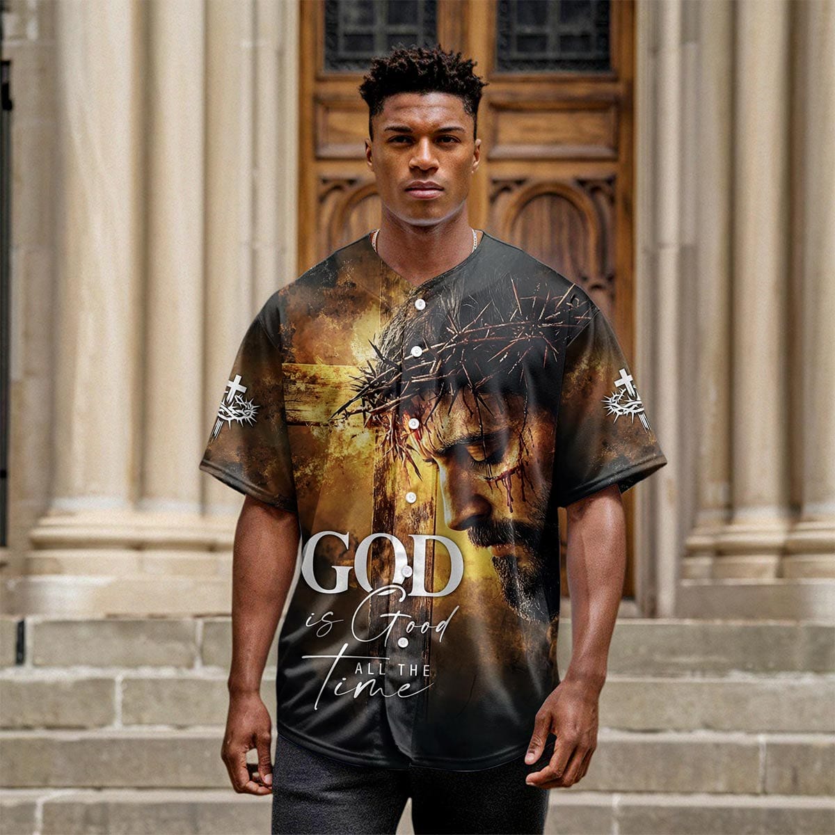 Embrace the truth of God's eternal goodness with the "God is Good All The Time" baseball jersey. This powerful design features a poignant image of Jesus, crowned with thorns, against a dramatic backdrop that captures His sacrifice. The bold "God is Good All The Time" message across the chest serves as a reminder of His unchanging nature, no matter the circumstances.