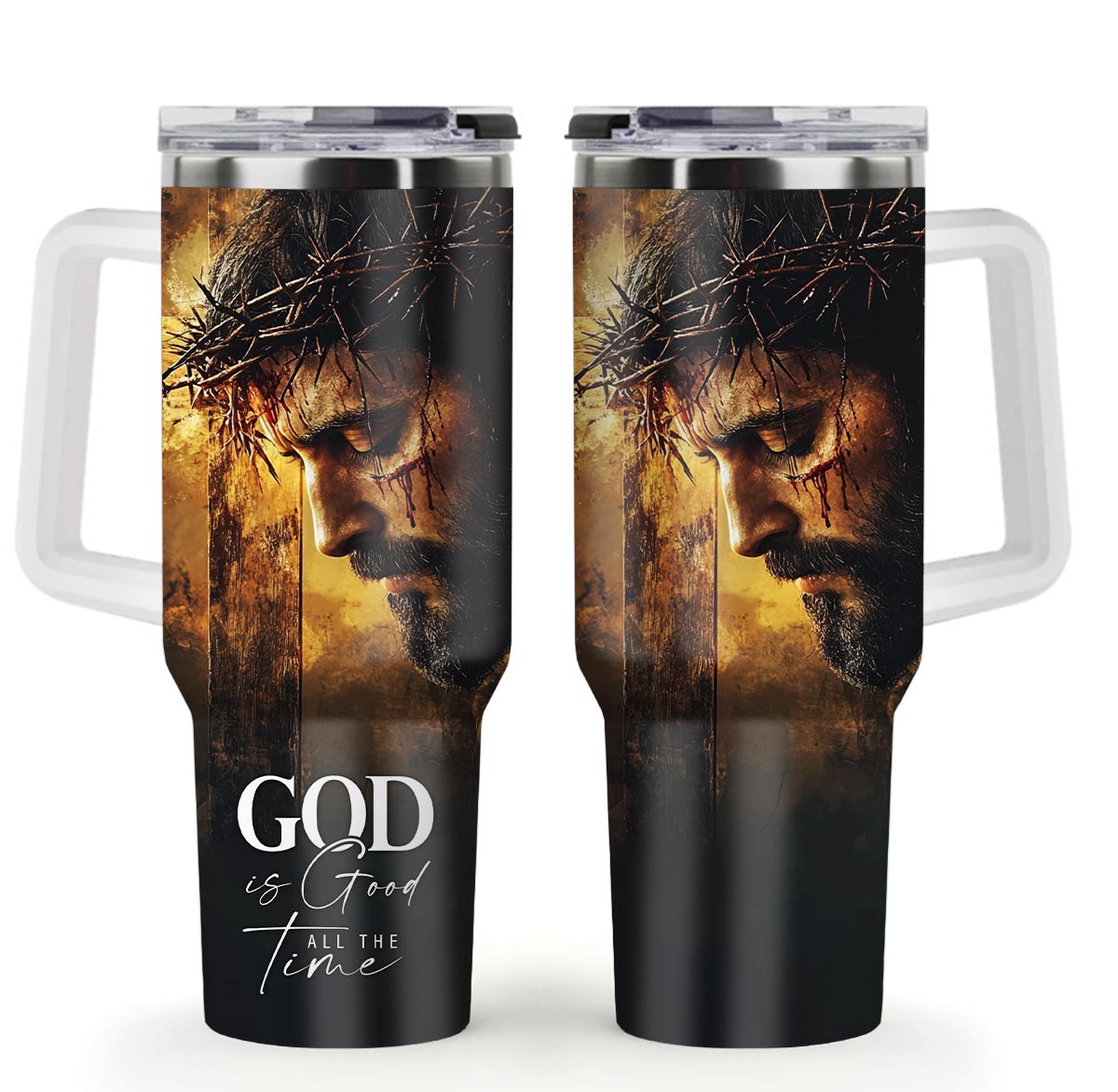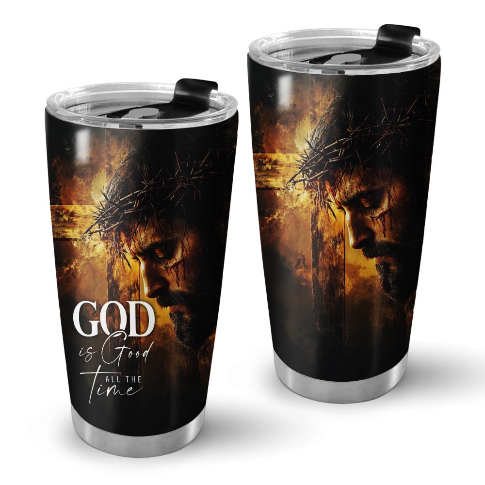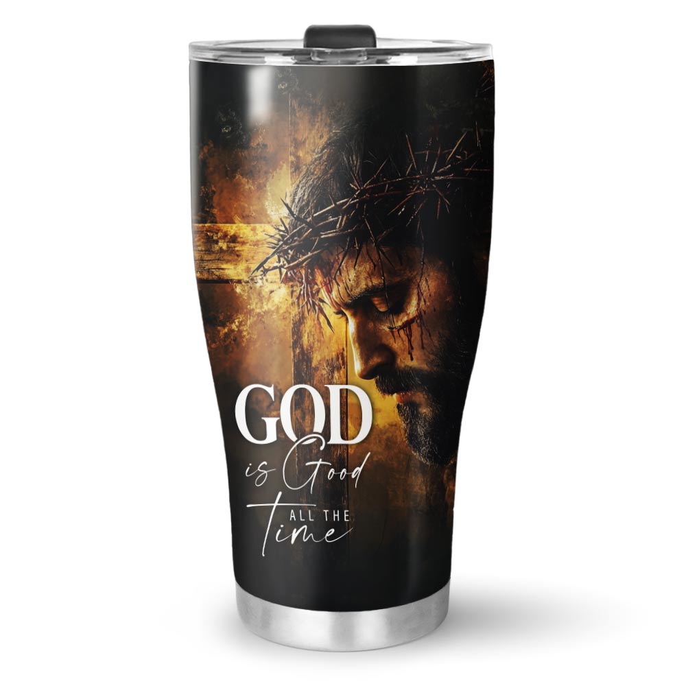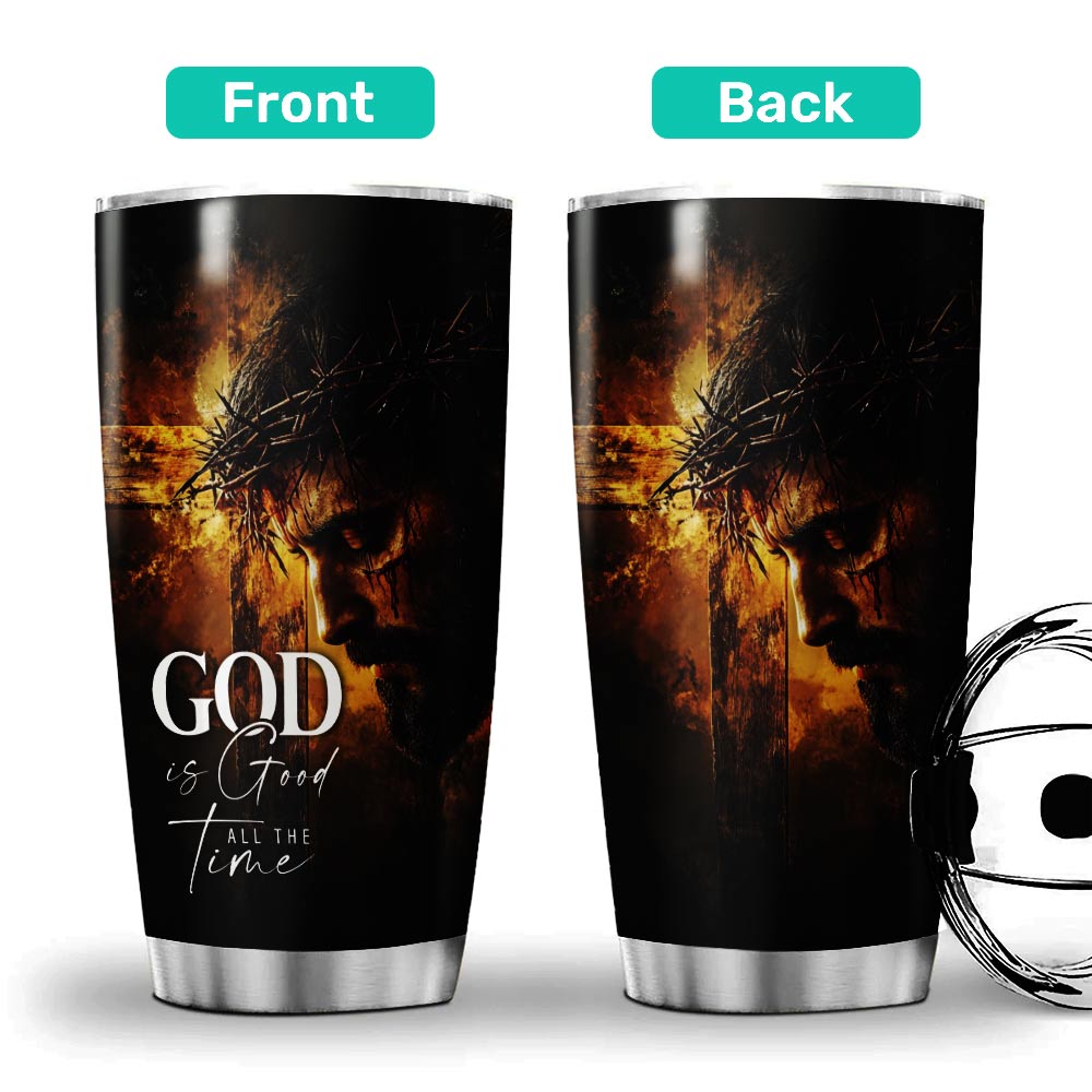 Carry your faith with you wherever you go with the God is Good All The Time Stainless Steel Tumbler. This beautifully designed tumbler features a powerful image of Jesus wearing the crown of thorns against a wooden cross, symbolizing sacrifice, redemption, and unwavering faith. A daily reminder that God's goodness never fades, no matter the trials we face.