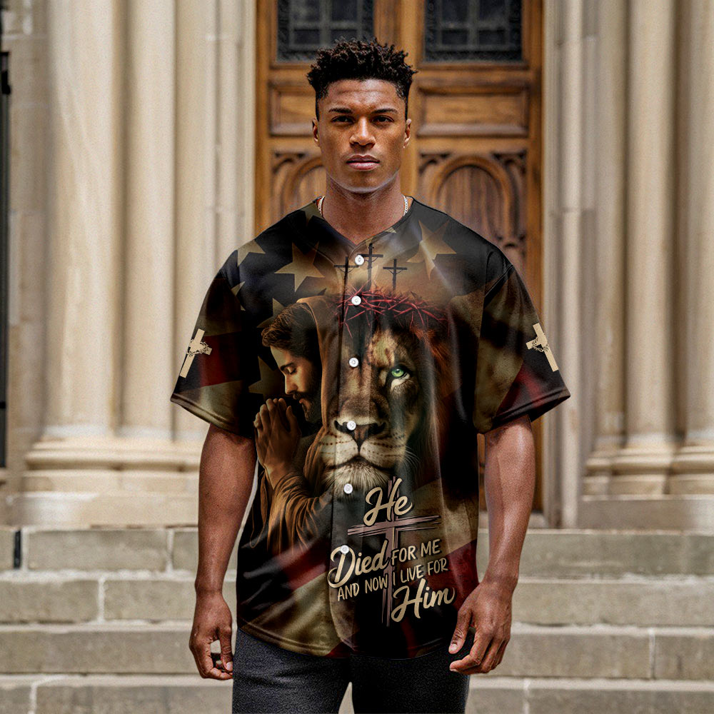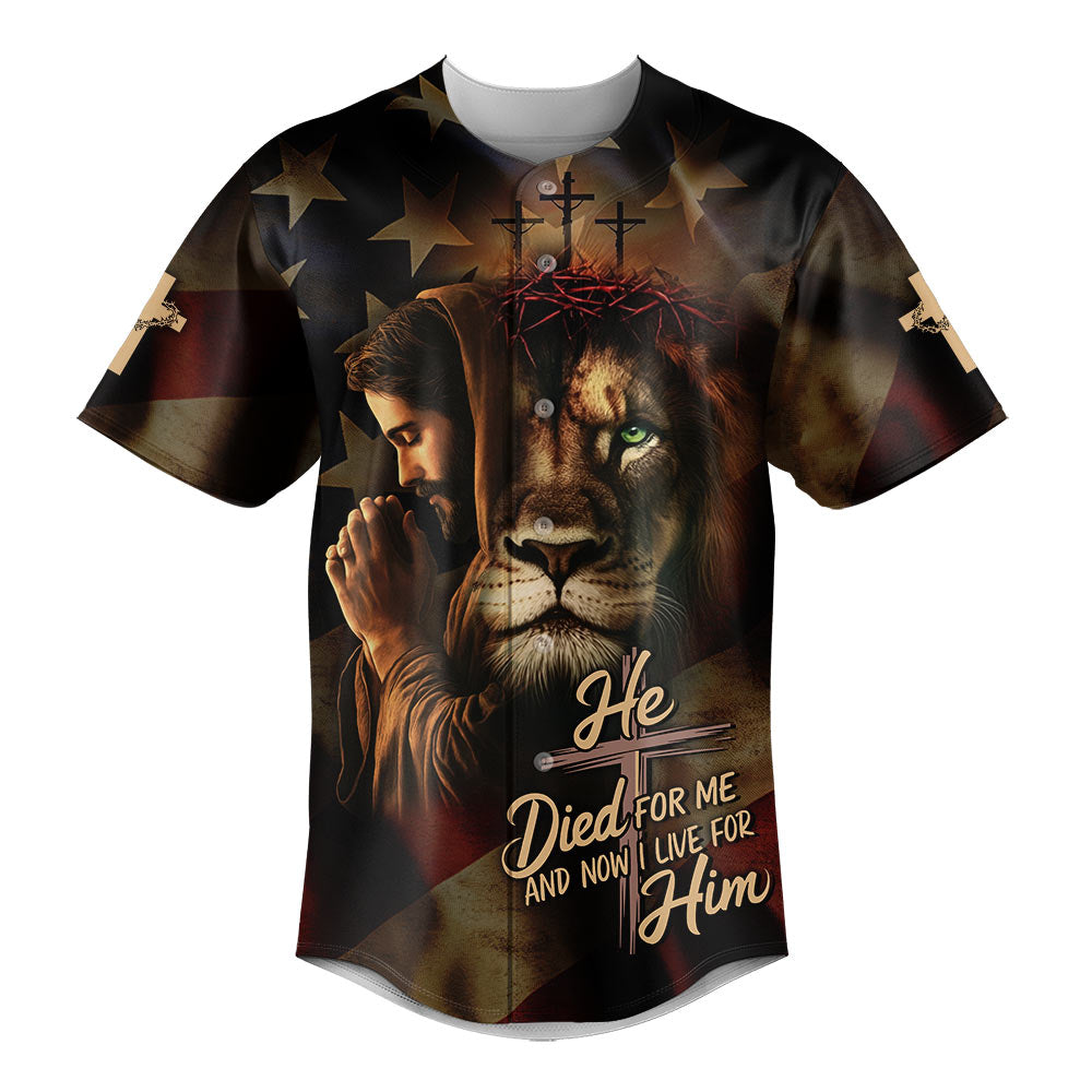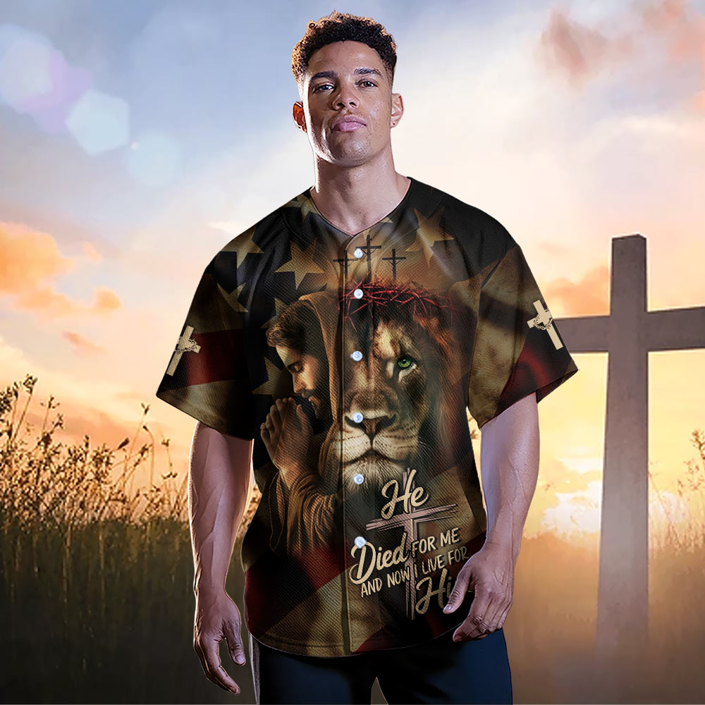 Show your unwavering faith with the He Died For Me And Now I Live For Him Baseball Jersey. This powerful design features a poignant image of Jesus with a crown of thorns, alongside a majestic lion, representing the sacrifice He made for us. Set against the backdrop of a distressed American flag, the jersey boldly displays the message, "He Died For Me And Now I Live For Him," a tribute to the life-changing power of Christ's love.