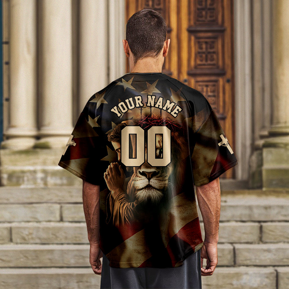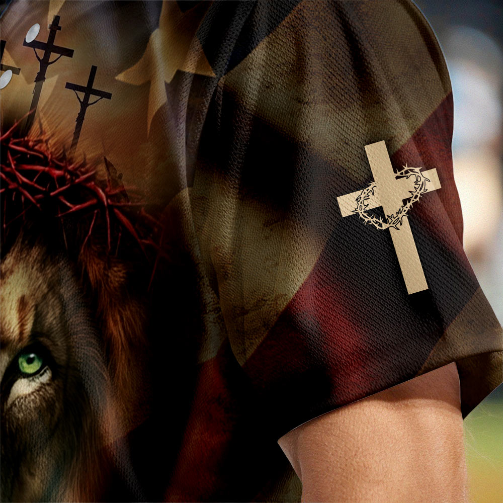 The combination of vibrant colors and a striking design makes this jersey perfect for those who want to wear their faith proudly, with a tribute to both Jesus and country.