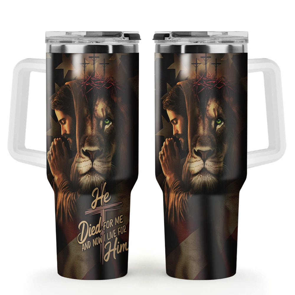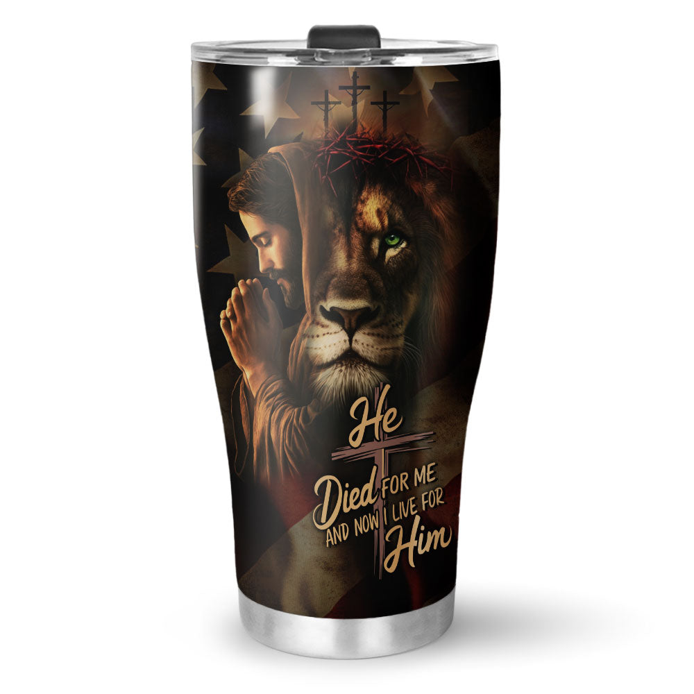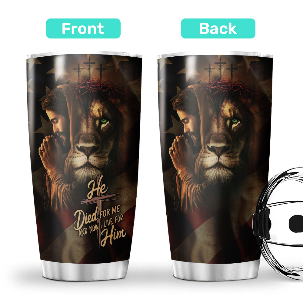 Honor your faith with the He Died For Me And Now I Live For Him Stainless Steel Tumbler, featuring a striking design of a praying man, a lion with a crown of thorns, and the cross in the background, symbolizing strength, sacrifice, and devotion. The powerful message "He Died for Me, and Now I Live for Him" serves as a daily inspiration to walk in His path and live with purpose.