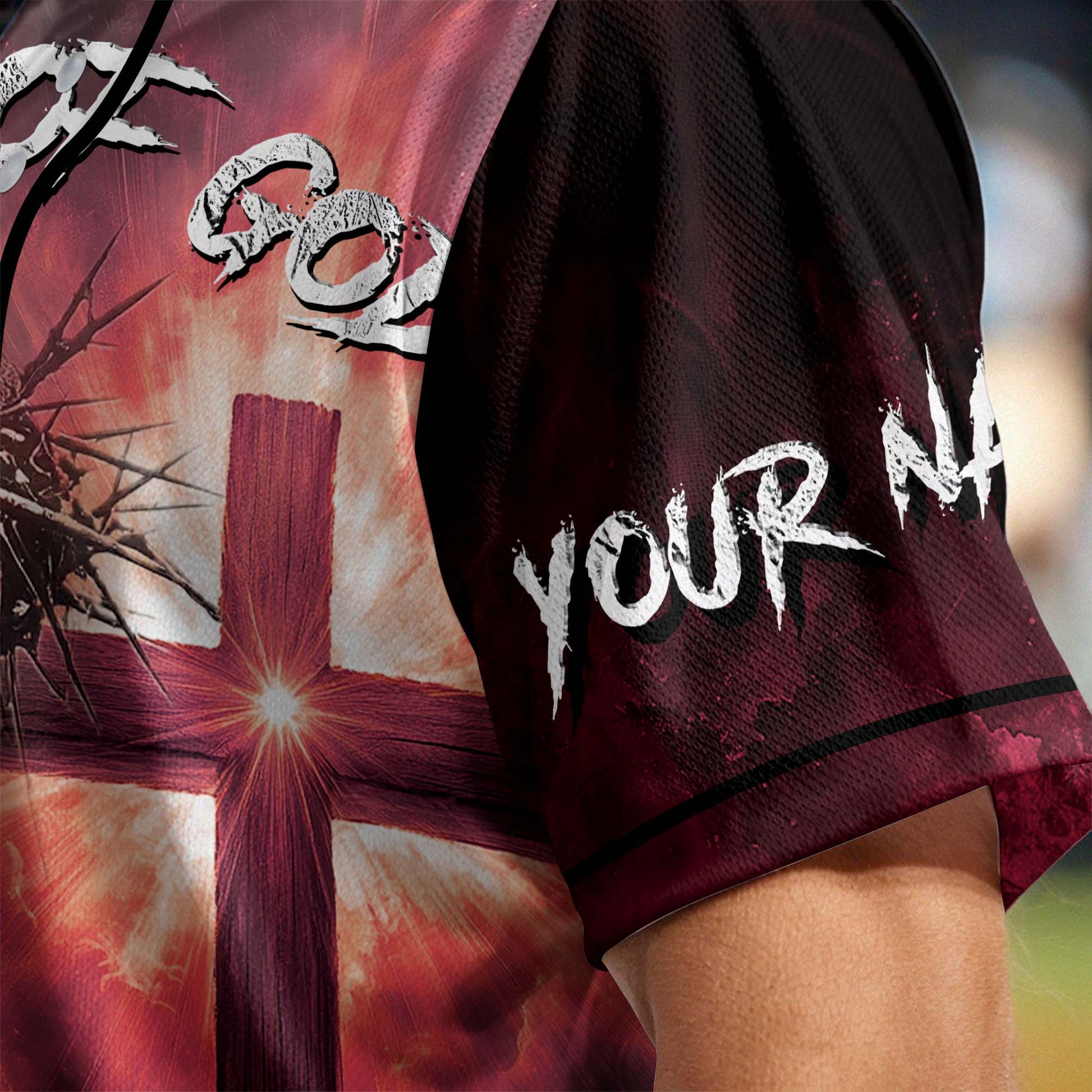 With dramatic red-and-black tones, a glowing cross, and your name on the sleeves, this jersey is both faith-filled and visually powerful.