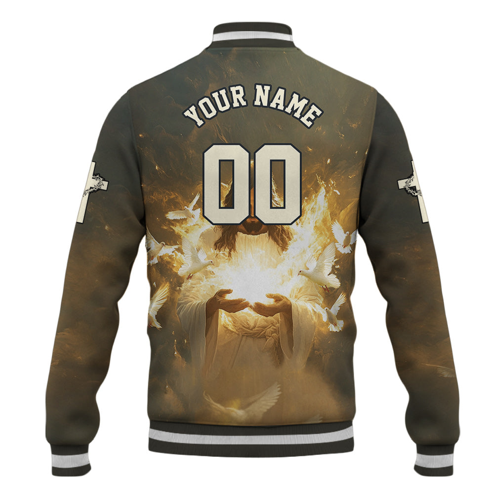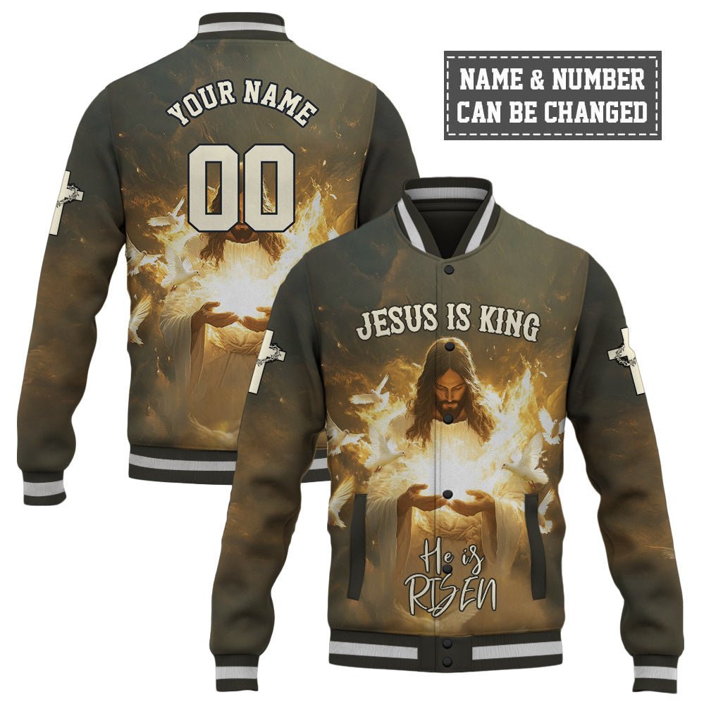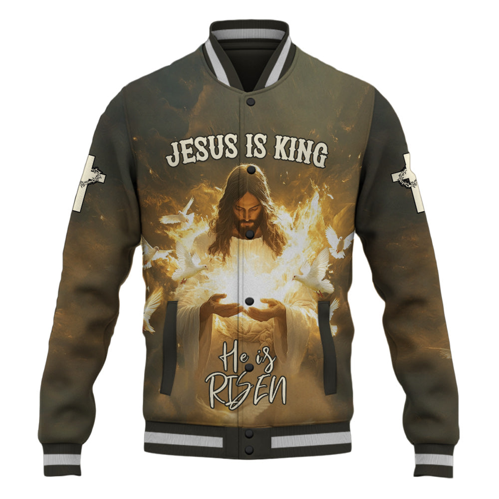 Celebrate the victory of Christ with the He Is Risen Baseball Jacket — a bold and inspiring tribute to the risen Savior. Featuring powerful imagery of Jesus glowing in divine light, surrounded by doves and fire, this jacket boldly declares the truth: Jesus is King — He is Risen. With detailed artwork on both the front and back, this jacket is more than just outerwear — it’s a public declaration of faith.