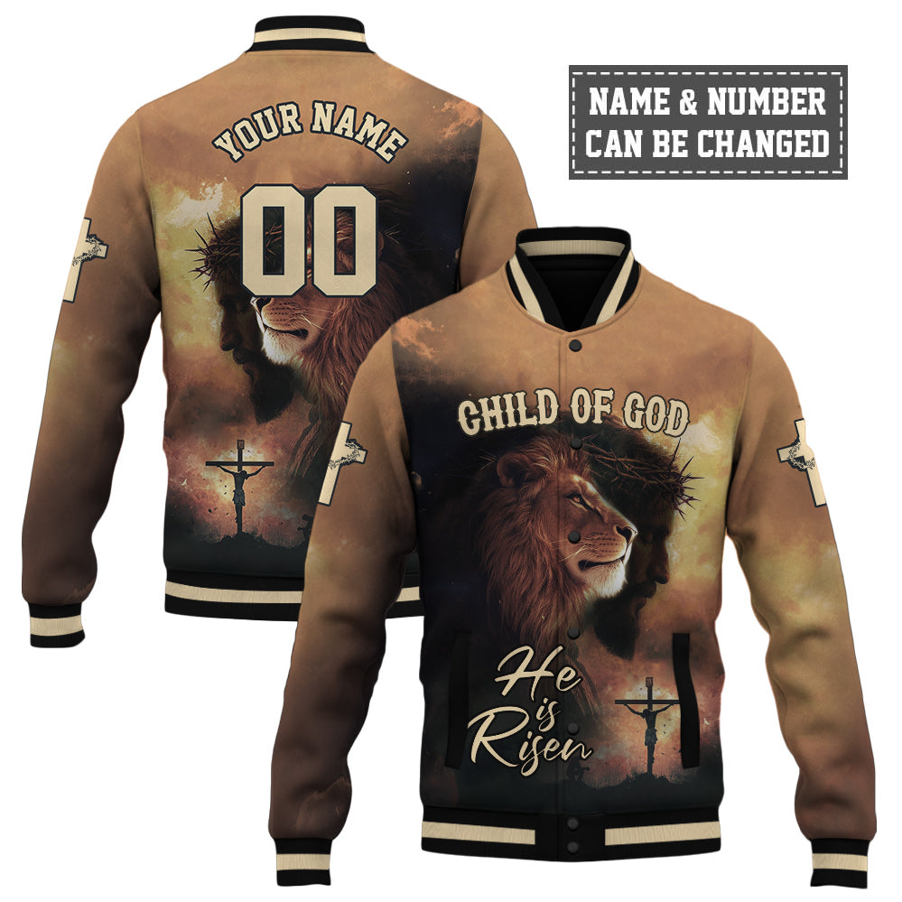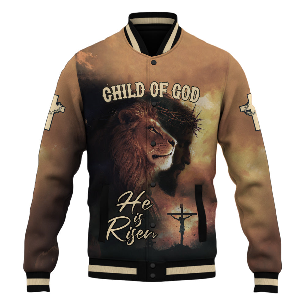 Show your faith in bold style with the He Is Risen Baseball Jacket — a powerful blend of resurrection glory and spiritual identity. Featuring the face of Jesus wearing the crown of thorns merged with a majestic lion, this design captures both the sacrifice and strength of the Savior. The silhouette of the crucifixion and the words “Child of God – He is Risen” complete the message of victory and grace.