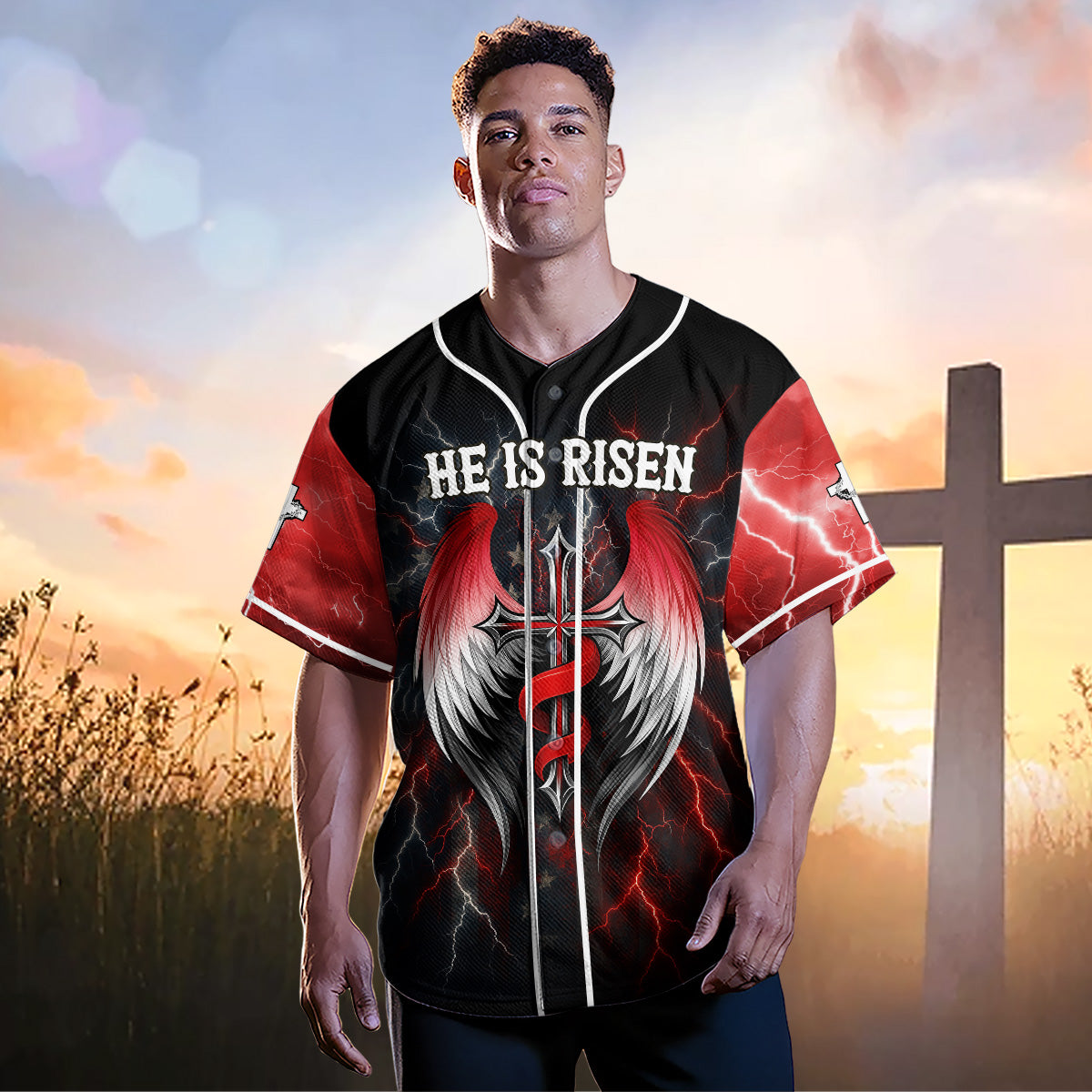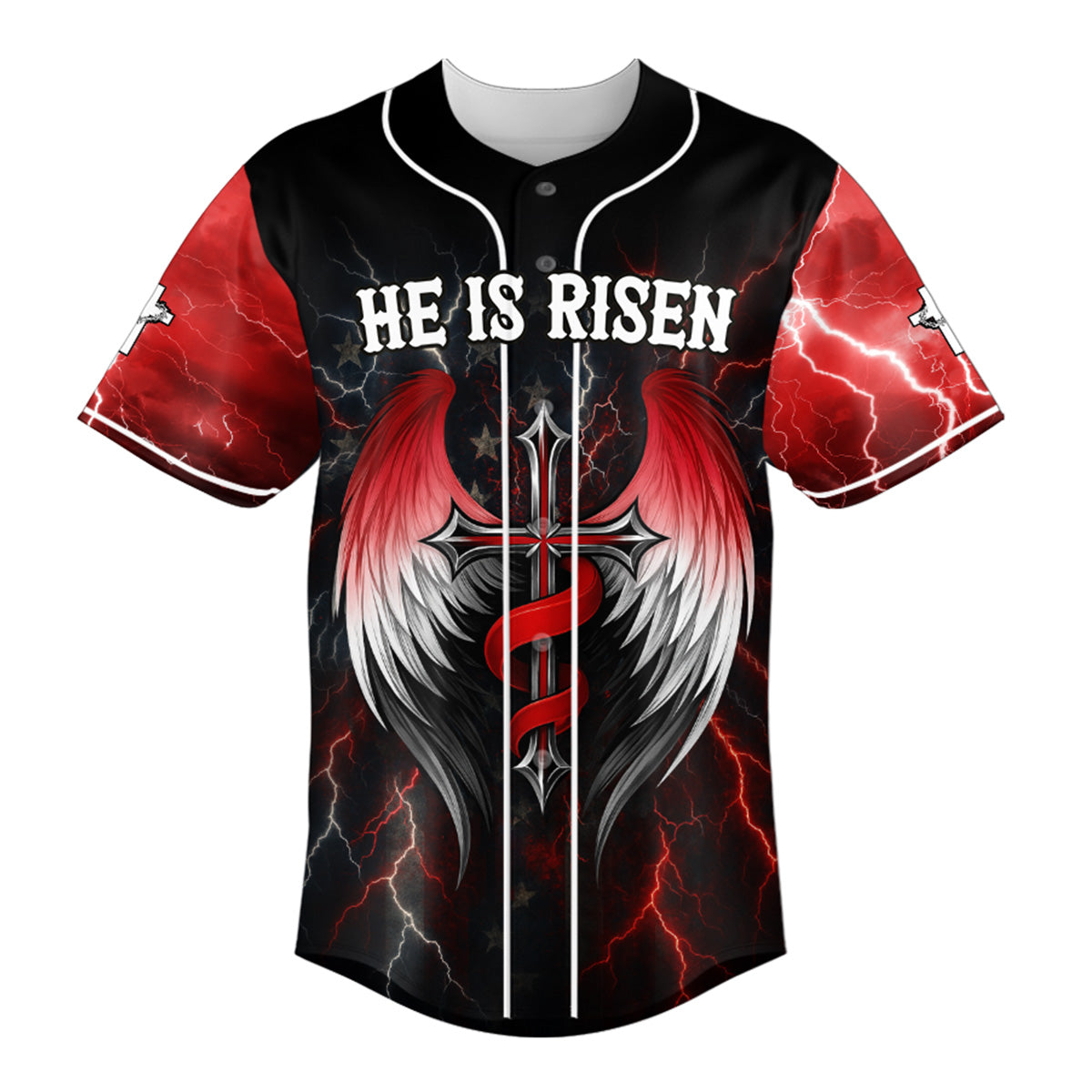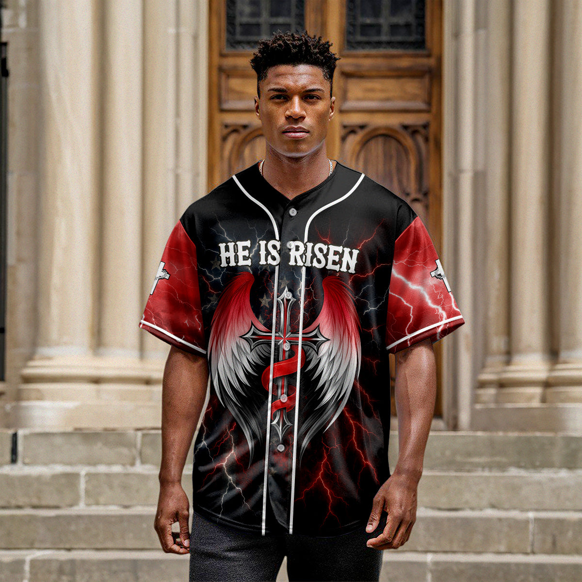 This striking design features red and silver angel wings wrapped around a glowing sword-shaped cross, symbolizing both heavenly power and the risen Savior. Set against a stormy red and black lightning backdrop, the jersey radiates divine intensity and unshakable truth. The phrase “HE IS RISEN” sits front and center, announcing the miracle that changed the world.