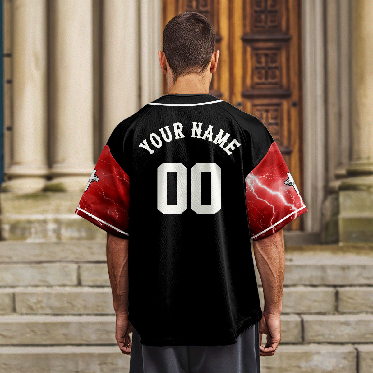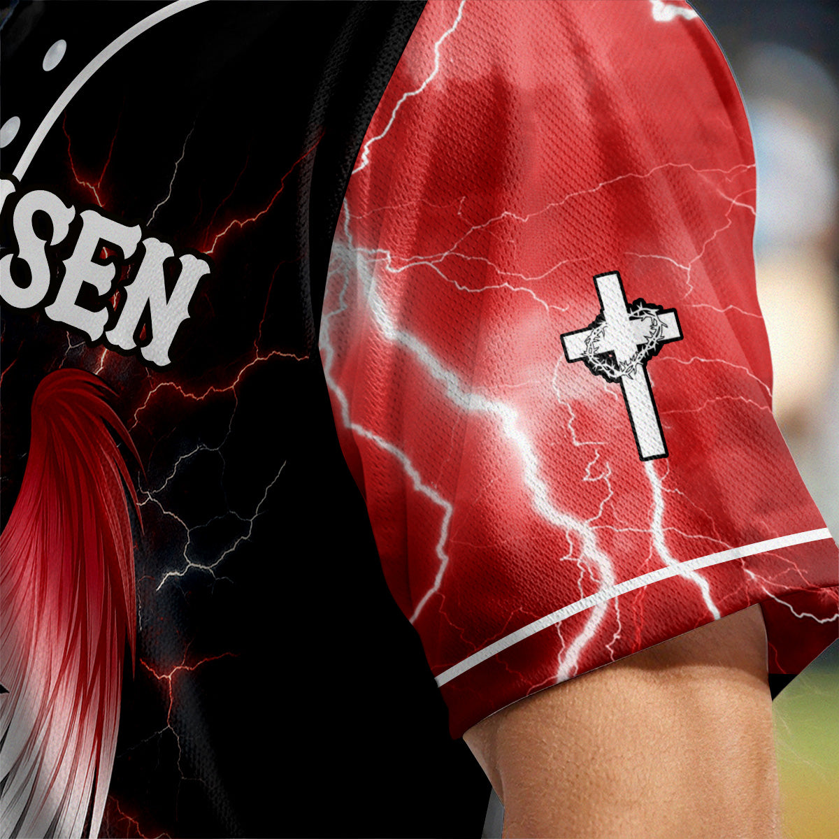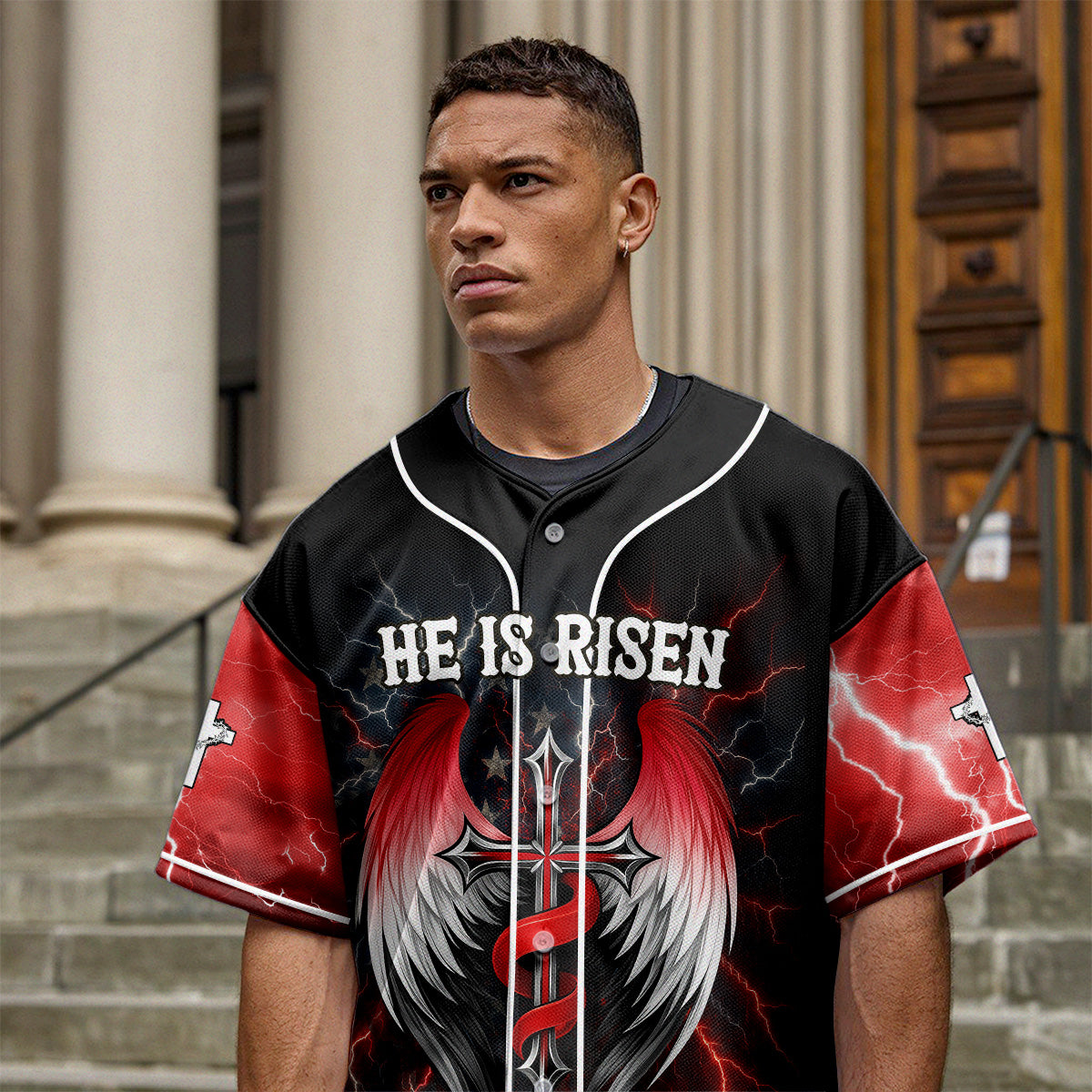 This striking design features red and silver angel wings wrapped around a glowing sword-shaped cross, symbolizing both heavenly power and the risen Savior. Set against a stormy red and black lightning backdrop, the jersey radiates divine intensity and unshakable truth. The phrase “HE IS RISEN” sits front and center, announcing the miracle that changed the world.
