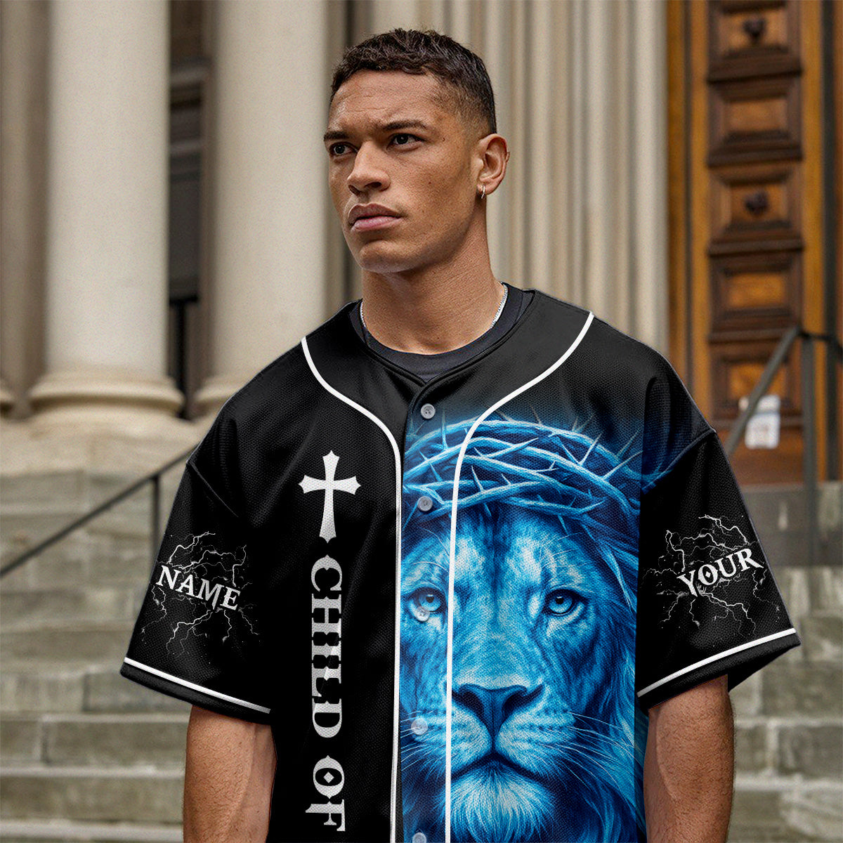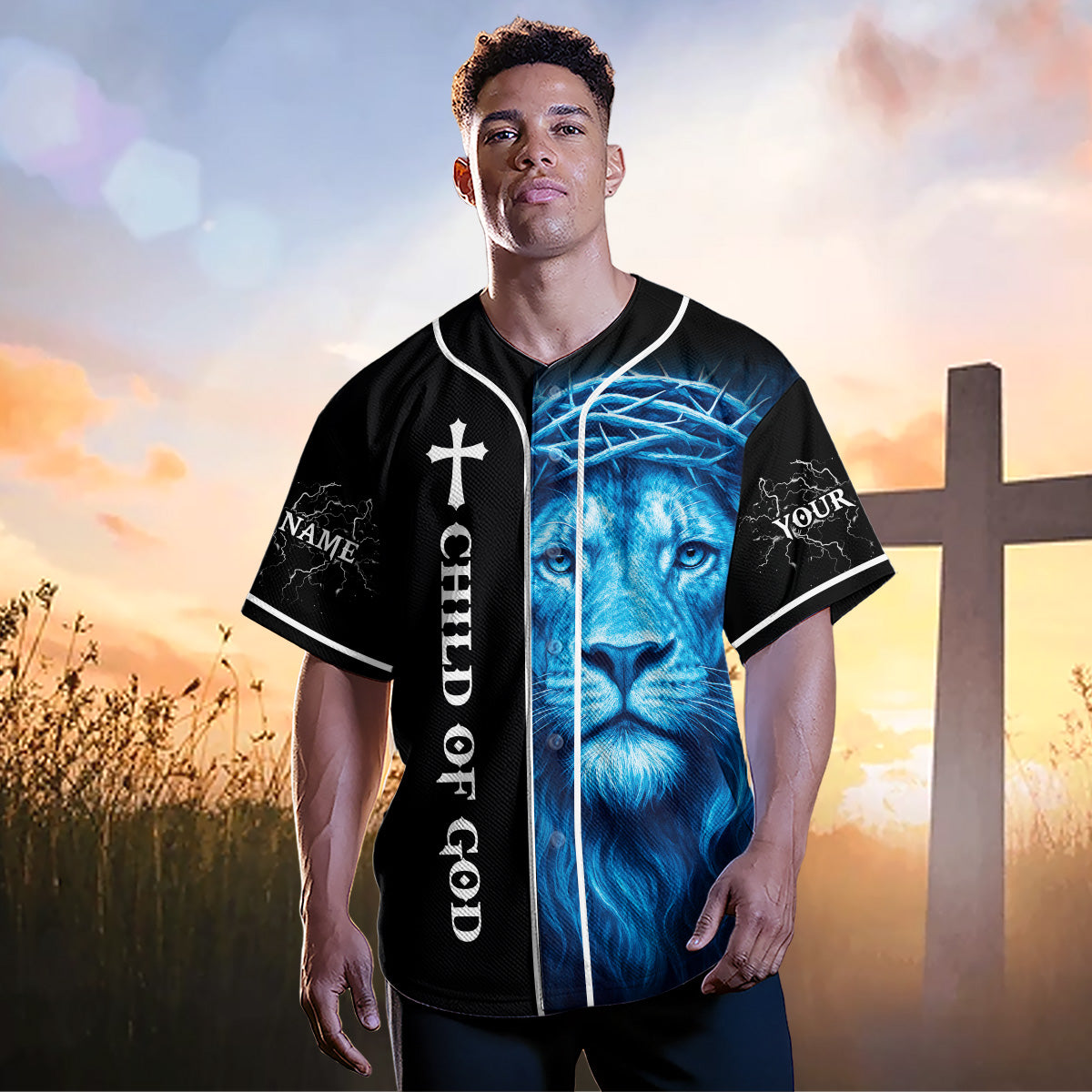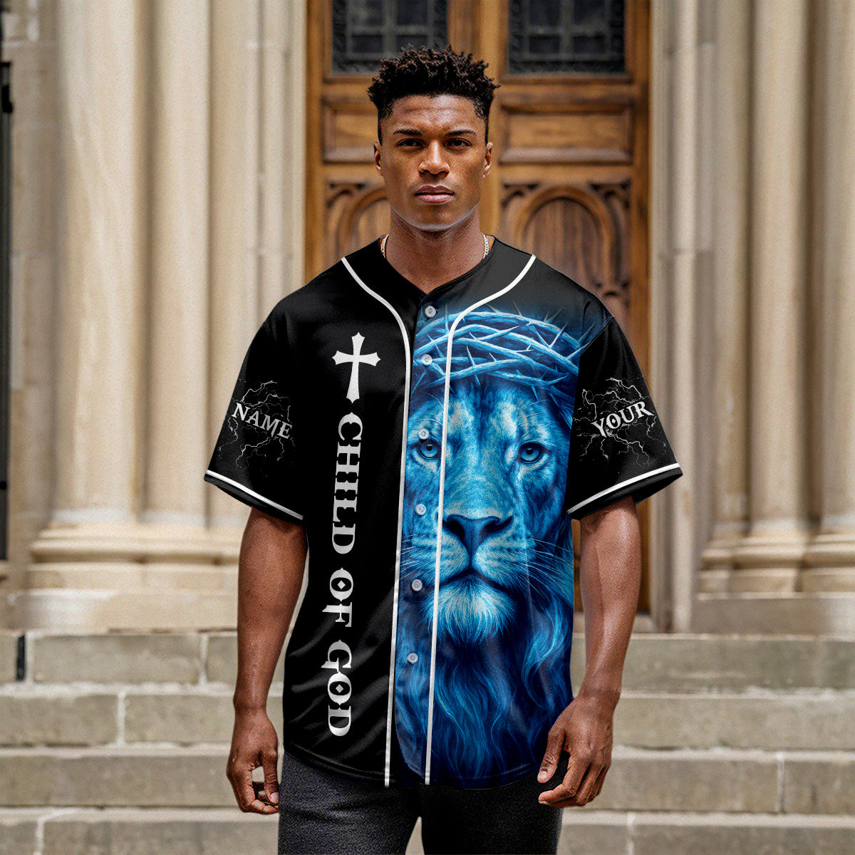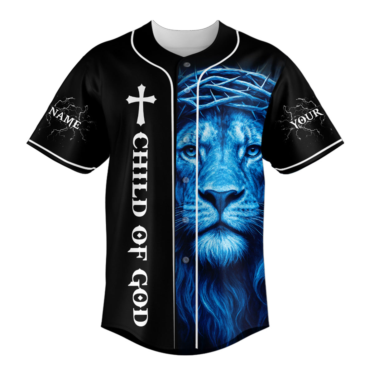 The front reads “Child of God” alongside a radiant cross and full lion artwork. Both sleeves are customizable with your name, making this jersey a powerful personal statement.