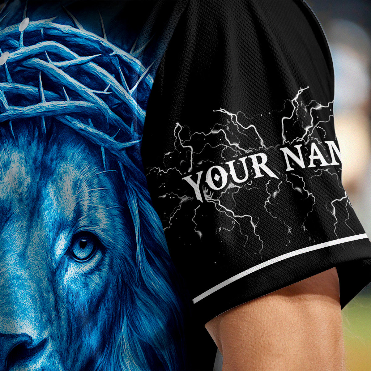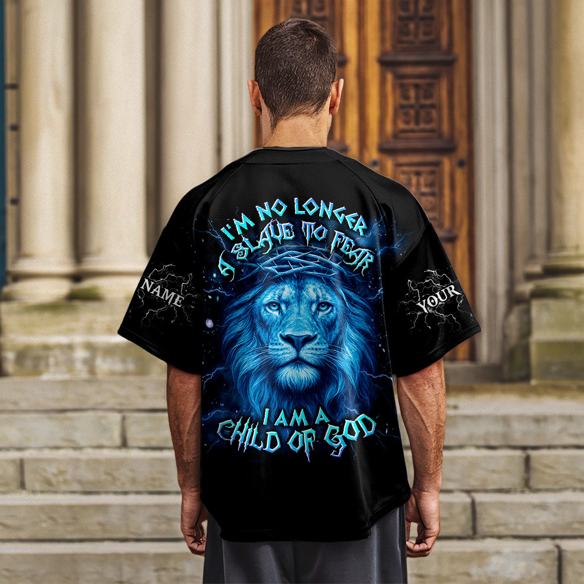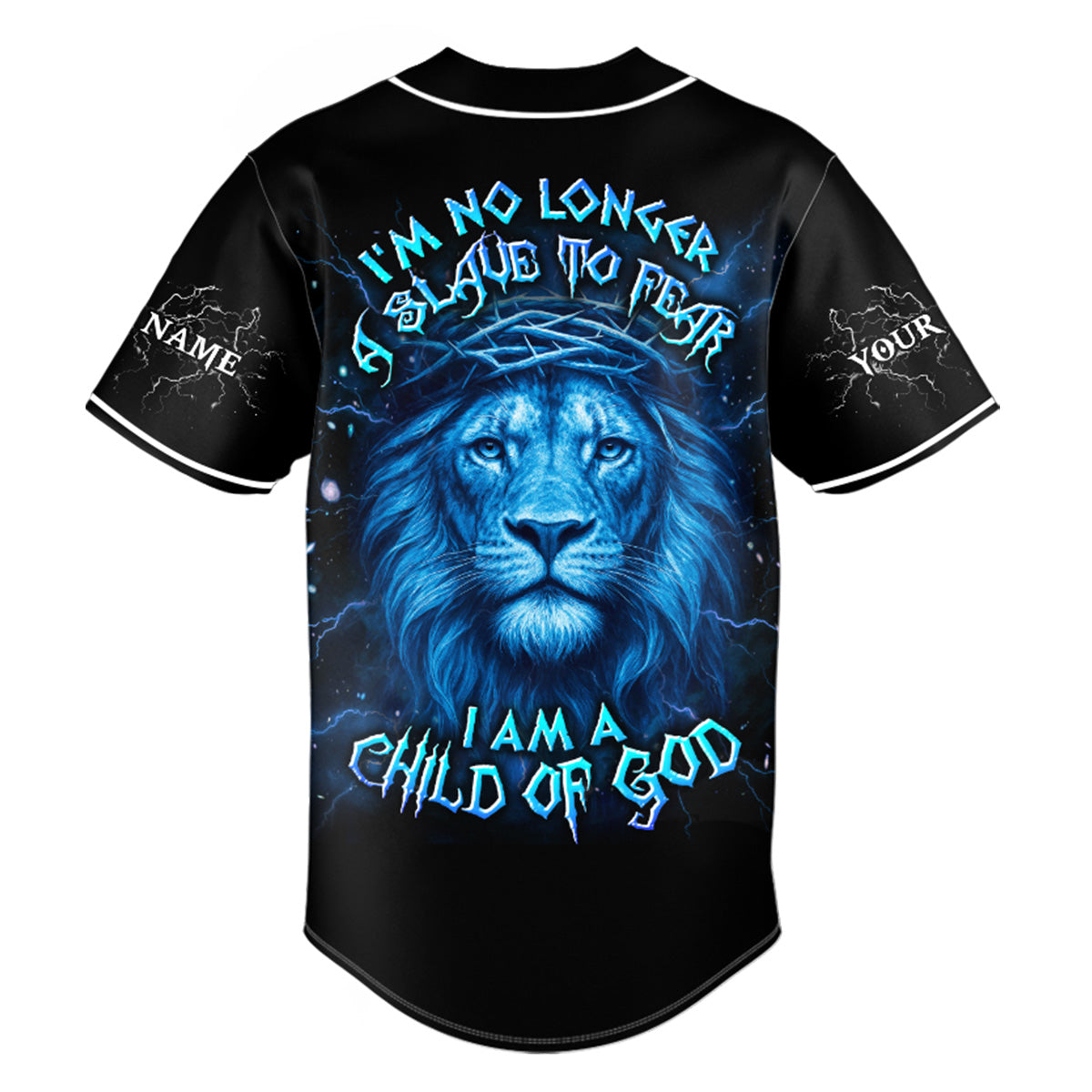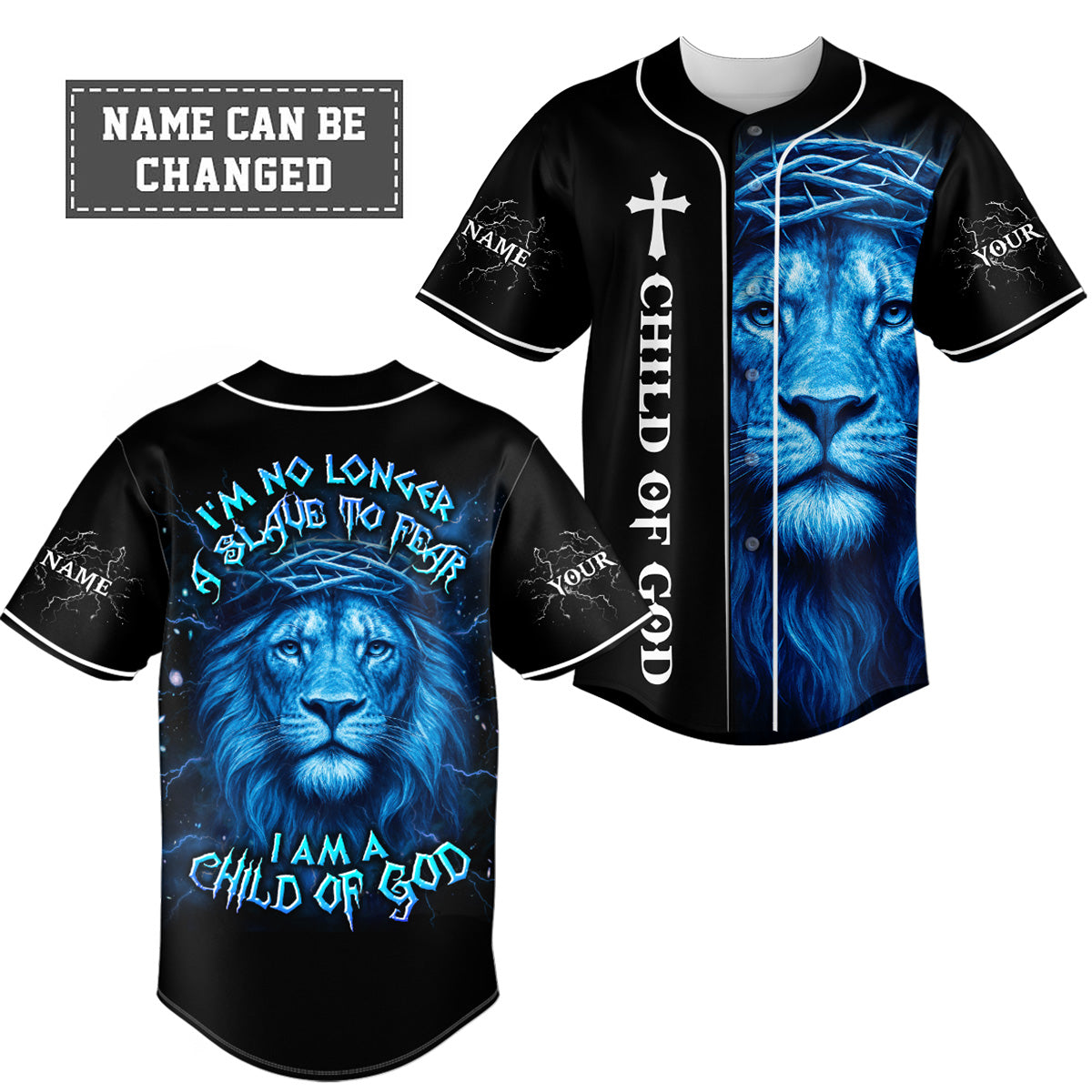 The front reads “Child of God” alongside a radiant cross and full lion artwork. Both sleeves are customizable with your name, making this jersey a powerful personal statement.