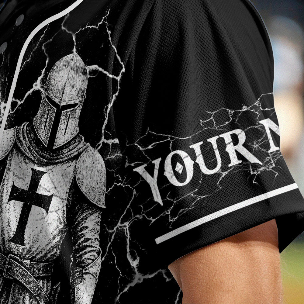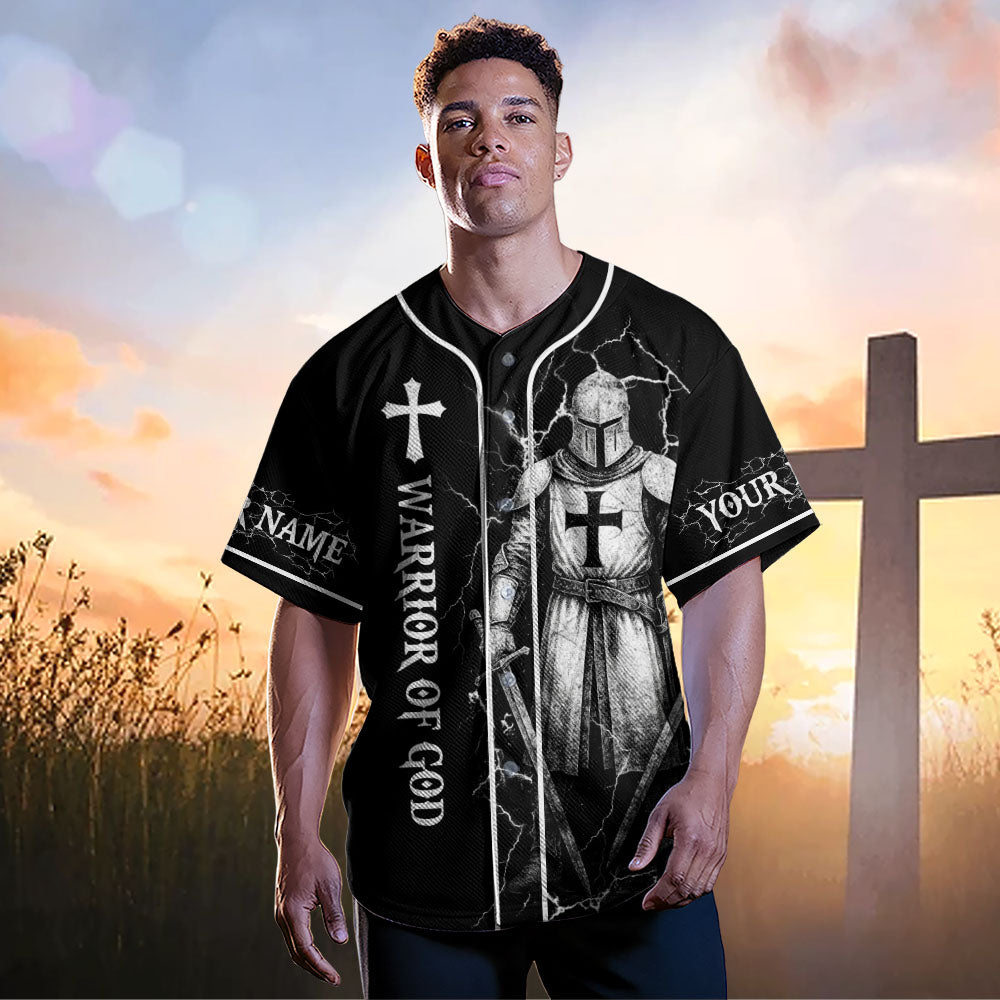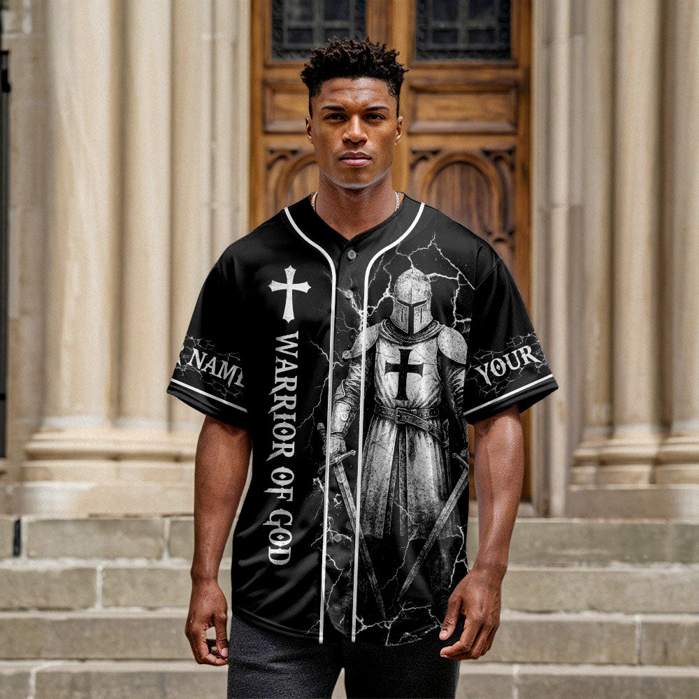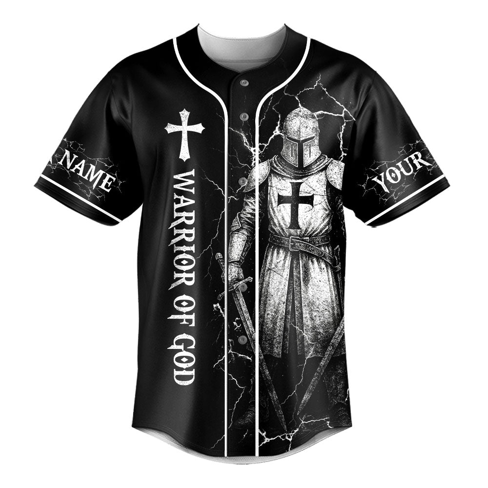 The front showcases “Warrior of God” beside the armor-clad knight and a bold cross. Add your custom name to both sleeves and wear your faith like armor.