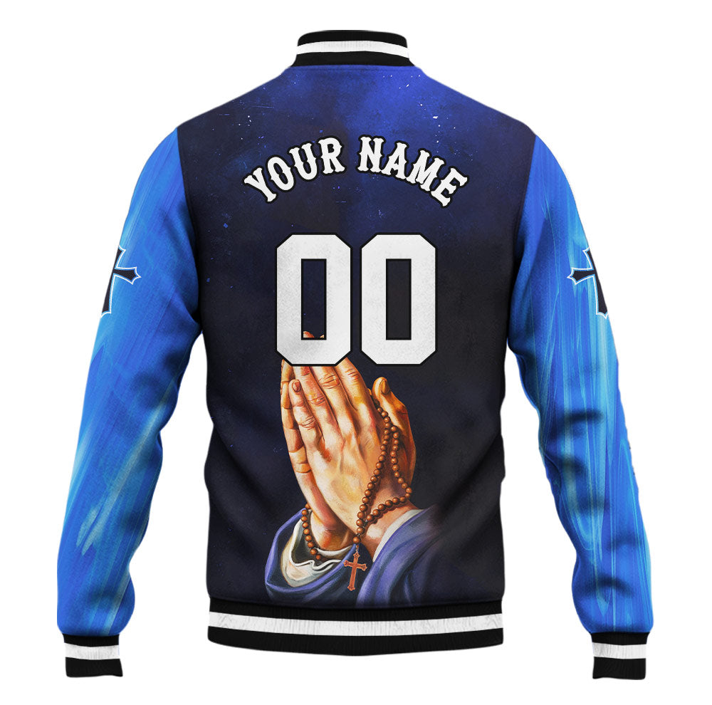 With detailed artwork of praying hands holding a rosary and a rich, starry background, this design symbolizes trust, devotion, and the unstoppable power of faith.
