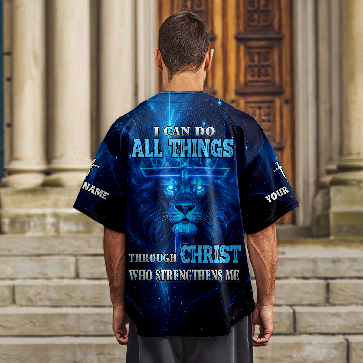 Step into strength and confidence with the “I Can Do All Things Through Christ Who Strengthens Me” Custom Baseball Jersey — inspired by Philippians 4:13 and designed for men of unshakable faith. This bold jersey features a majestic glowing lion, a radiant cross, and a stunning night-sky backdrop that captures the power of divine strength.