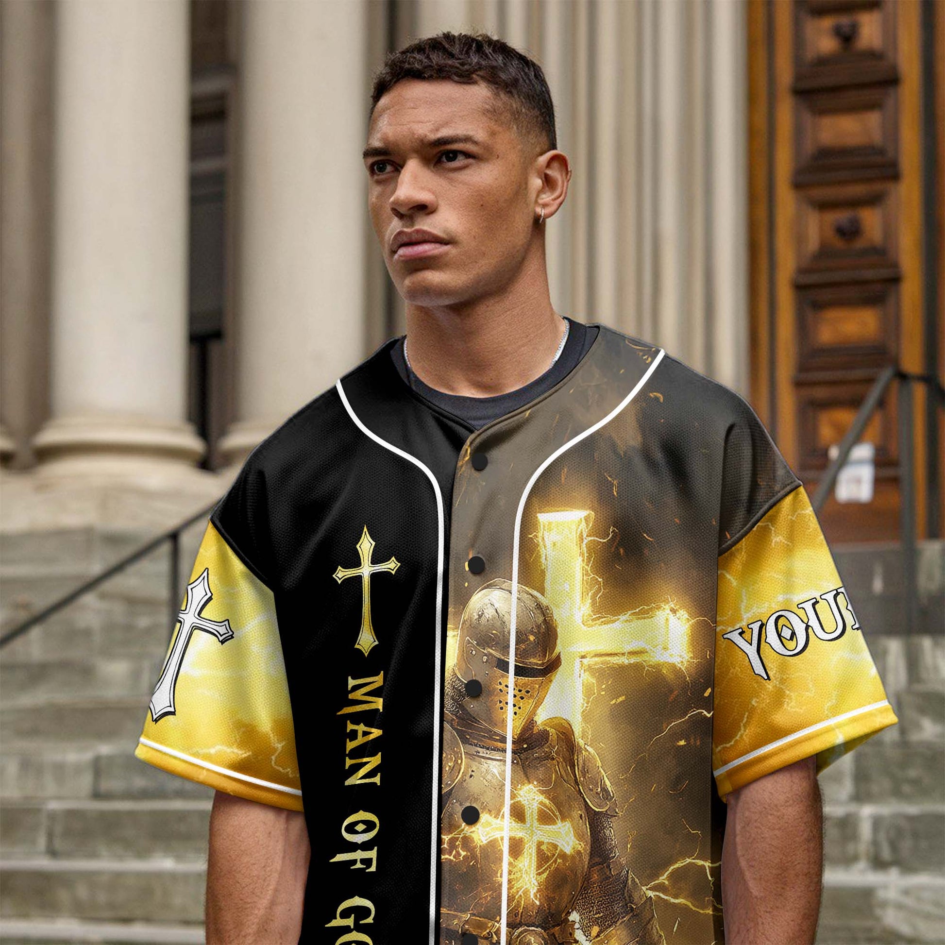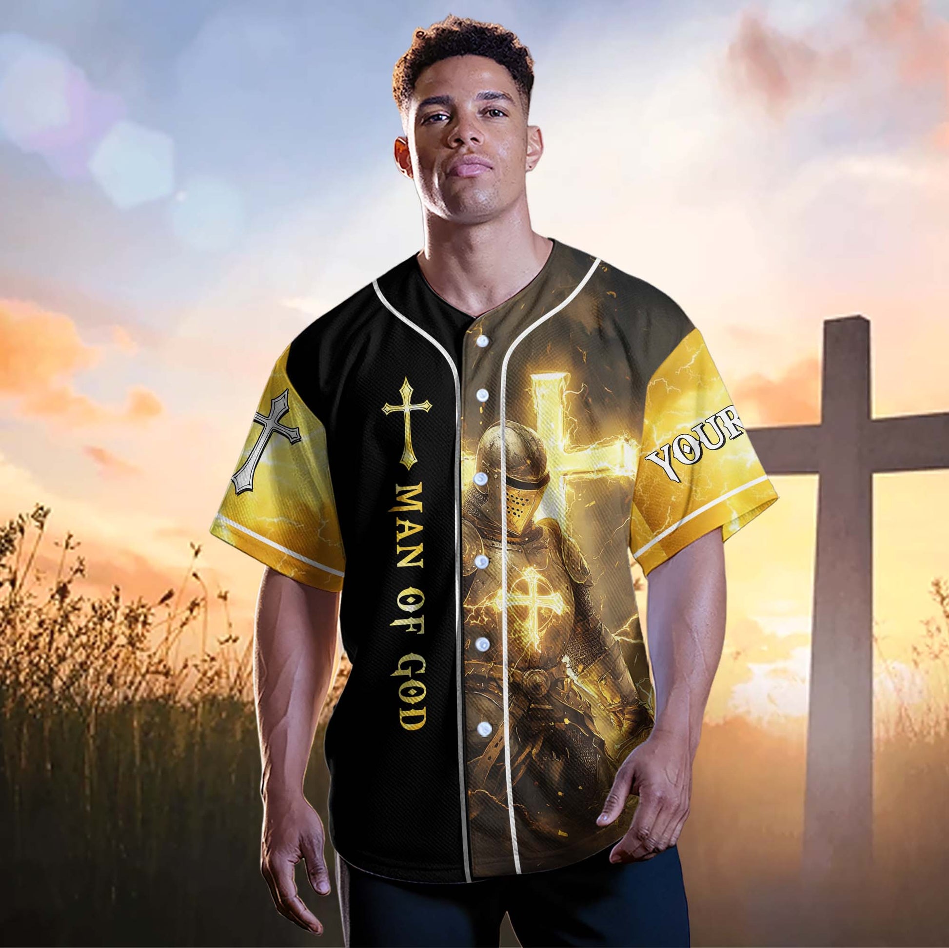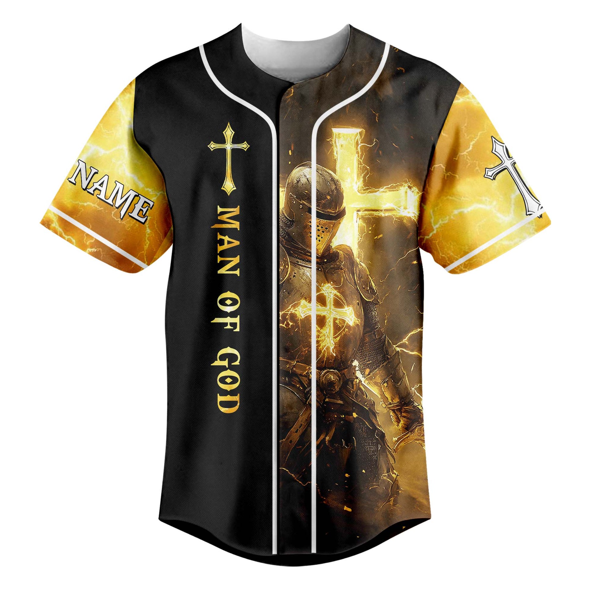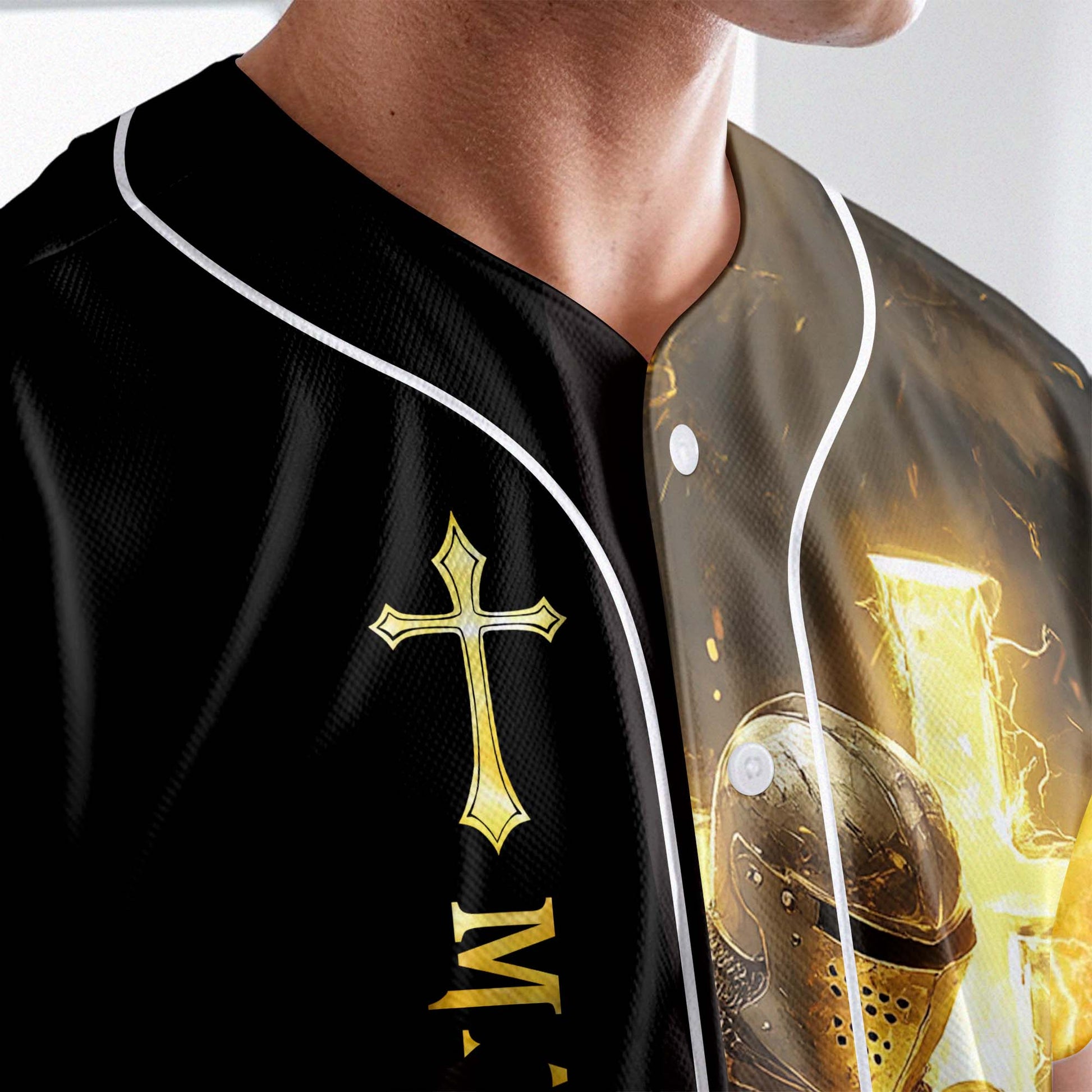 Featuring a bold design of a fully armored knight glowing with divine light, this jersey declares the truth that gives you strength: