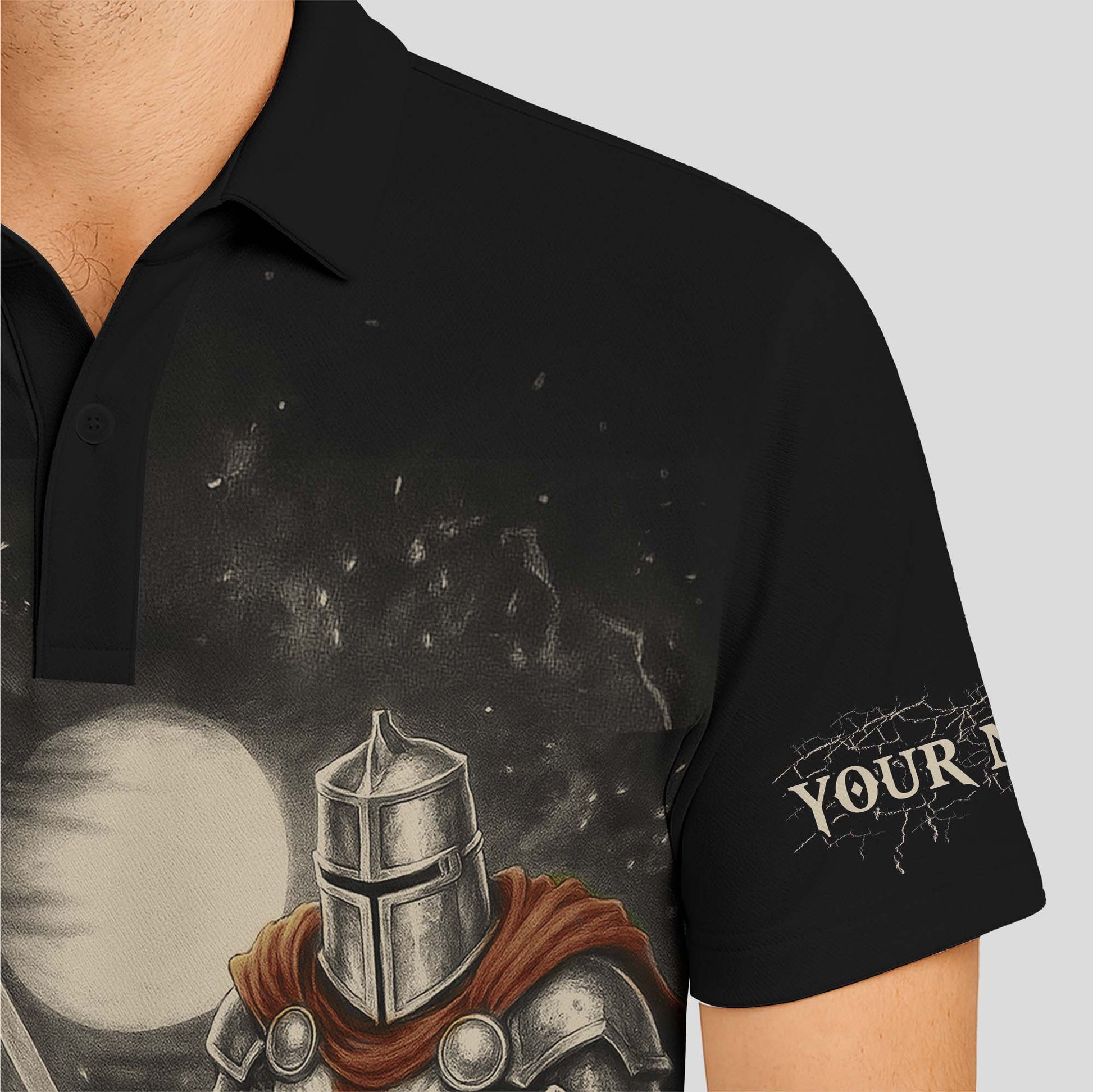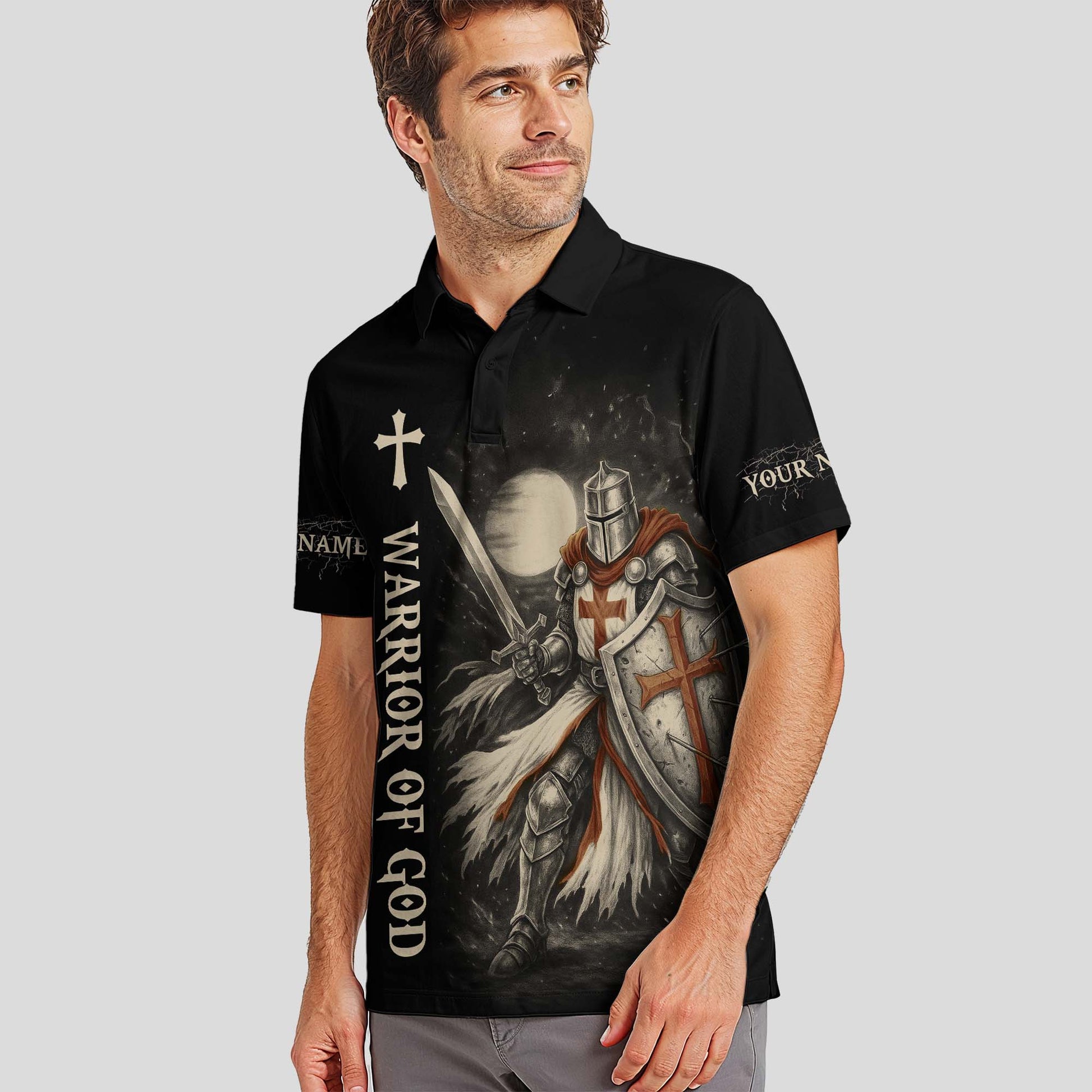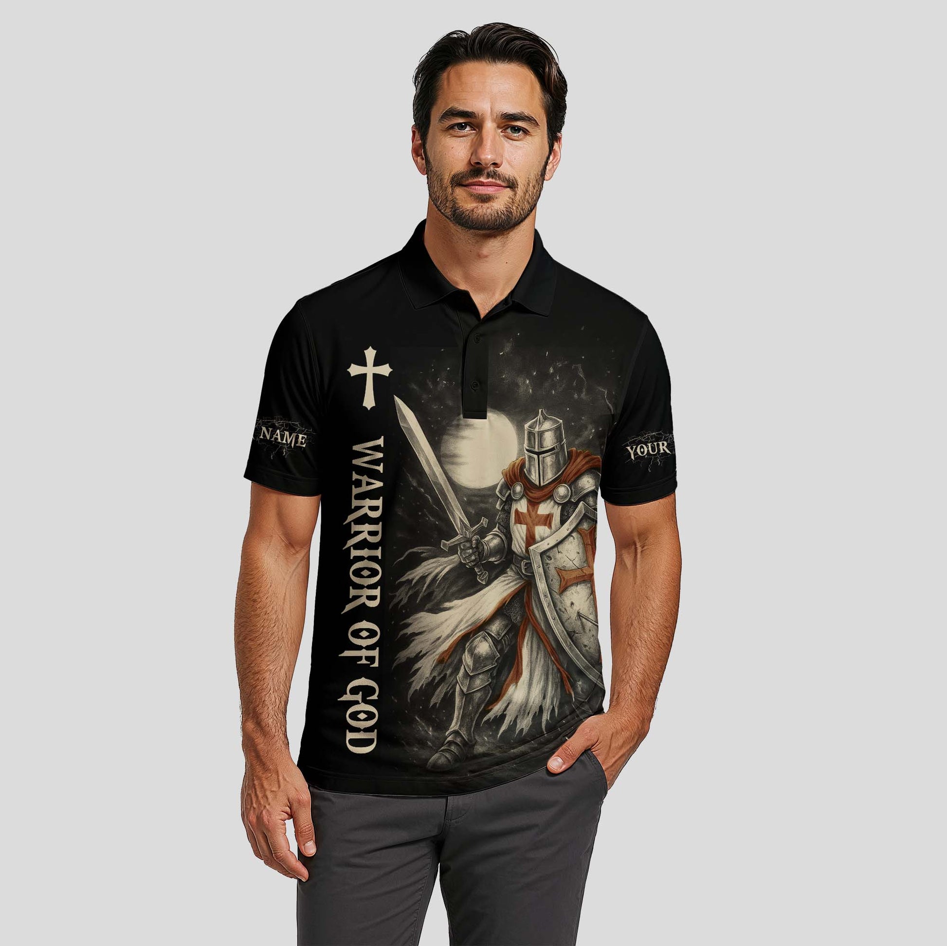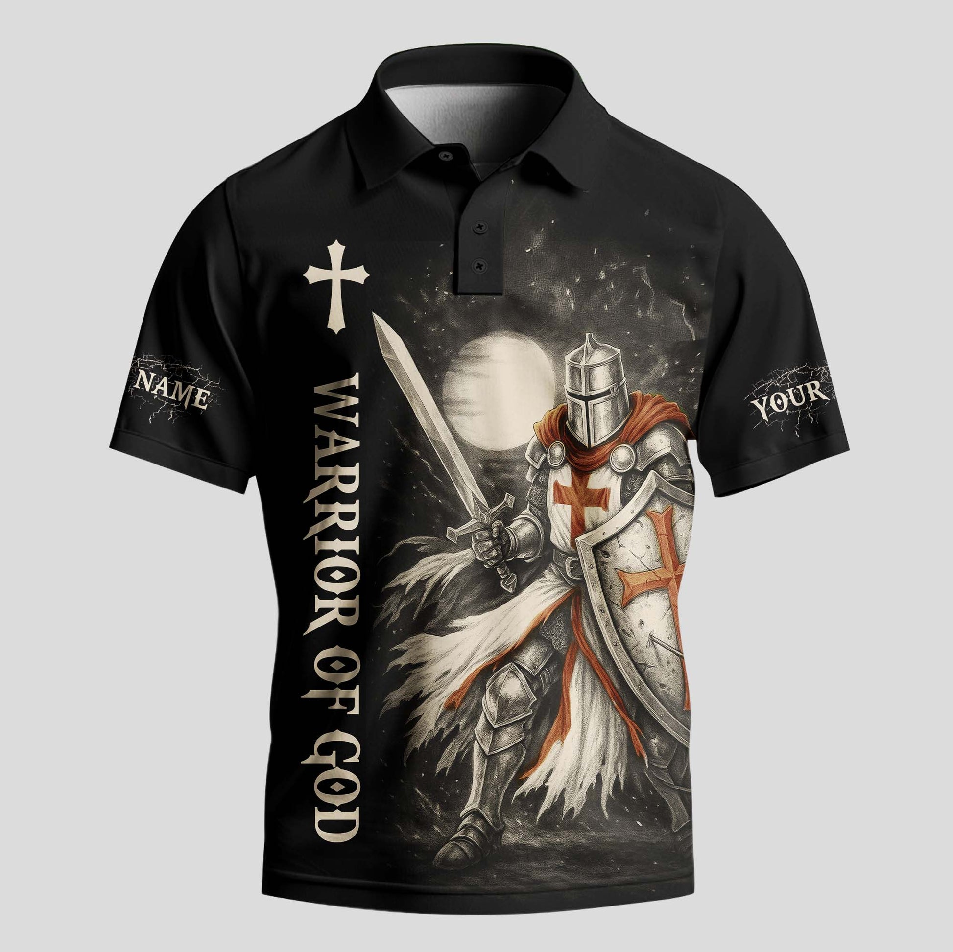 This striking design features a battle-ready knight in armor, standing firm under the moonlight with a sword and shield marked by the cross. The front boldly reads “Warrior of God”, while the back delivers an empowering message: