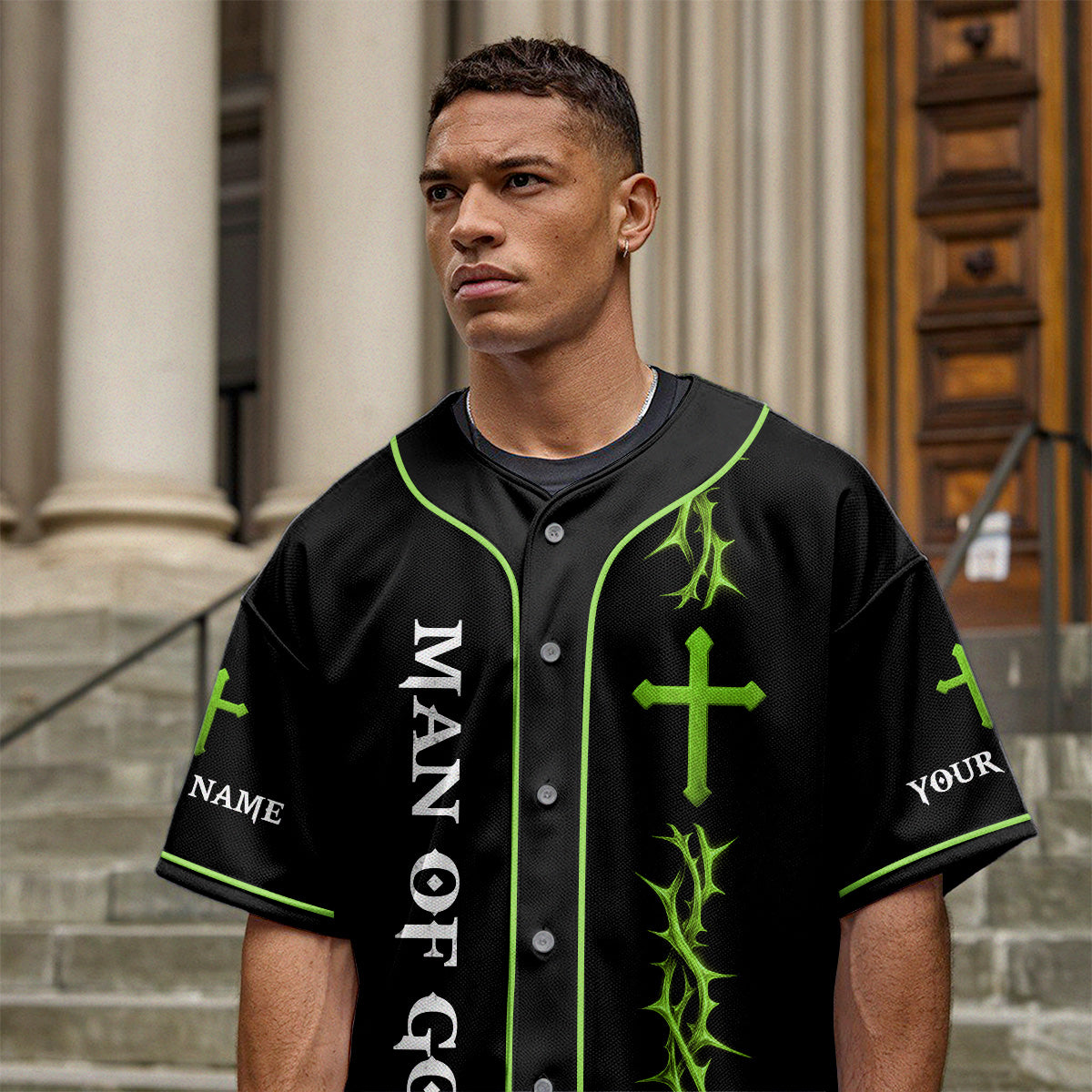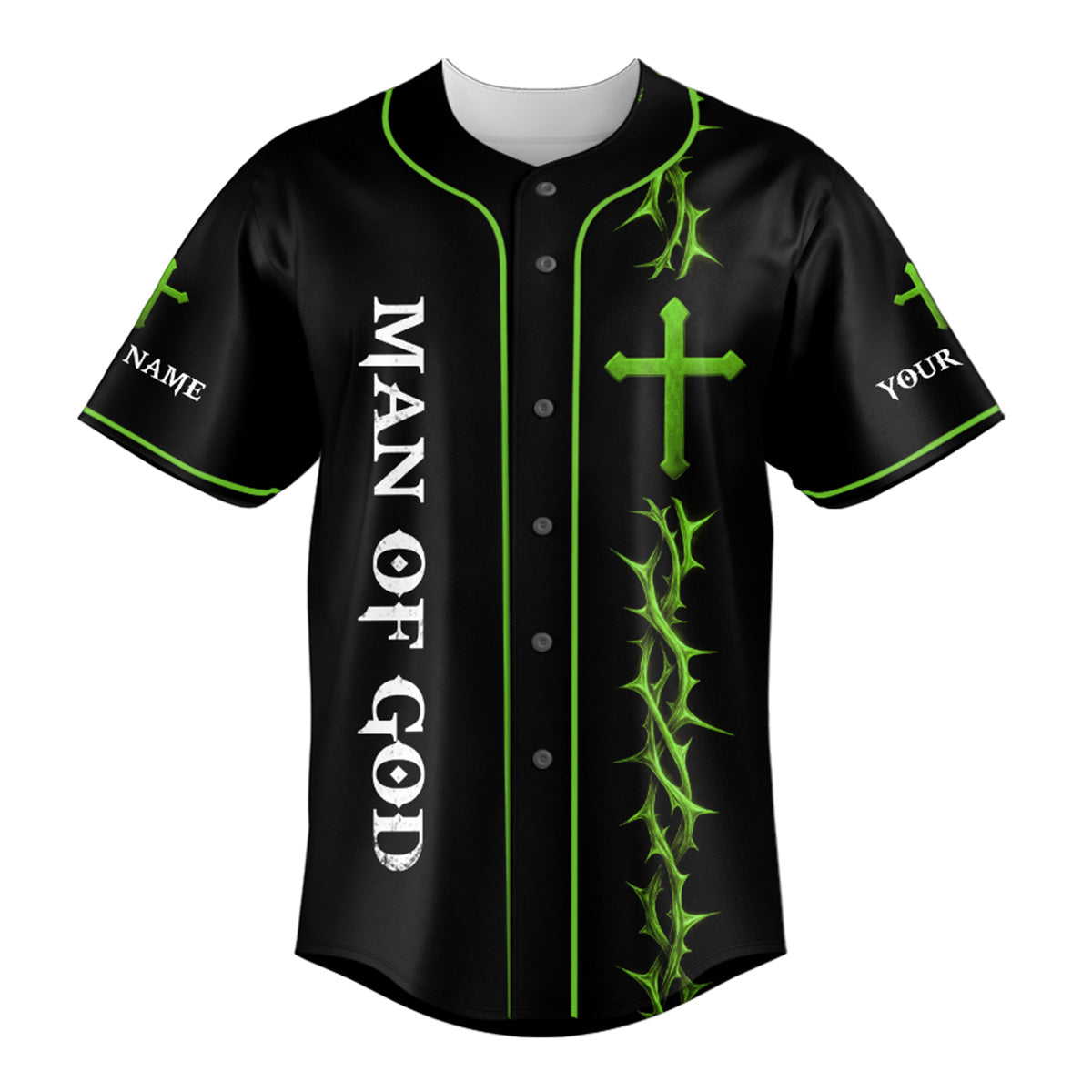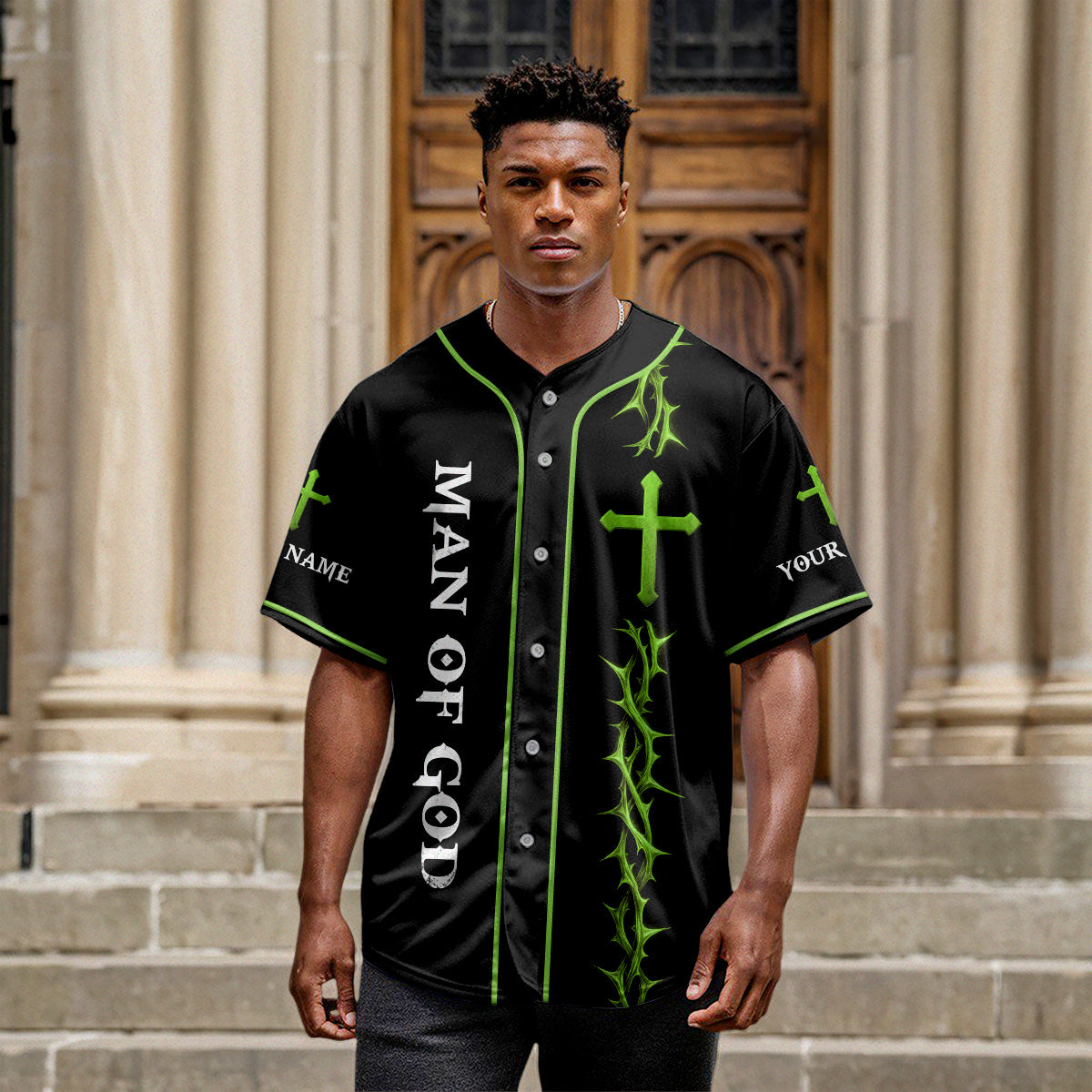 On the front, the words “Man of God” and a glowing green cross complete this fearless look of faith.