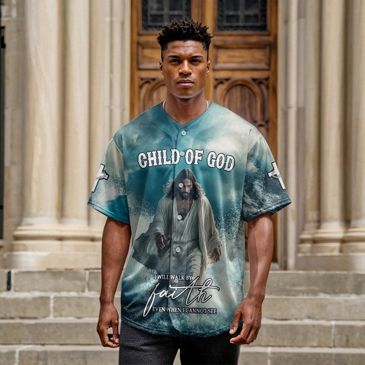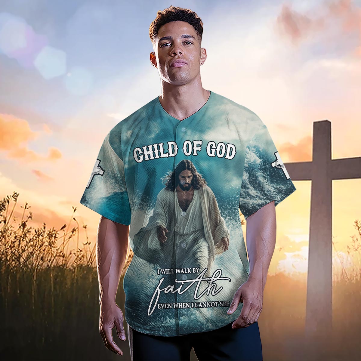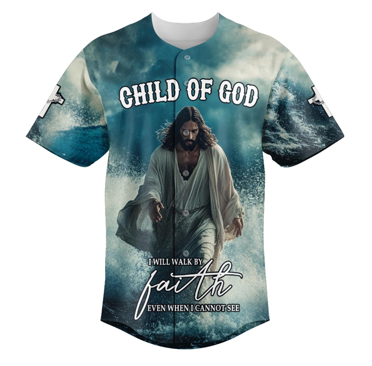 Walk in faith with this inspiring "I Will Walk by Faith Even When I Cannot See" baseball jersey. The design beautifully portrays Jesus walking on the water, a powerful symbol of faith in the midst of uncertainty. With the bold "Child of God" message across the top, this jersey reminds you of your identity as a child of God, called to walk by faith, even when the path ahead is unclear.