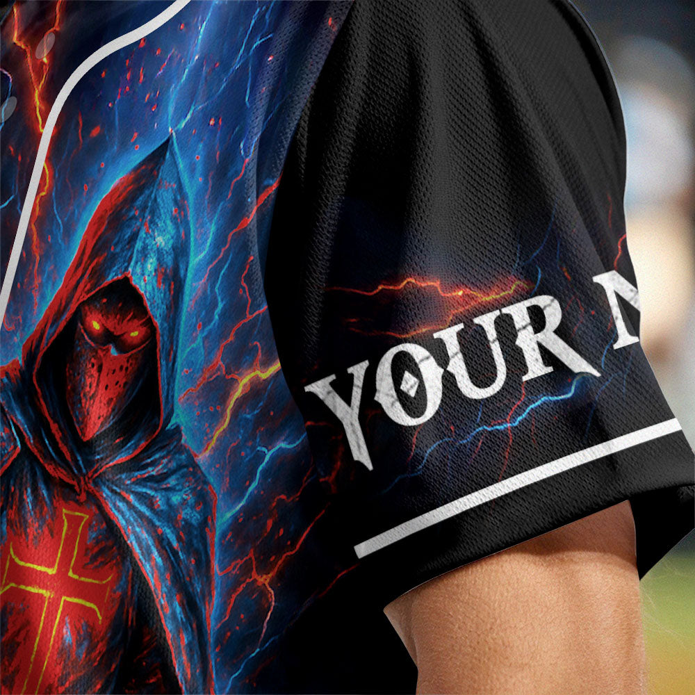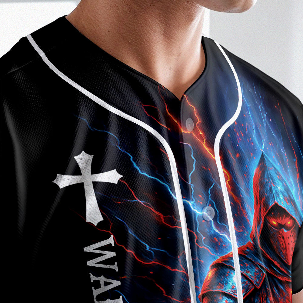 This powerful design features a cloaked warrior holding a blazing red sword, with lightning flashing behind him and a glowing cross on his chest — symbolizing spiritual fire and loyalty to Christ. The back proclaims: