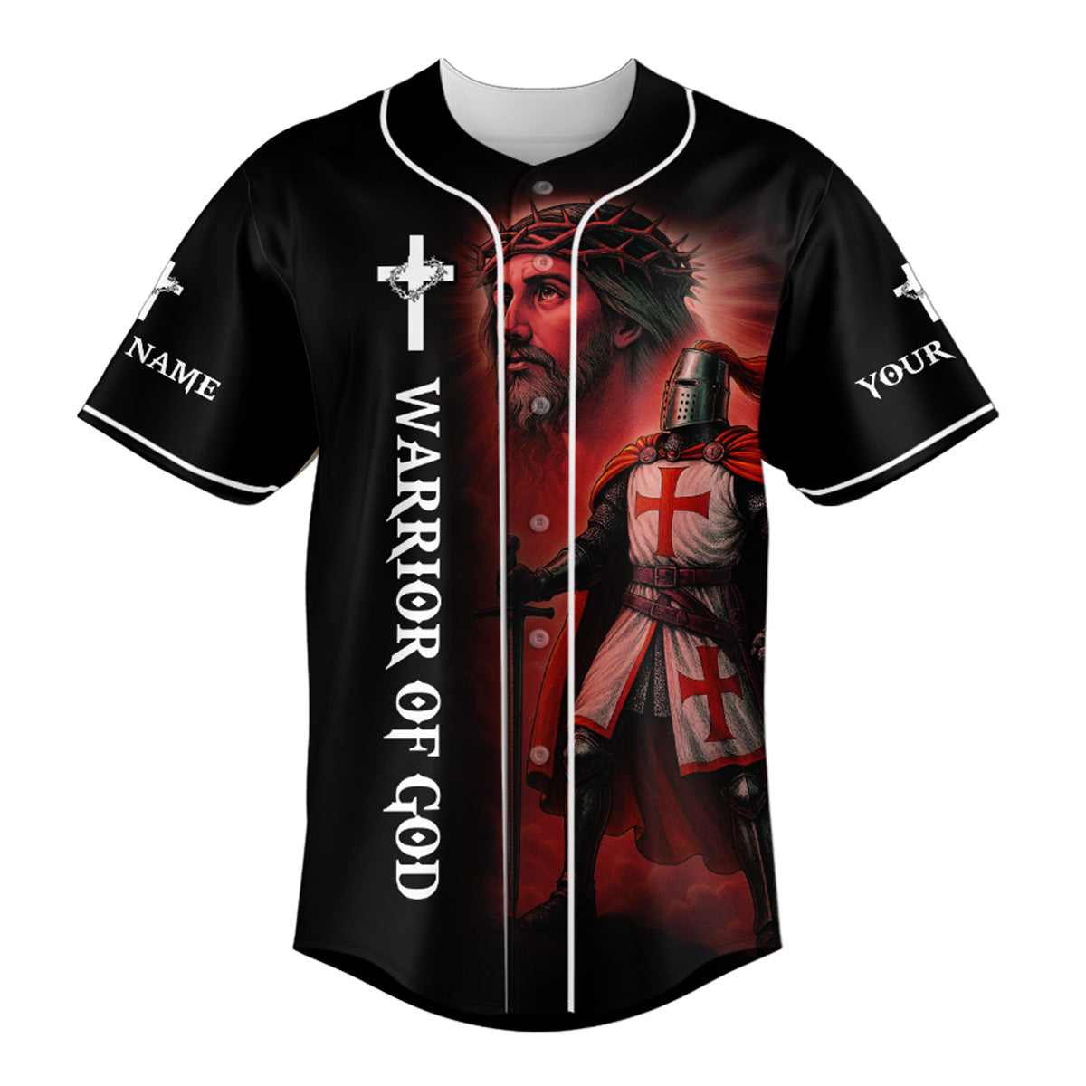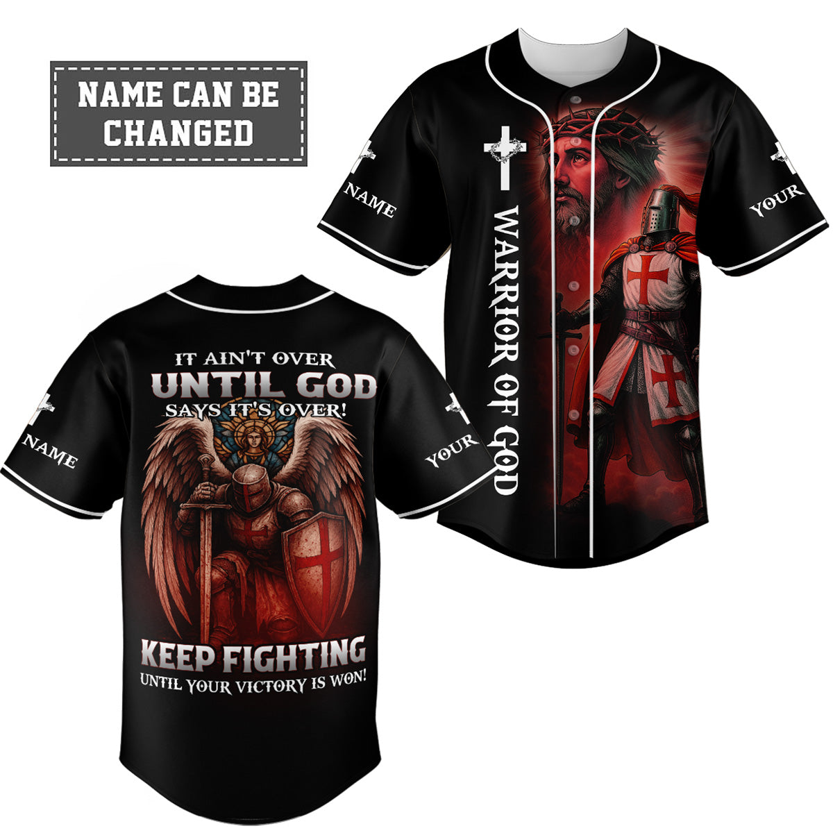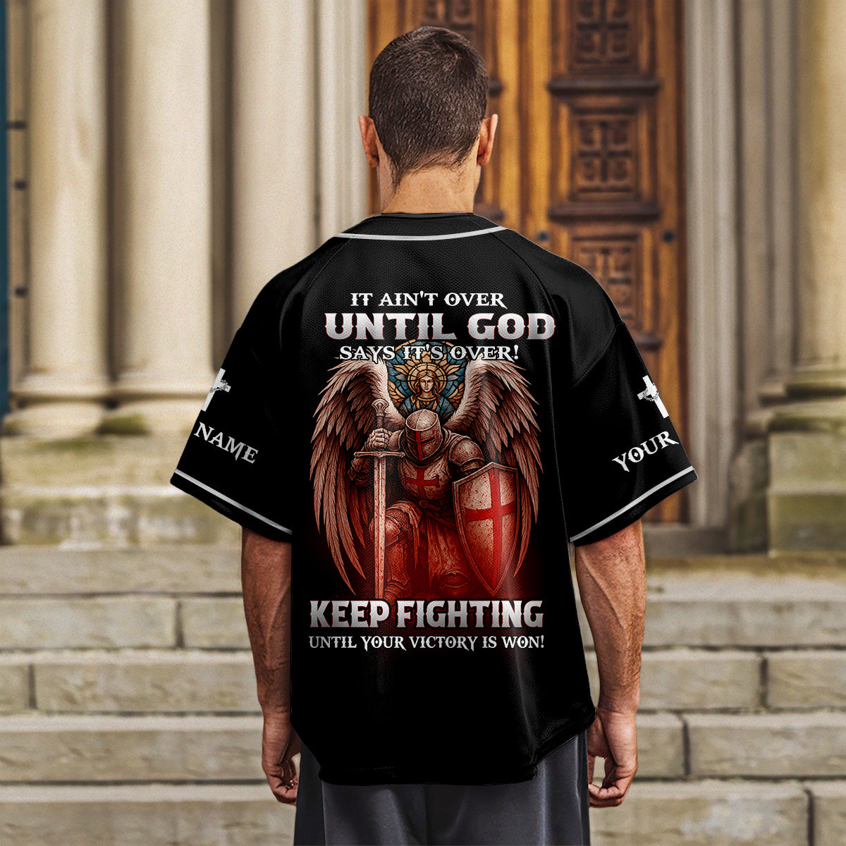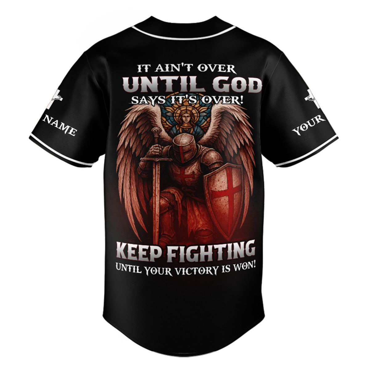 Stand firm and fight with faith in the It Ain’t Over Until God Says It’s Over Custom Name Baseball Jersey — a bold declaration of victory through God’s timing and power. Featuring a dramatic warrior angel kneeling with a shield and sword on the back, and a Crusader knight with Jesus on the front, this jersey is designed for spiritual warriors who never back down.